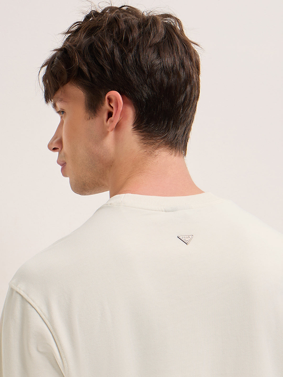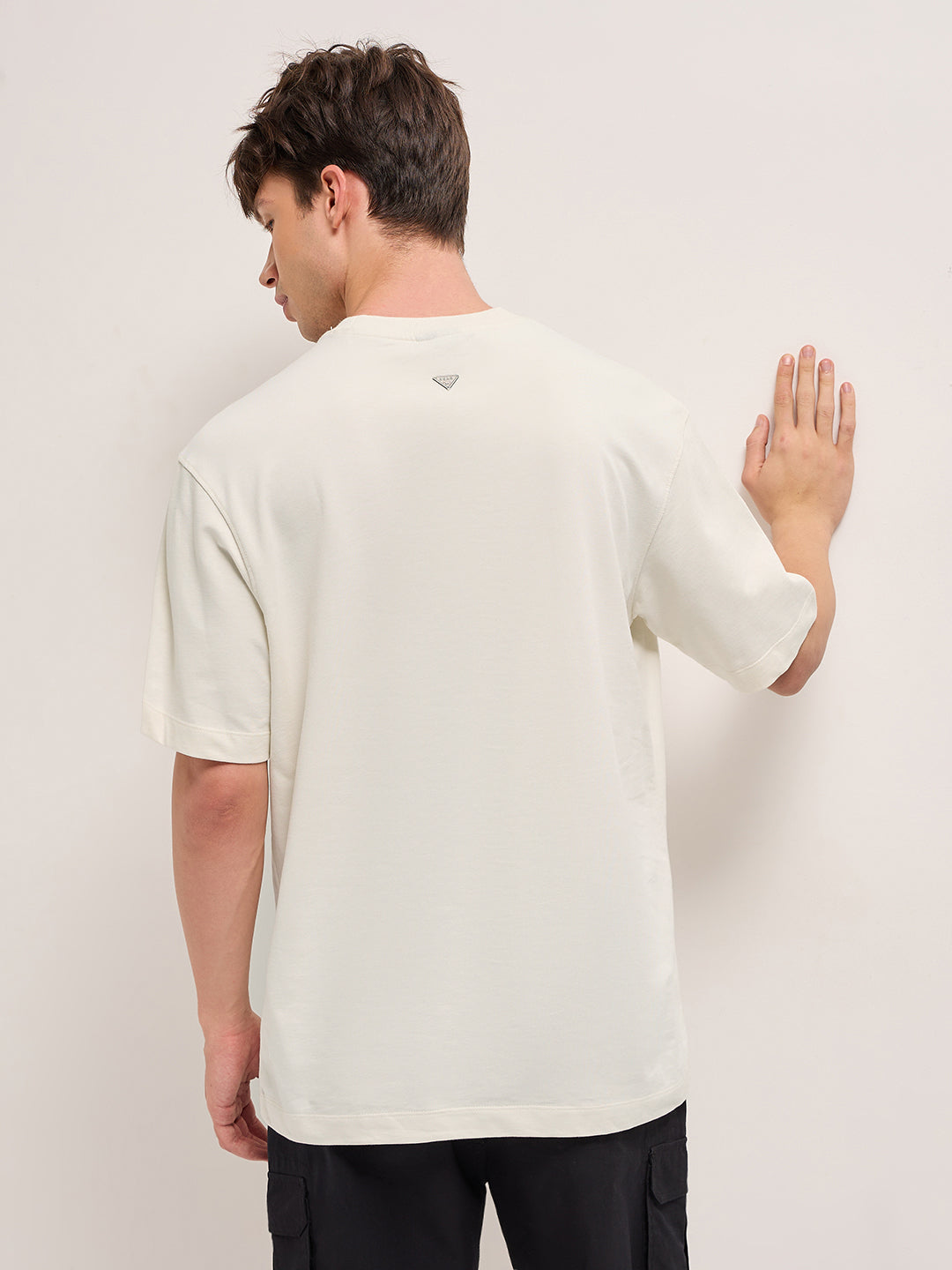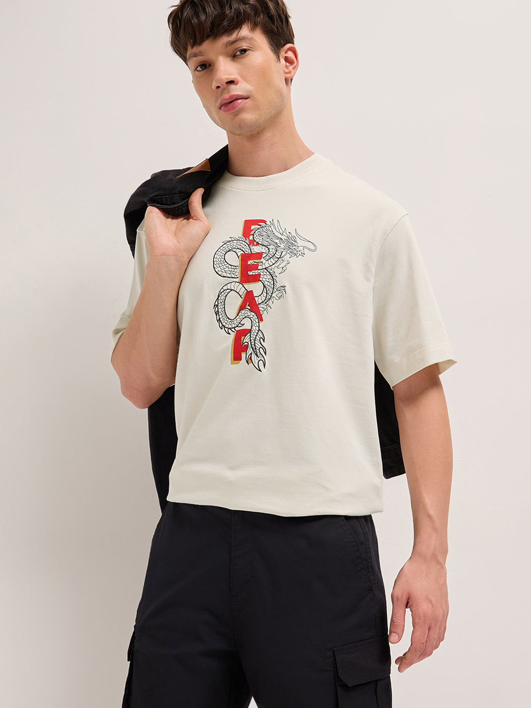 Shop Cream Oversized Crew Neck T-Shirt with Embroidered Dragon and “FEAR” Text Graphic Online