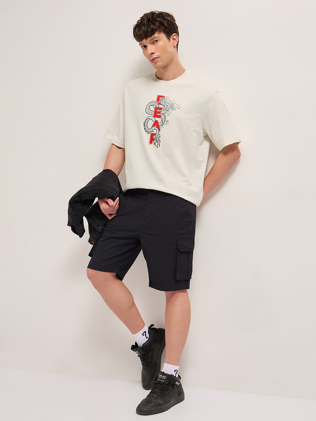 Cream Oversized Crew Neck T-Shirt with Embroidered Dragon and “FEAR” Text Graphic