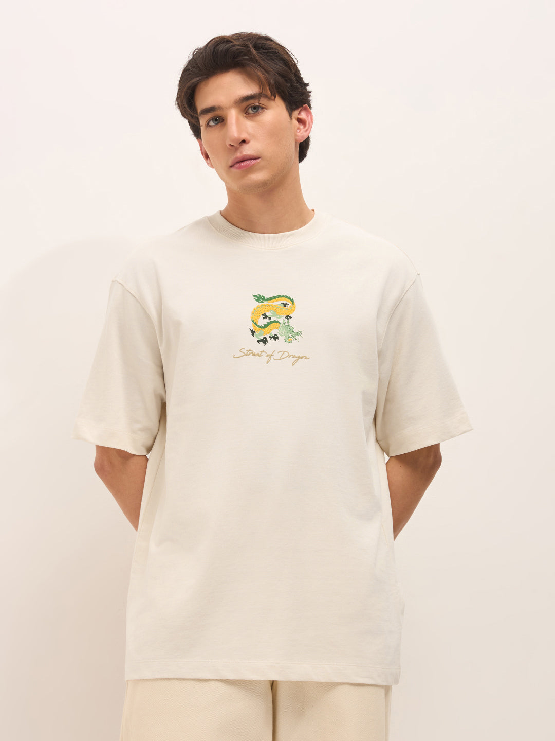 Cream Crew Neck Graphic Print T-Shirt with Dragon Illustration on Back