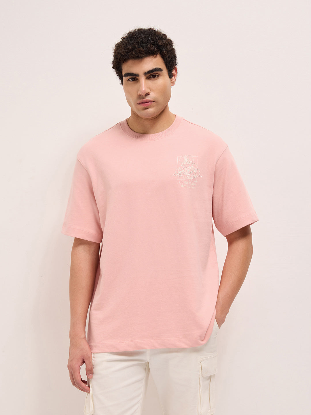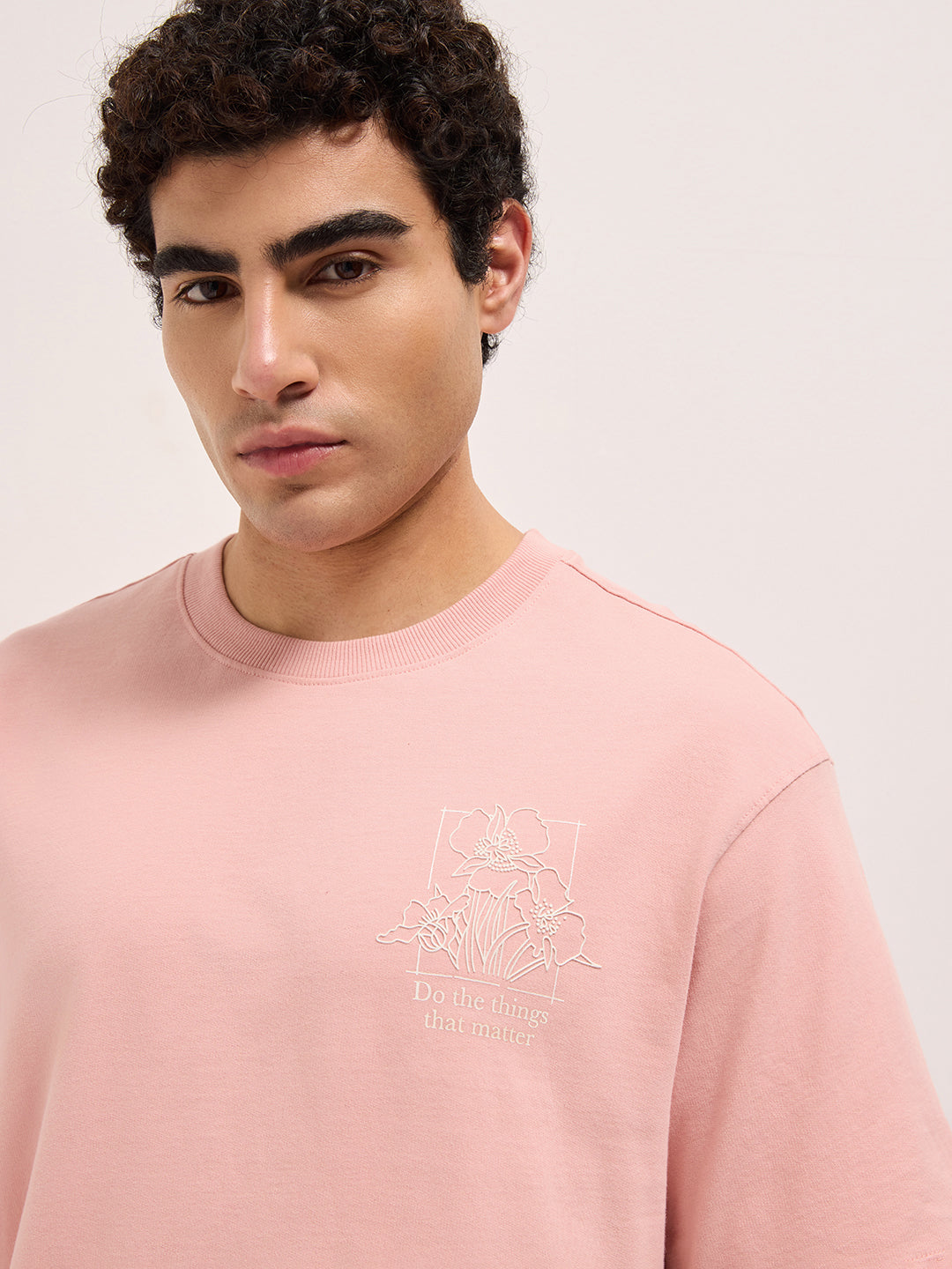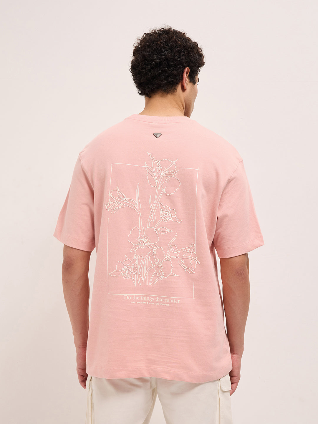 Pink Oversized Crew Neck T-Shirt with Floral HD Graphic Print