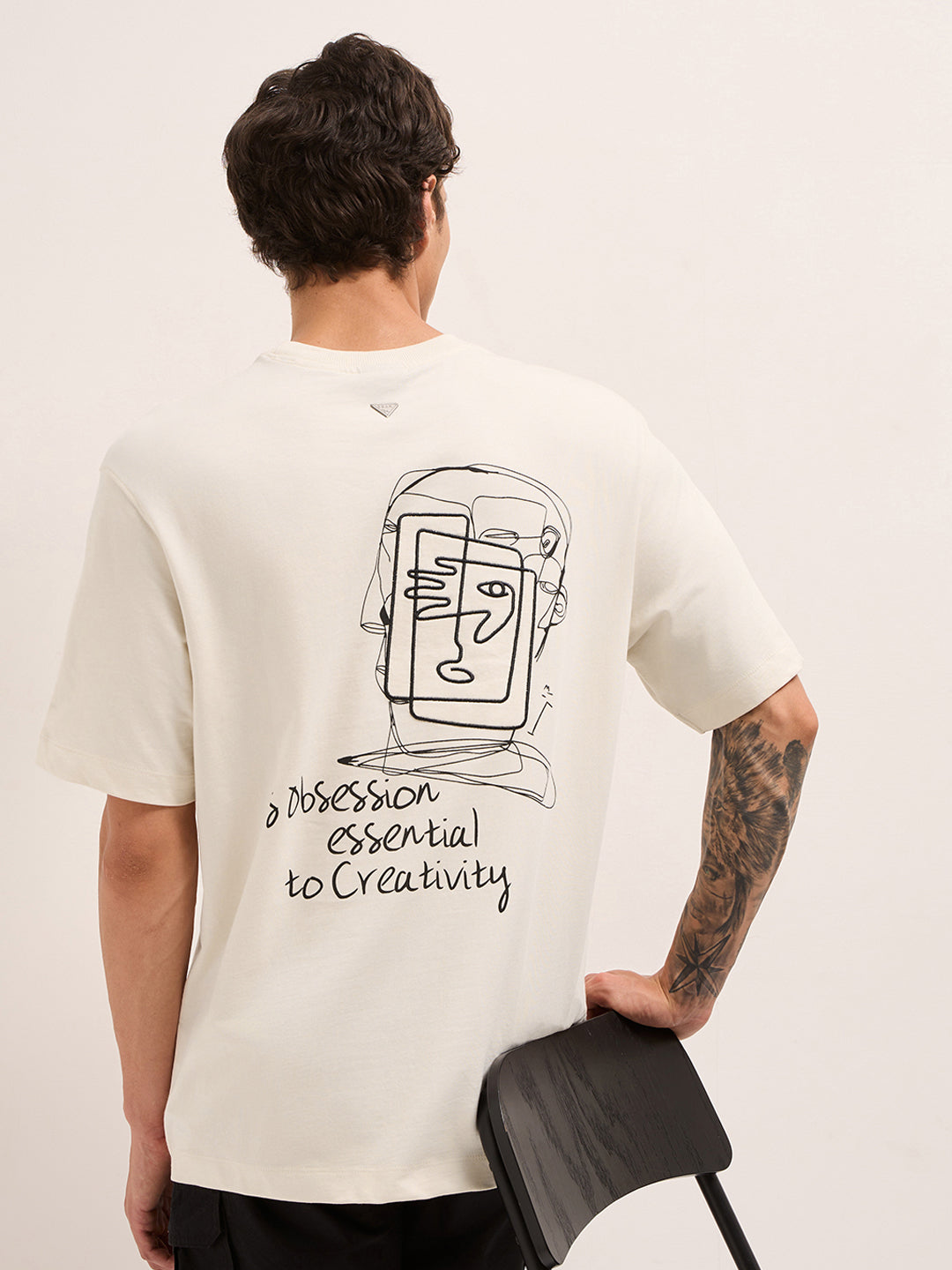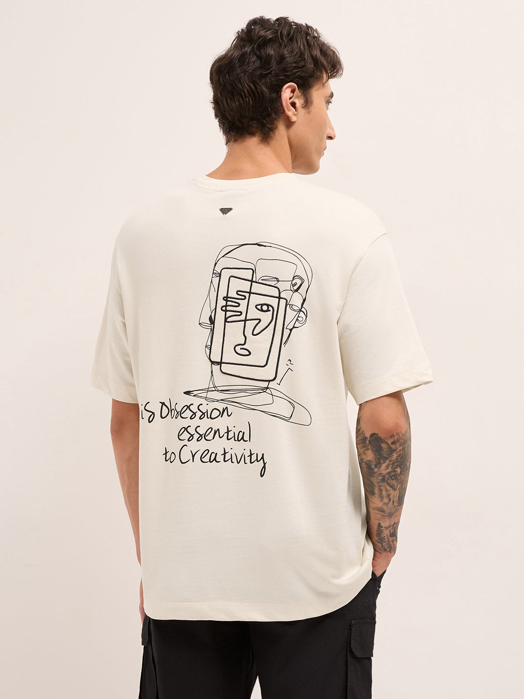 Back Design: Large abstract face line-art with handwritten motivational quote: “A obsession essential to creativity.”