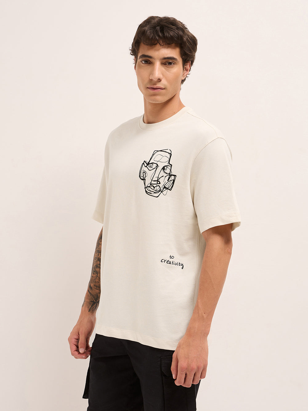 Front Design: Left-chest abstract face line-art with “to creativity” text beneath.