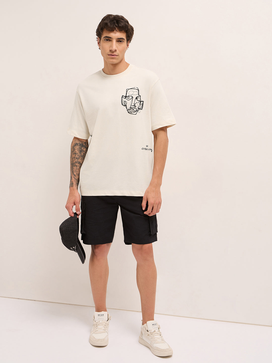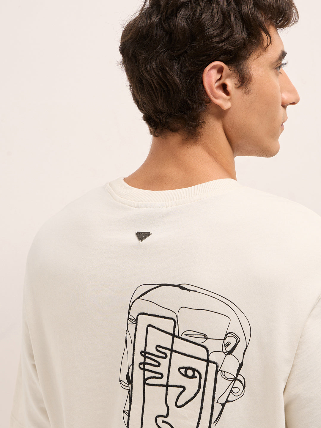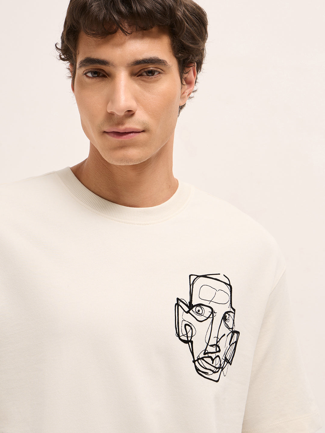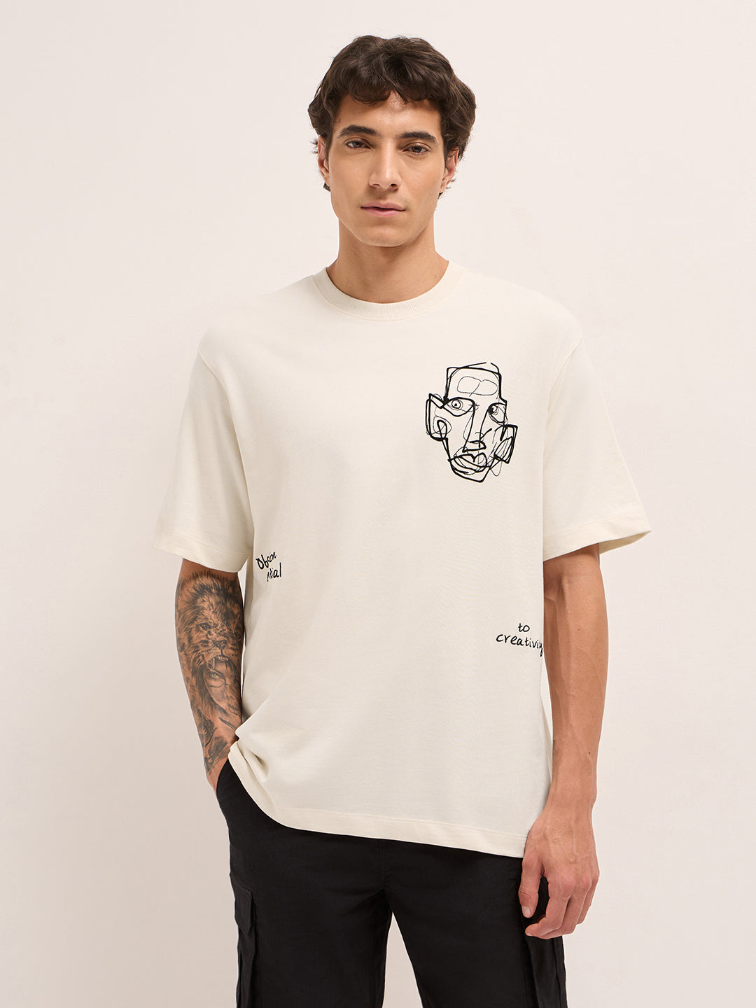 Shop Cream Oversized Crew Neck T-Shirt with Abstract Face Front & Motivational Back Print Online