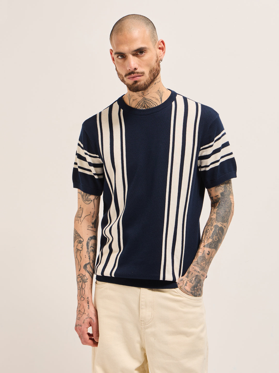 Blue with White Knitted Stripe Regular Fit Crew Neck T-shirt