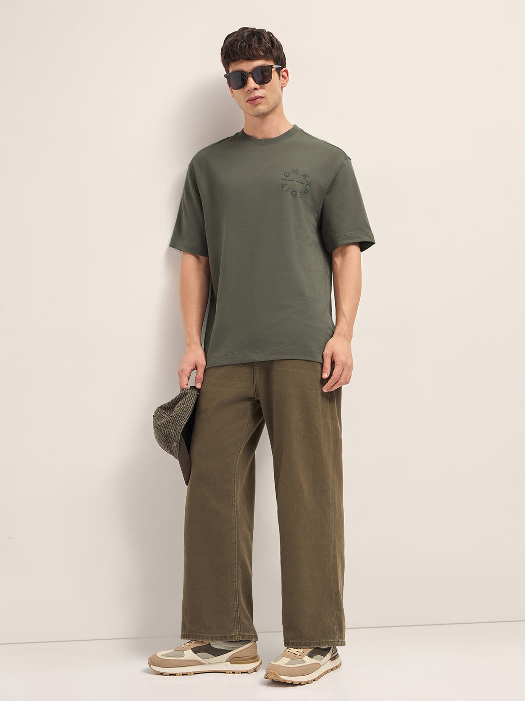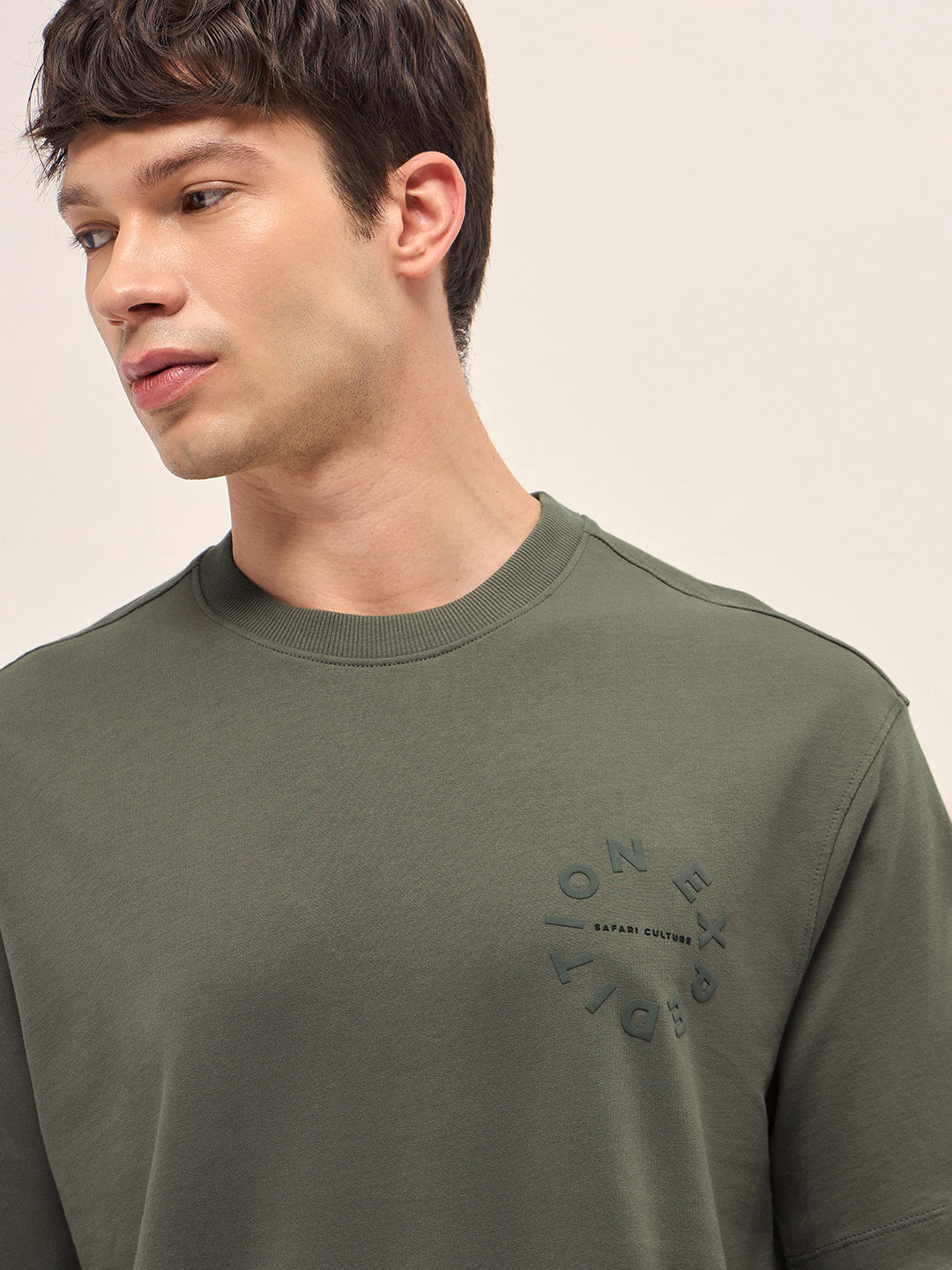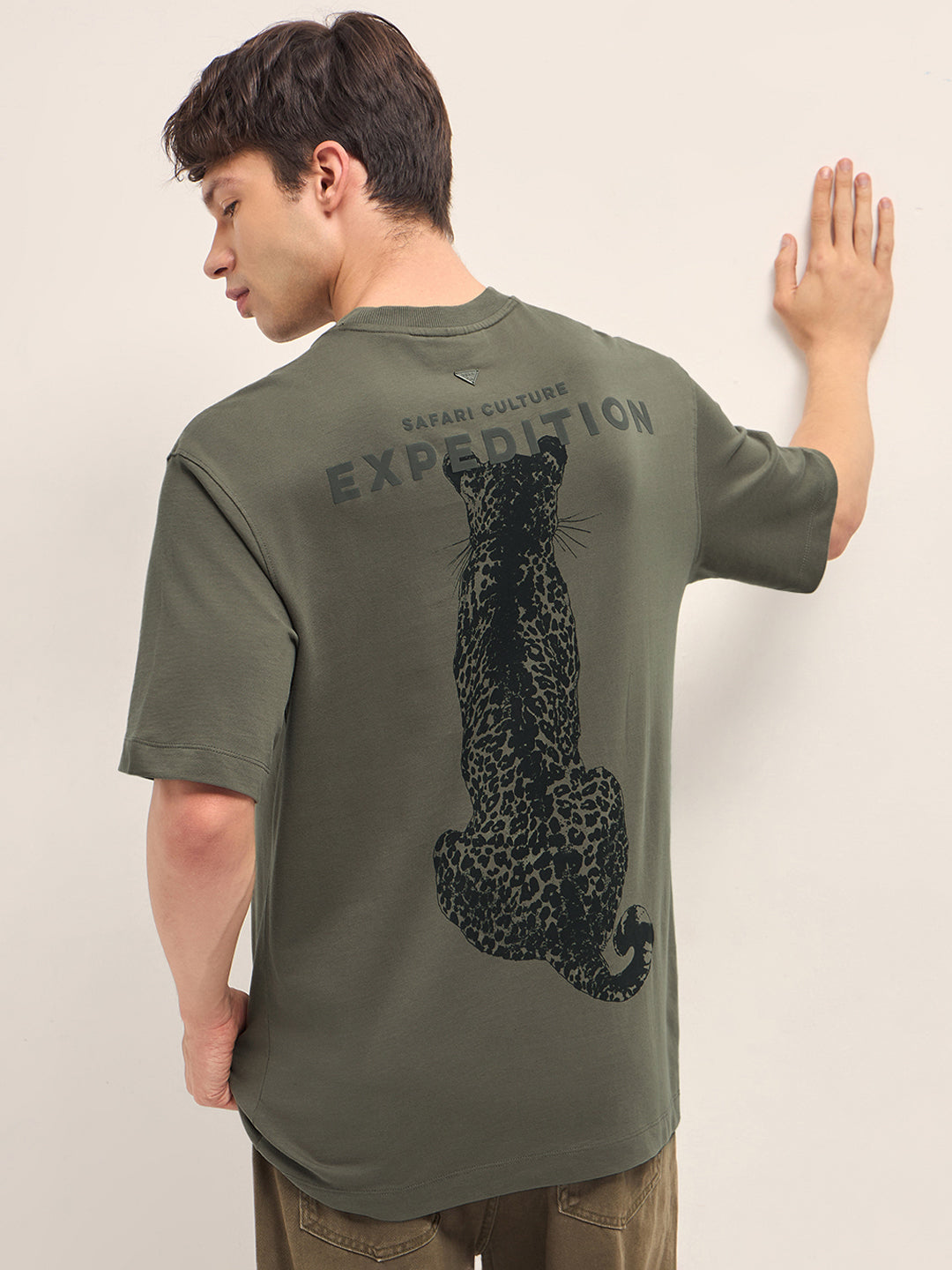 Shop Green Crew Neck Graphic Print T-Shirt with Leopard Illustration on Back Online