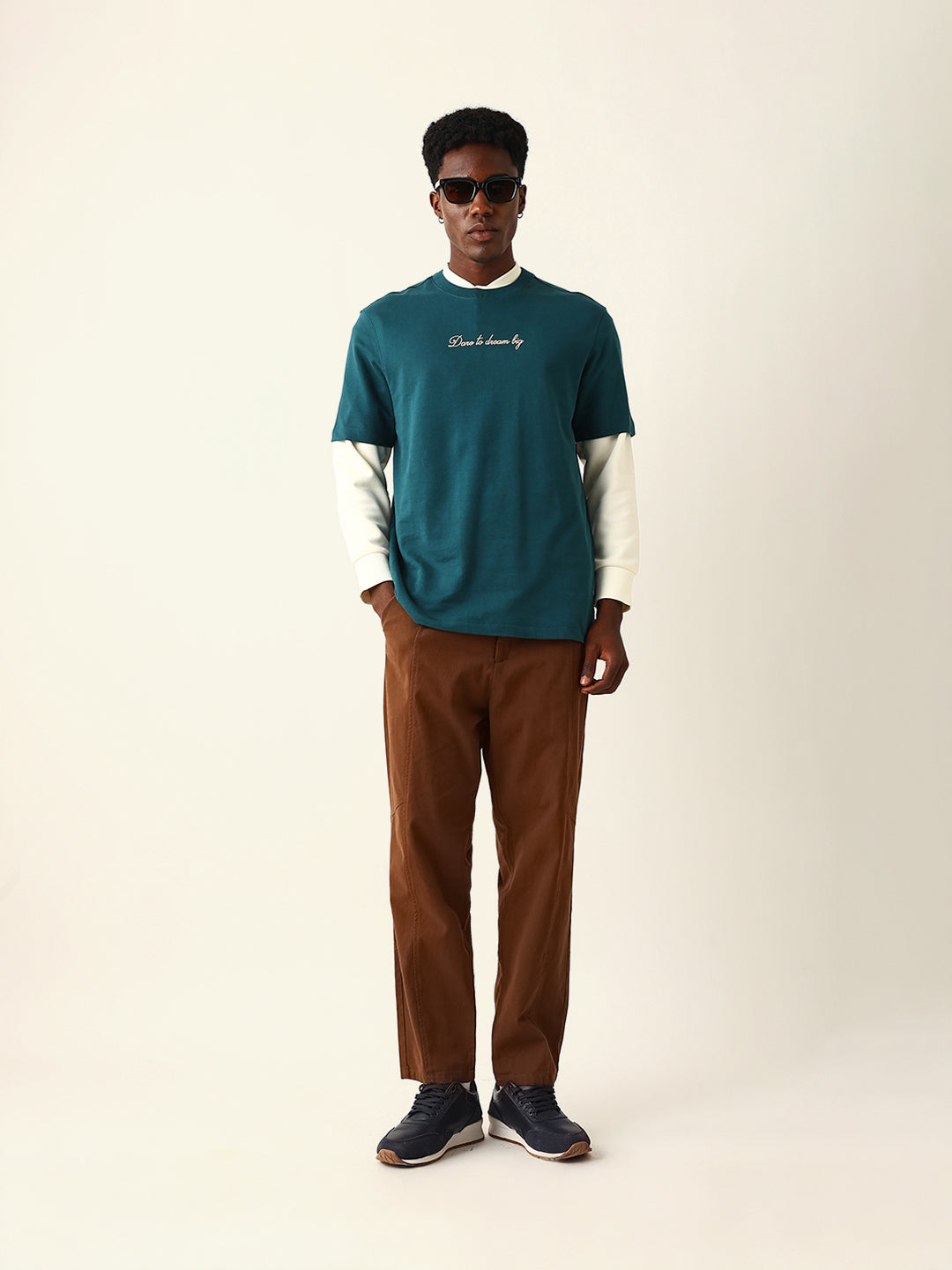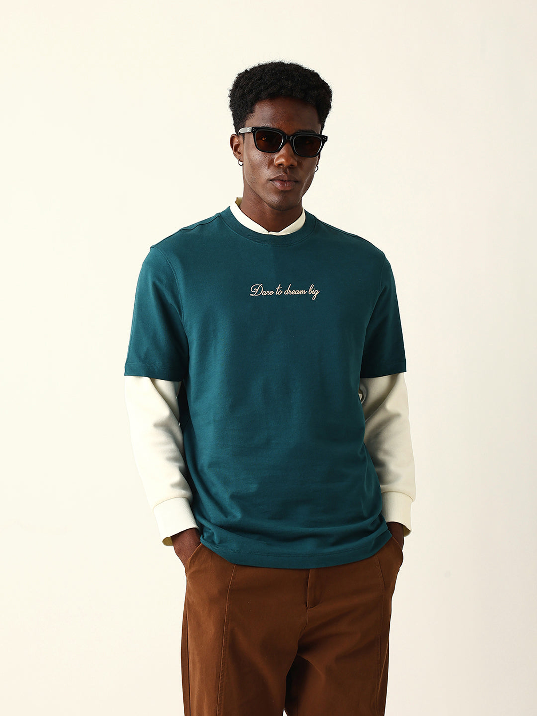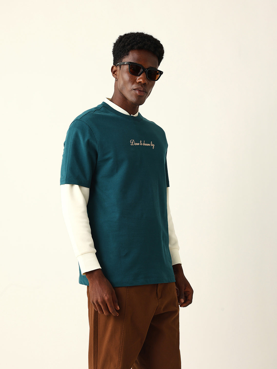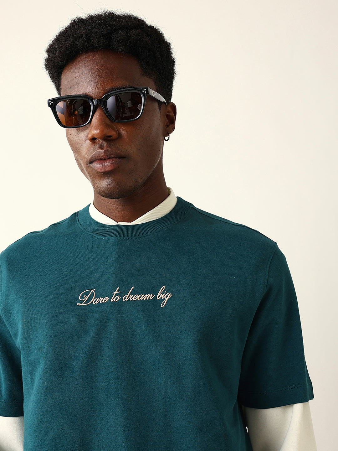 Teal Green Oversized T-Shirt with “Dare to Dream Big” Typography and Floral Graphic Back Print
