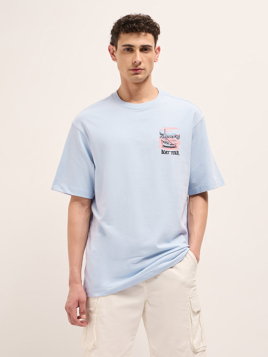 Shop Light Blue Oversized Crew Neck T-Shirt with Back Boat Tour Scenic Graphic Print Online