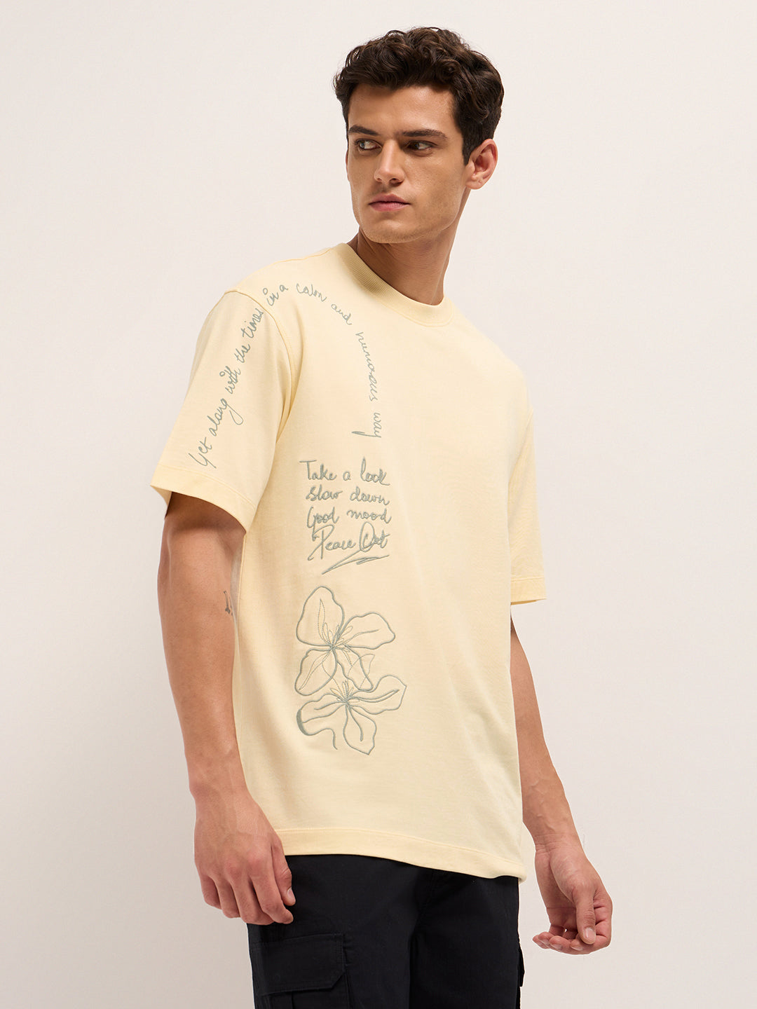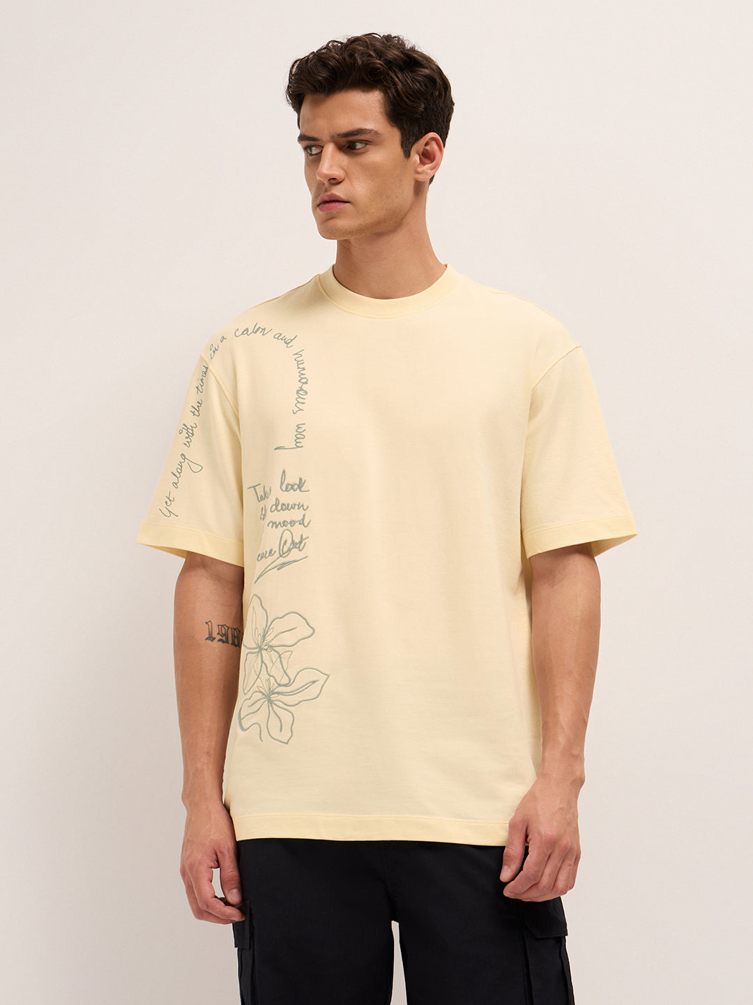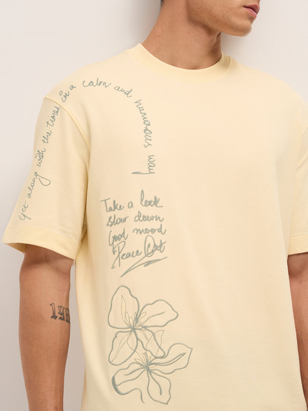 Shop Cream Oversized T-Shirt with Floral Embroidery and Quote Print on Sleeve Online