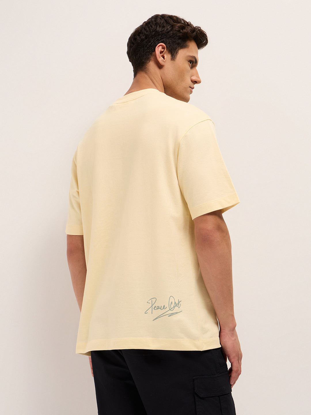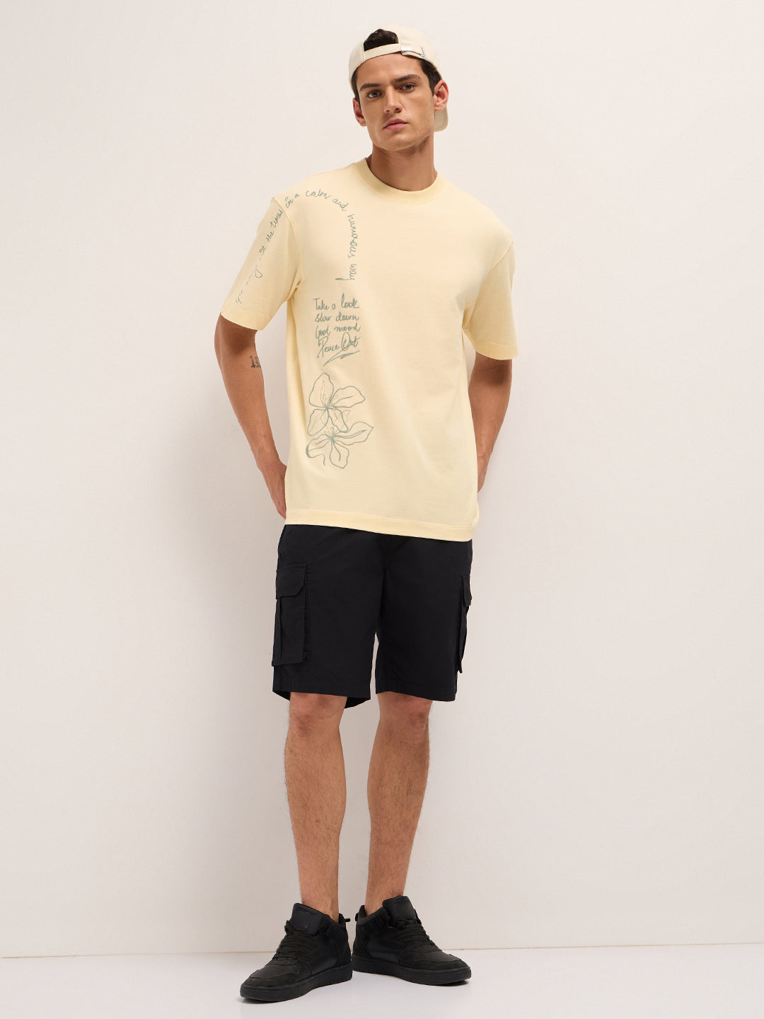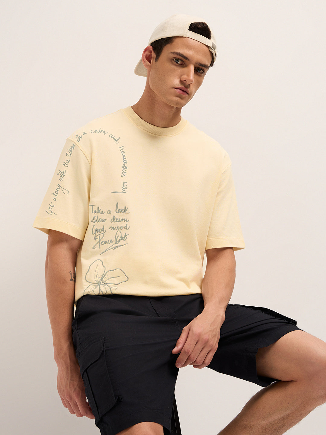 Shop Cream Oversized T-Shirt with Floral Embroidery and Quote Print on Sleeve Online