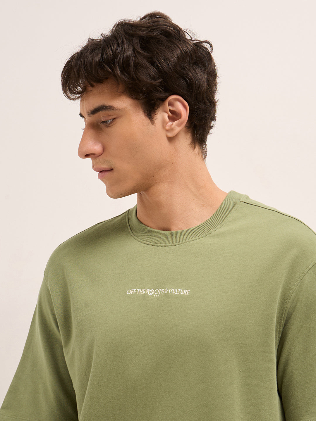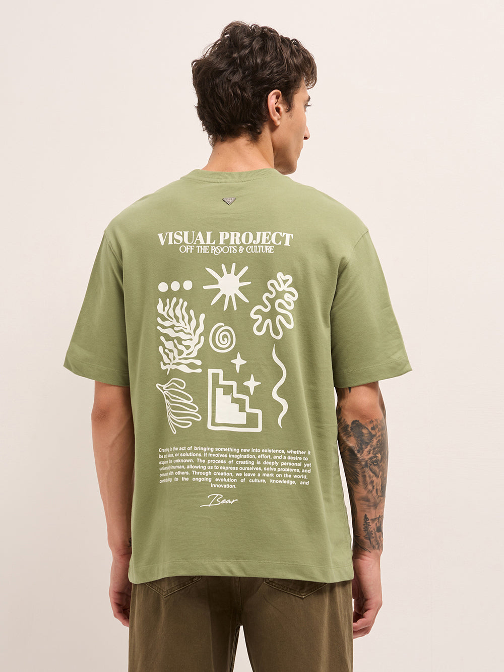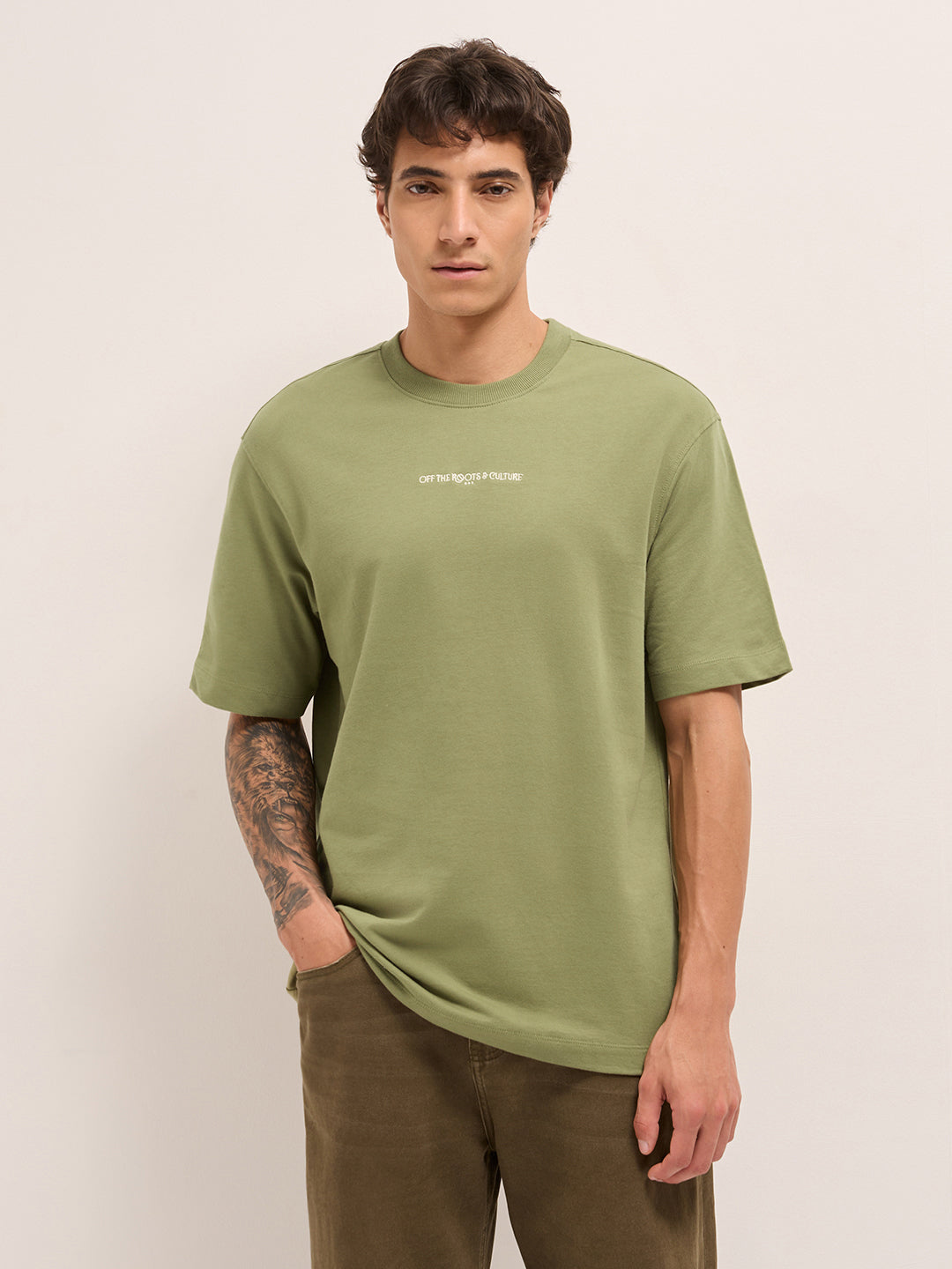 Olive Crew Neck Graphic Print T-Shirt with Abstract "Off the Roots" Illustration on Back