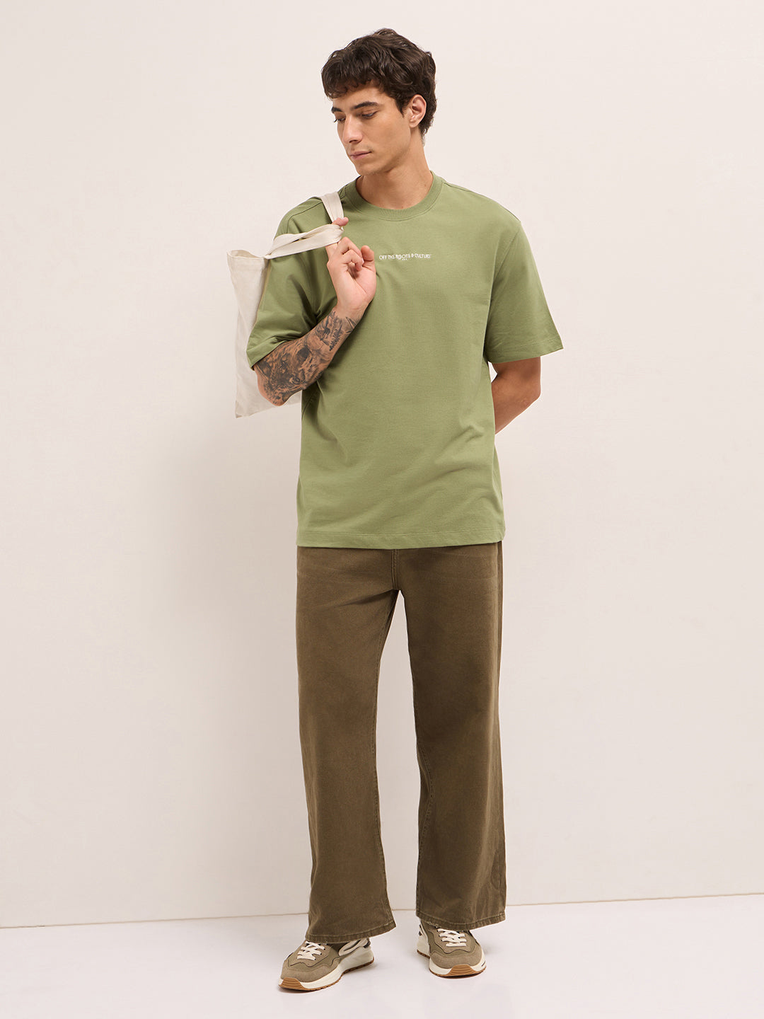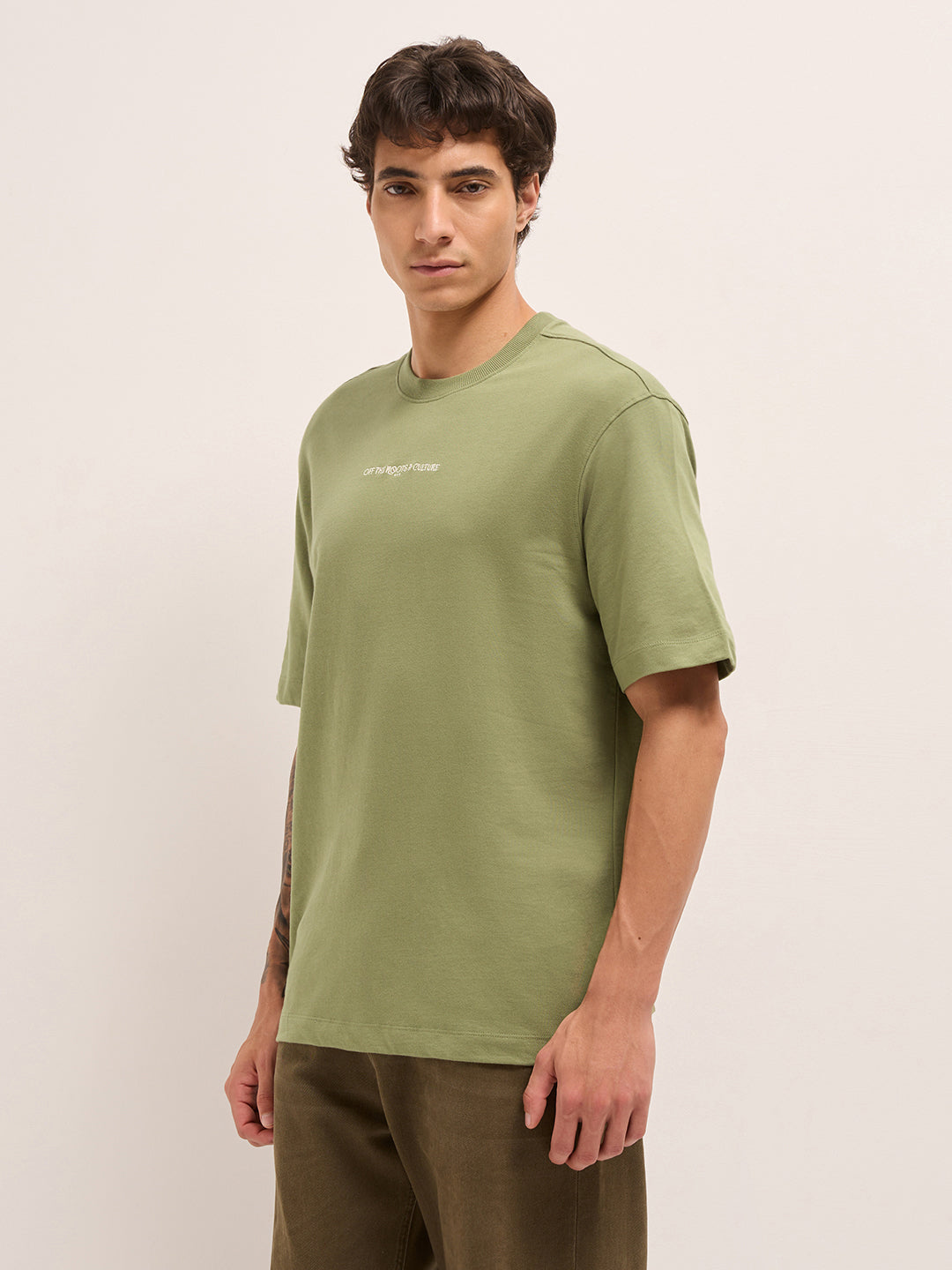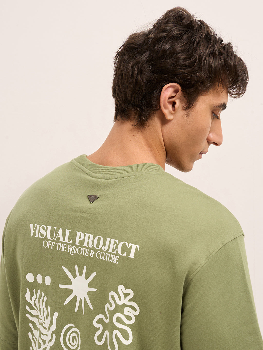 Olive Crew Neck Graphic Print T-Shirt with Abstract "Off the Roots" Illustration on Back