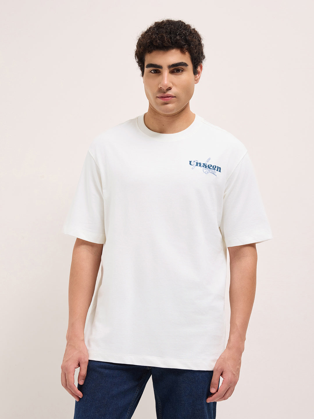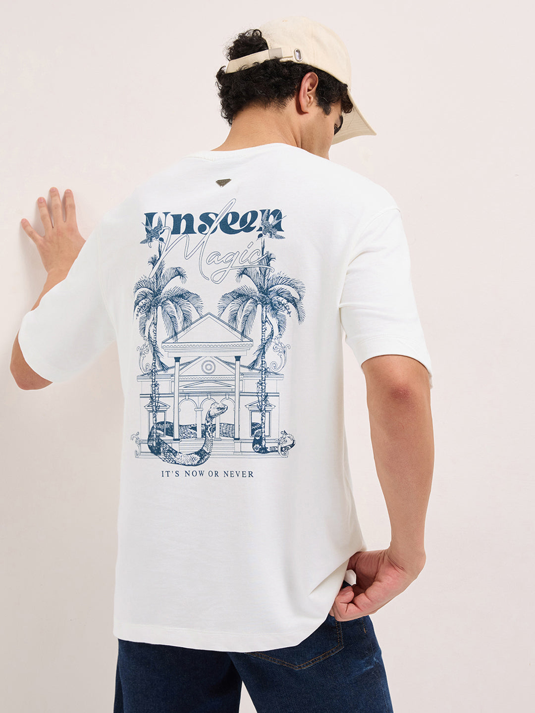 Shop White Crew Neck Oversized T-Shirt with “Unseen Magic” Graphic Print on Back Online