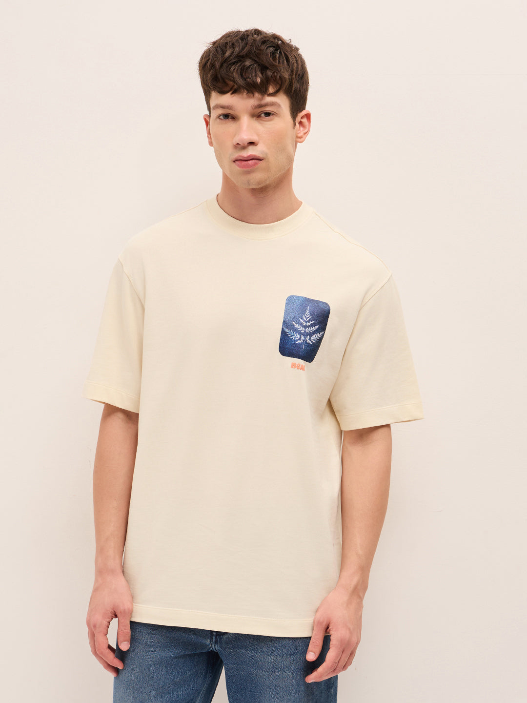 Shop Cream Crew Neck Graphic Print T-Shirt with Floral Illustration on Back Online