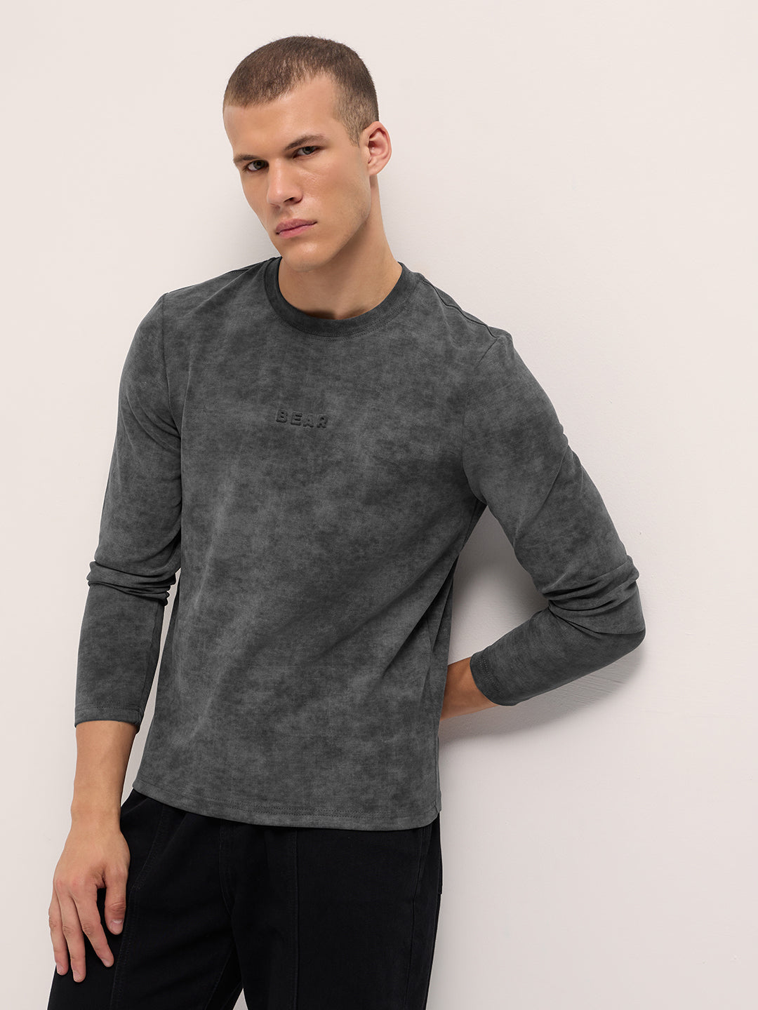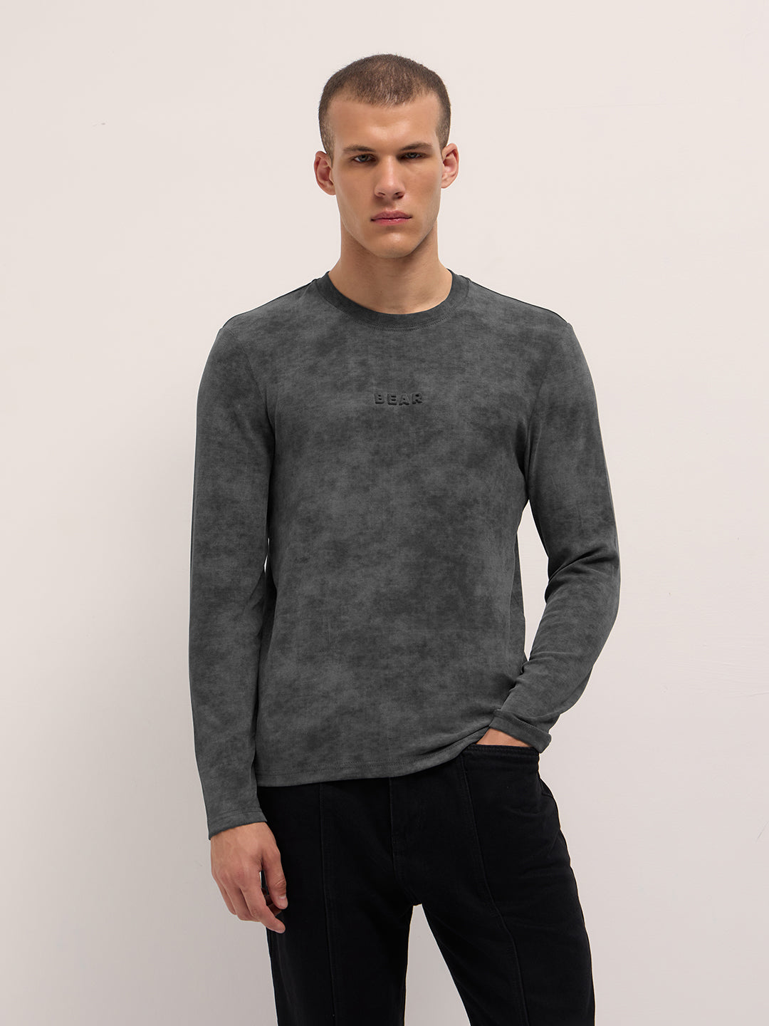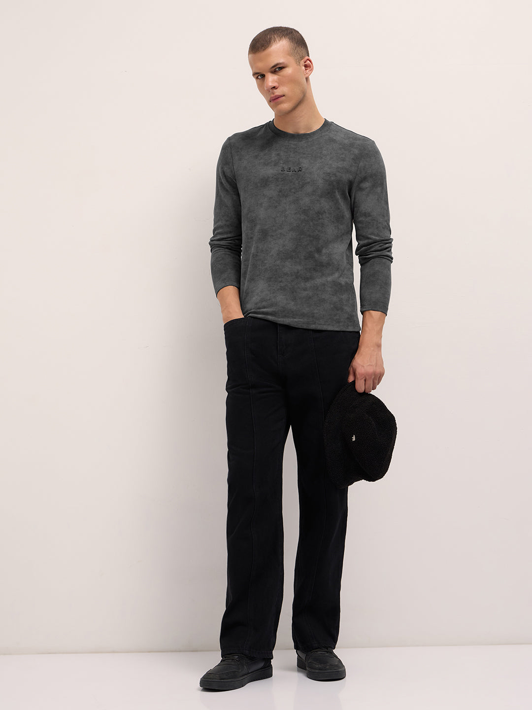 Grey Slim Fit Crew Neck T-Shirt with All-Over Wash Effect and Stretch Fabric