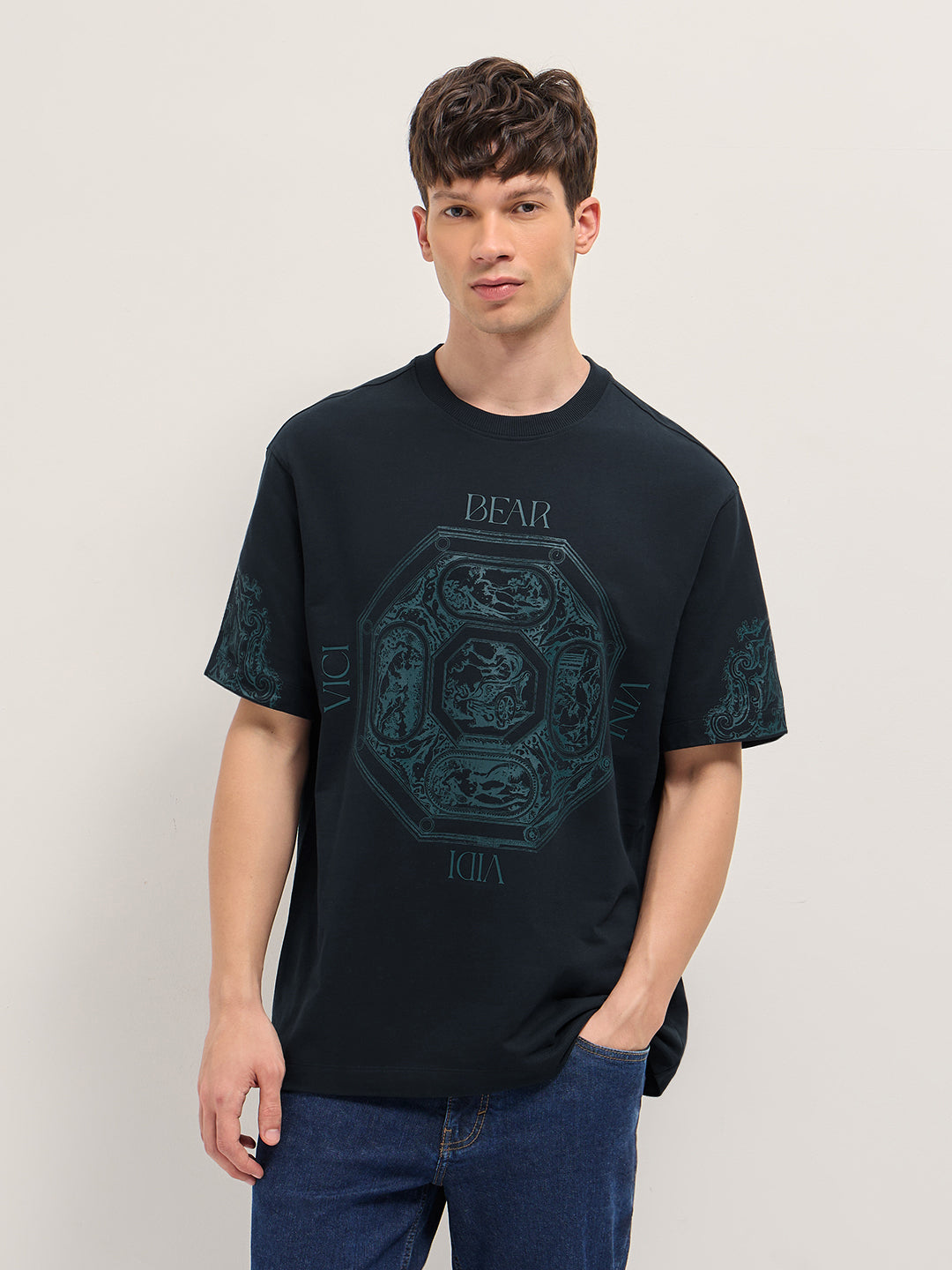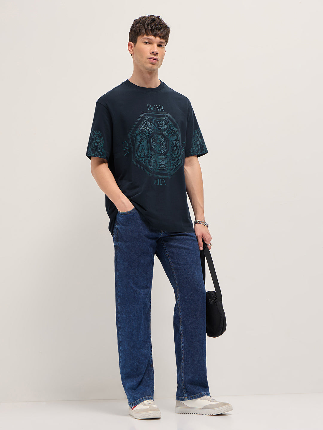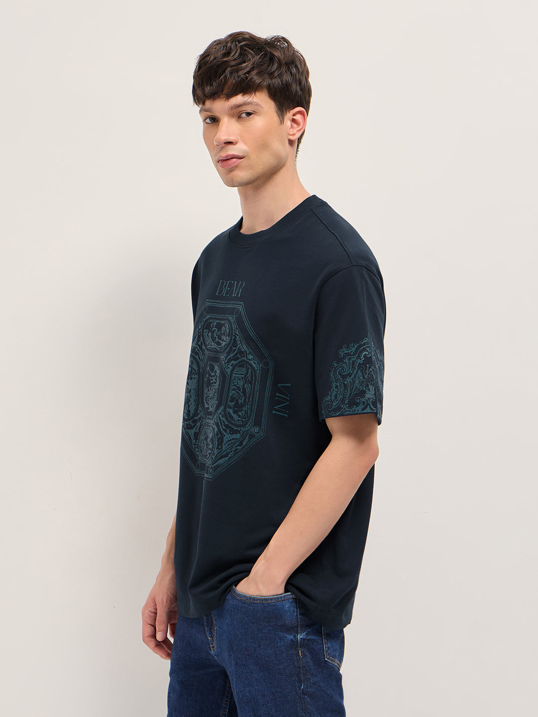Navy Crew Neck Graphic Print T-Shirt with Octagonal Motif and Sleeve Design