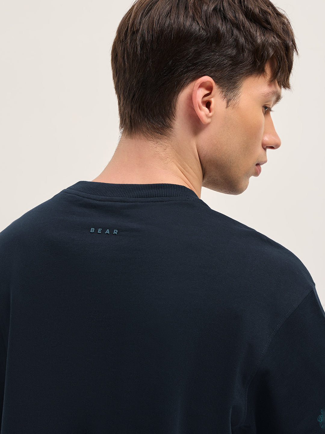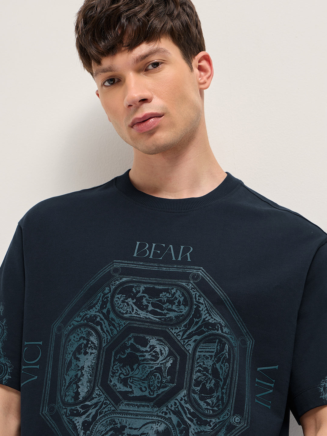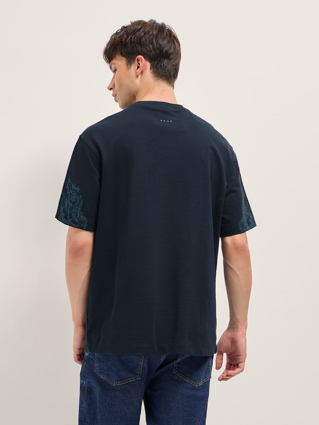 Navy Crew Neck Graphic Print T-Shirt with Octagonal Motif and Sleeve Design