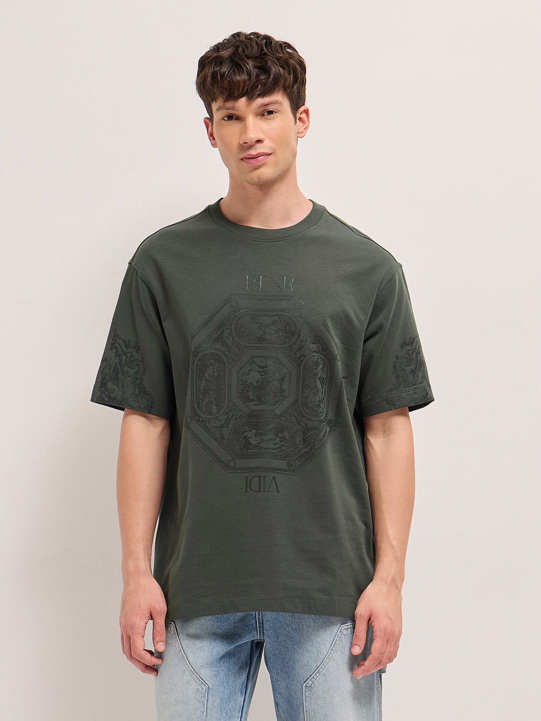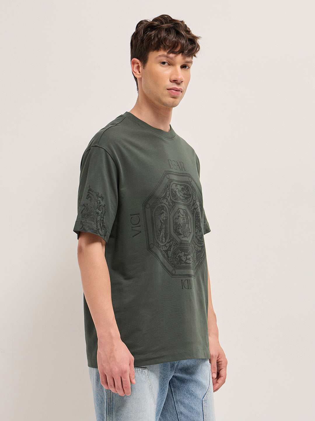 Shop Grey Crew Neck Graphic Print T-Shirt with Octagonal Motif and Sleeve Design Online