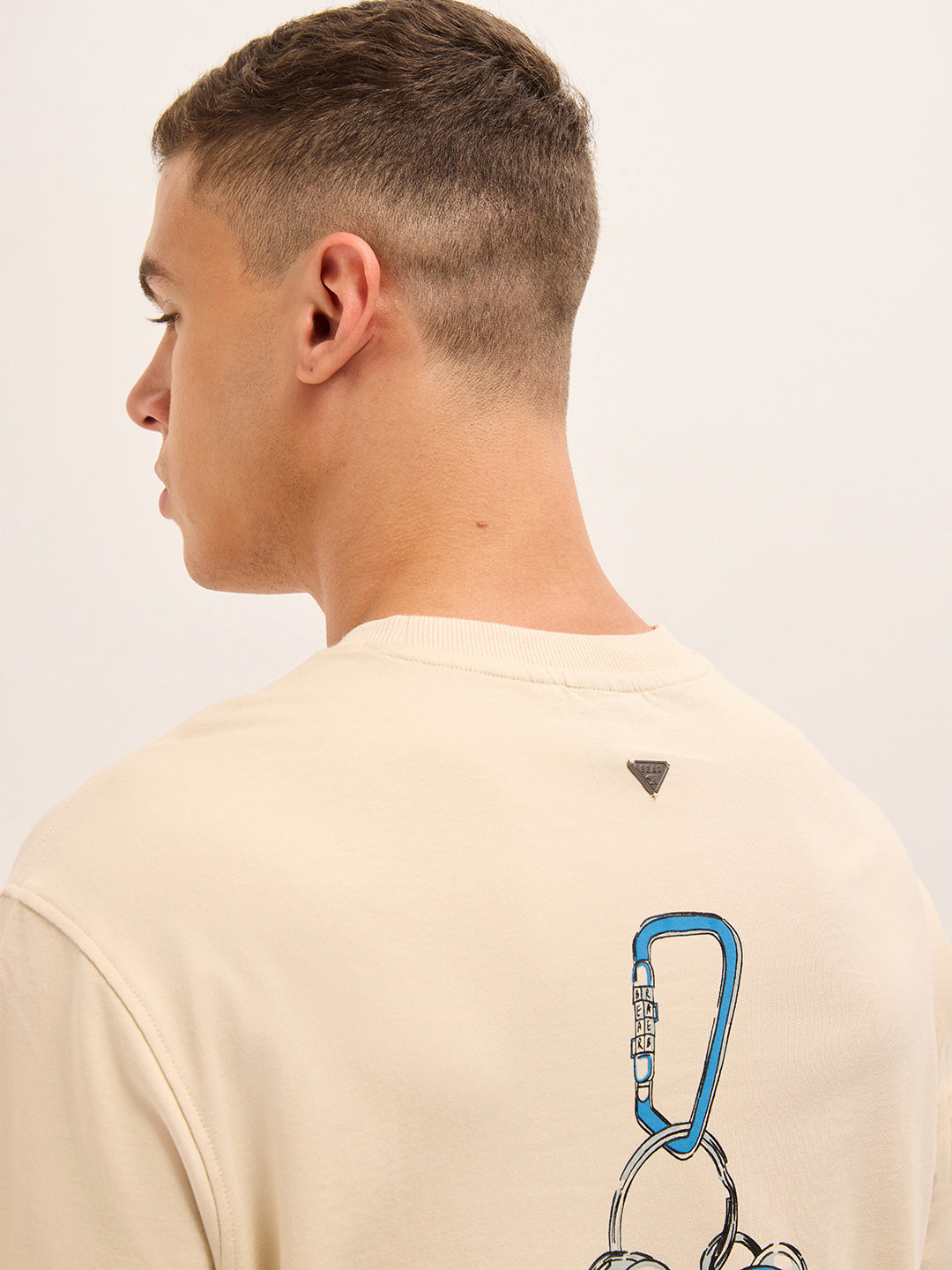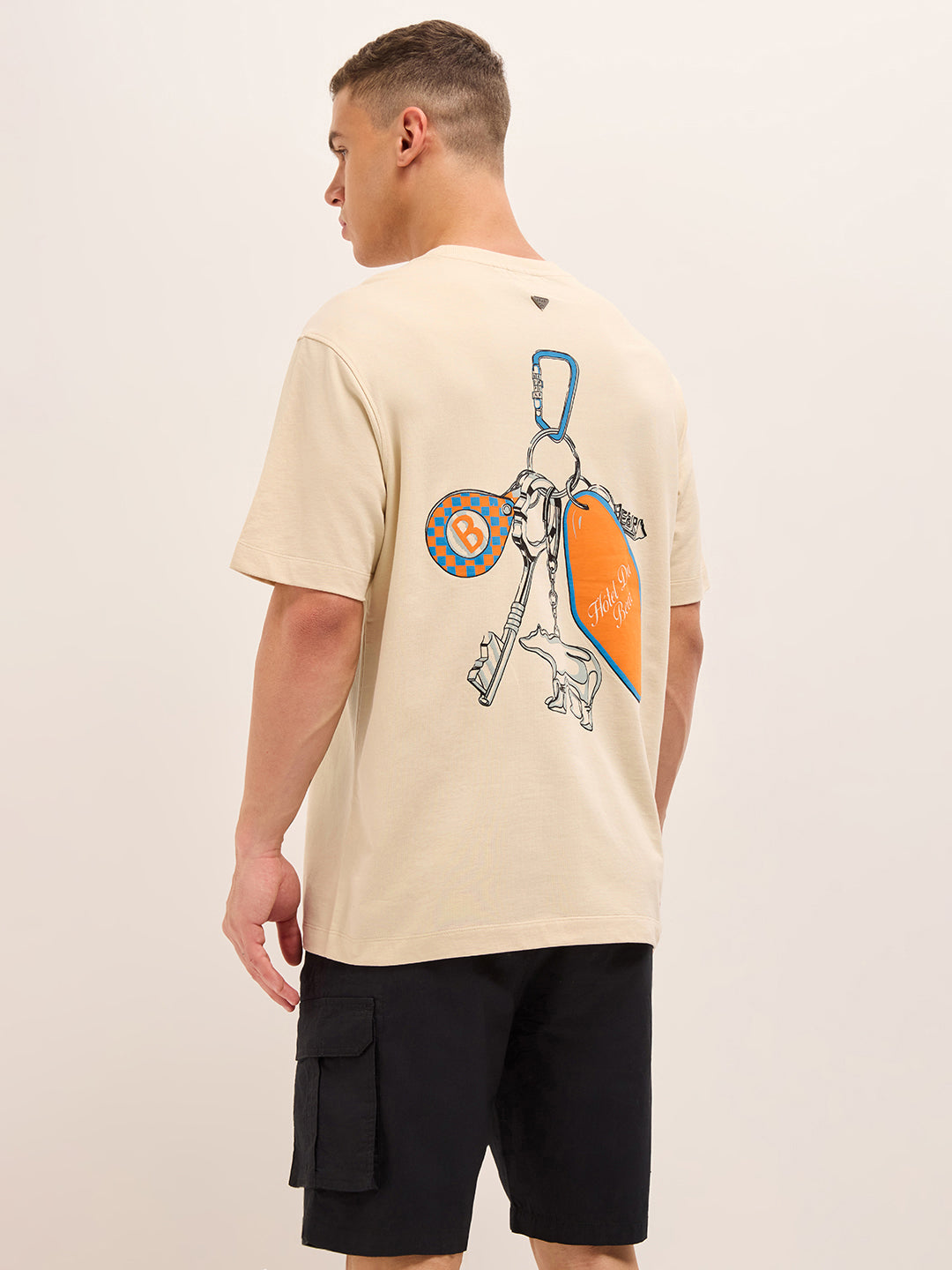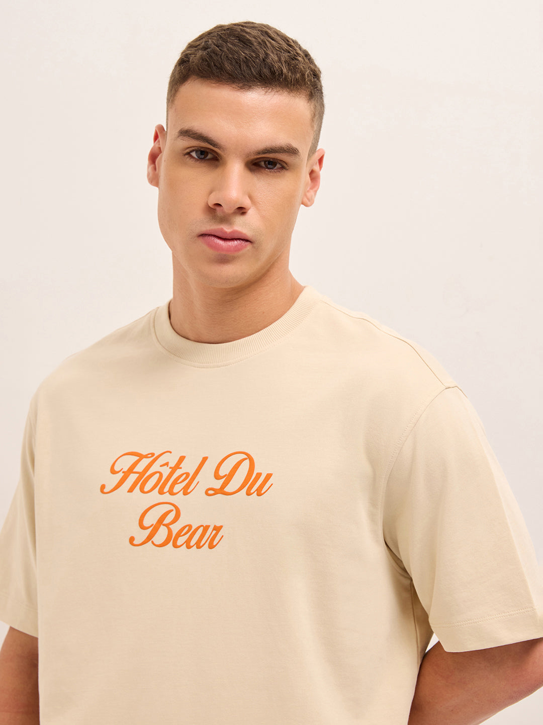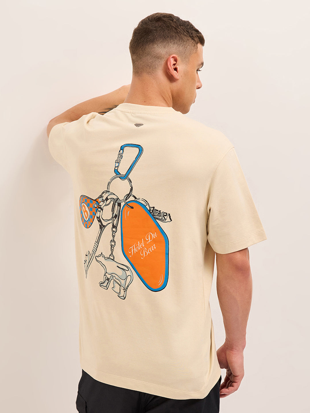 Beige Oversized Crew Neck T-Shirt with Hôtel Du Bear Keychain Graphic Print