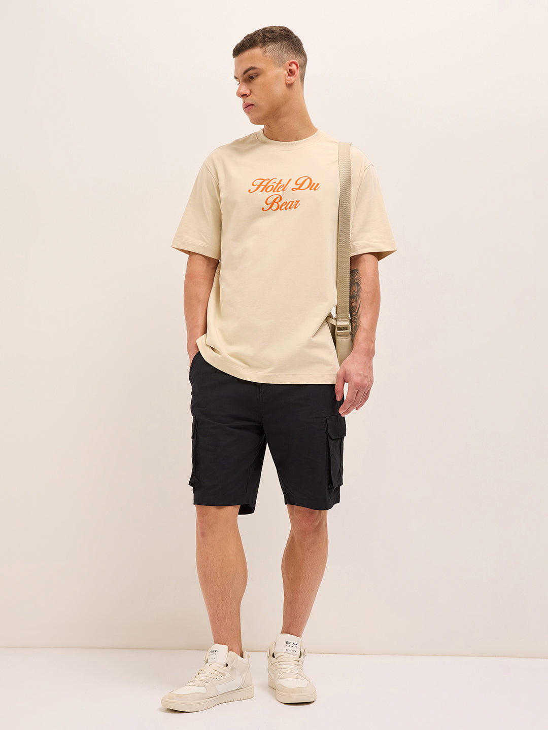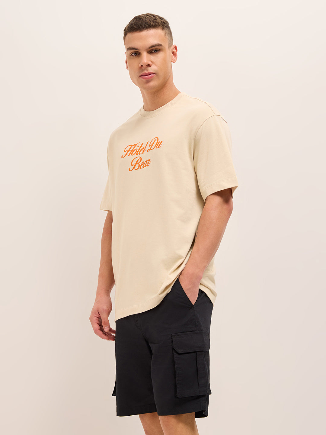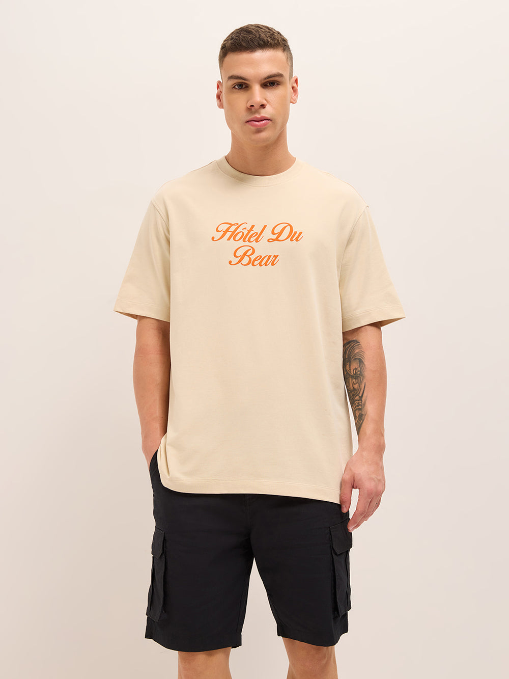 Shop Beige Oversized Crew Neck T-Shirt with Hôtel Du Bear Keychain Graphic Print Online