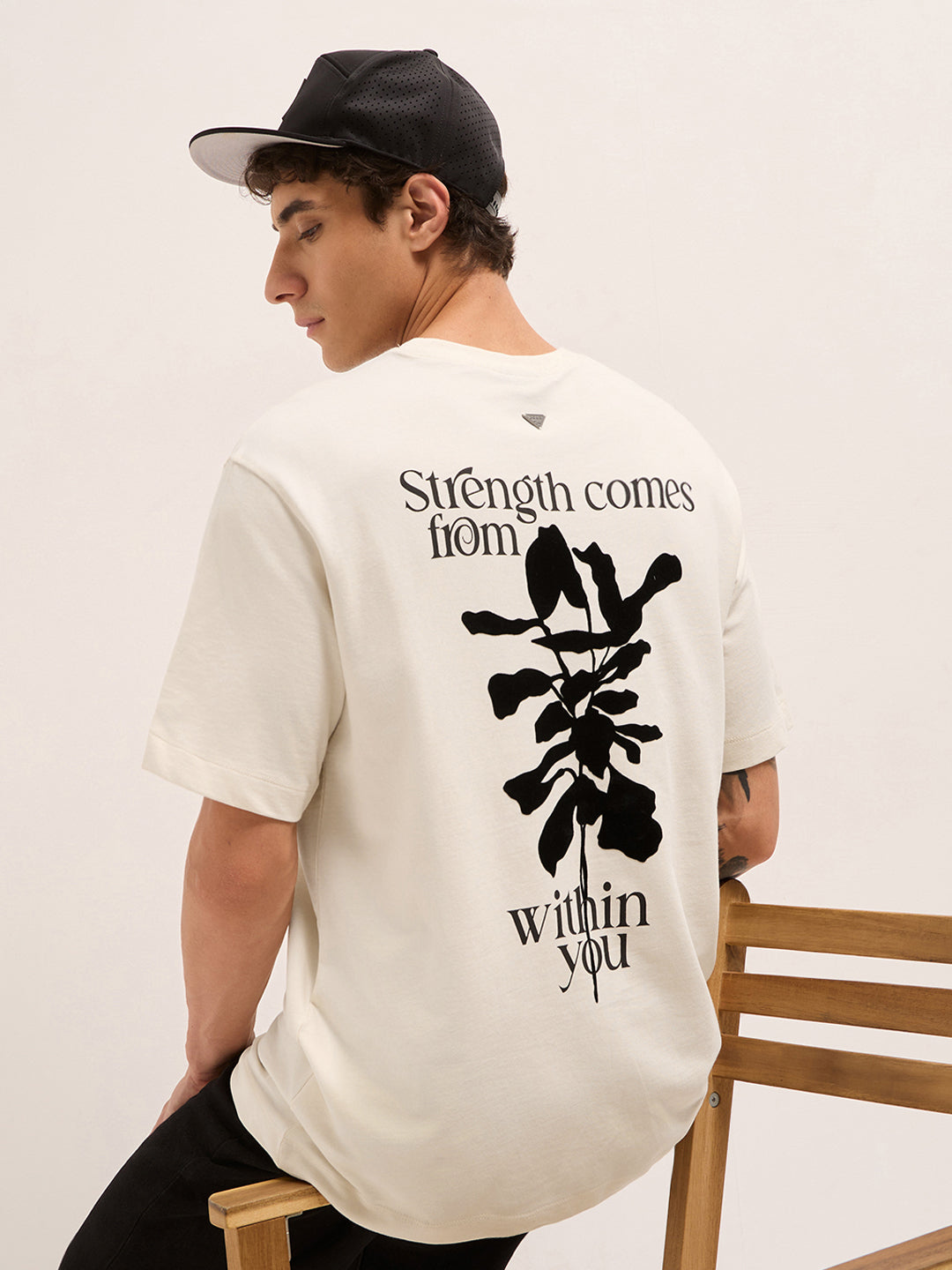 Back Design: Large abstract floral line-art print with bold motivational text across the back