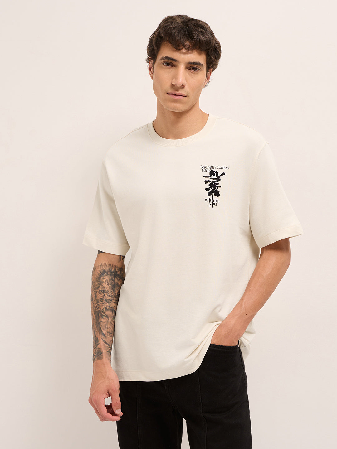 Shop Cream Oversized Crew Neck T-Shirt with Motivational Abstract Graphic Print Online