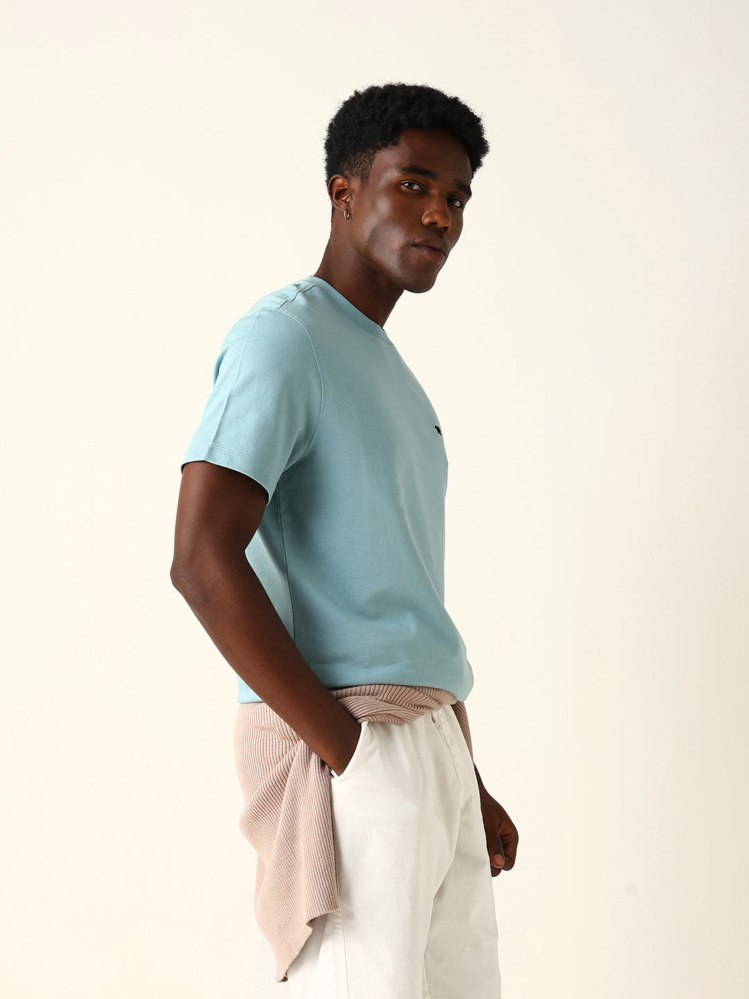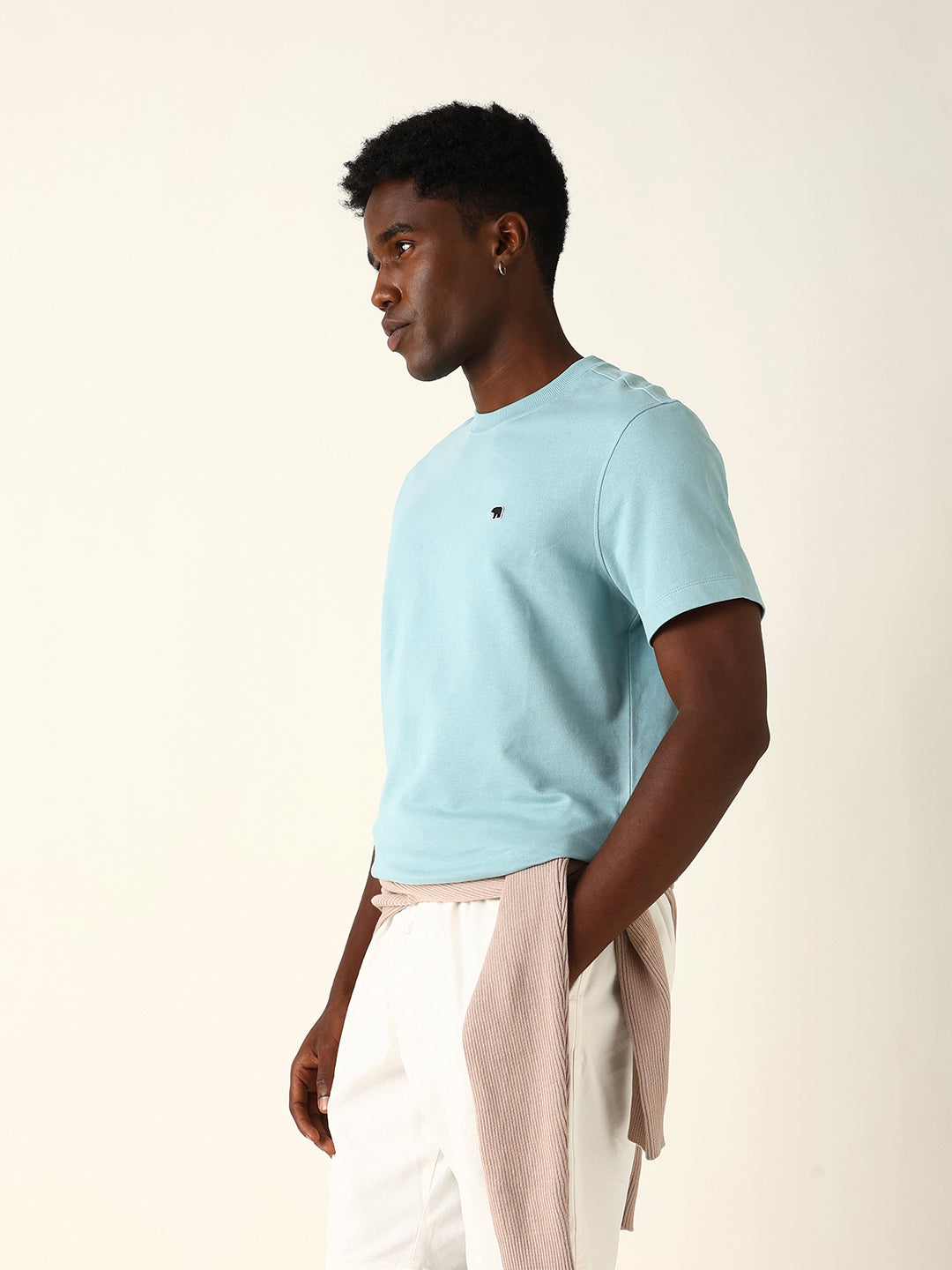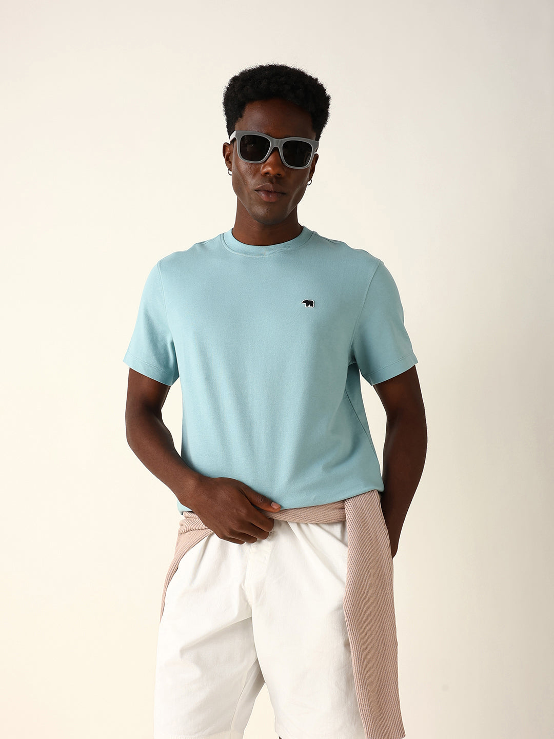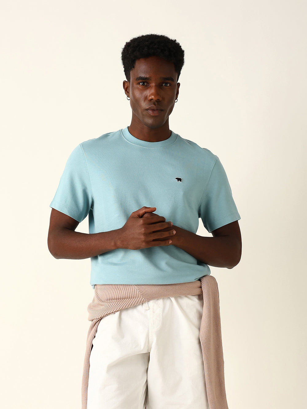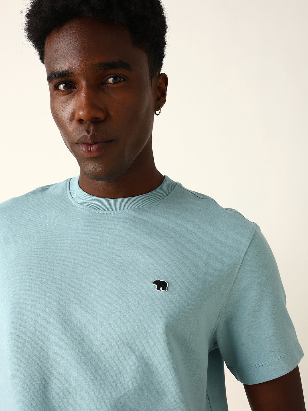 Dusty Aqua Crew Neck T-Shirt with Bear Logo Embroidery