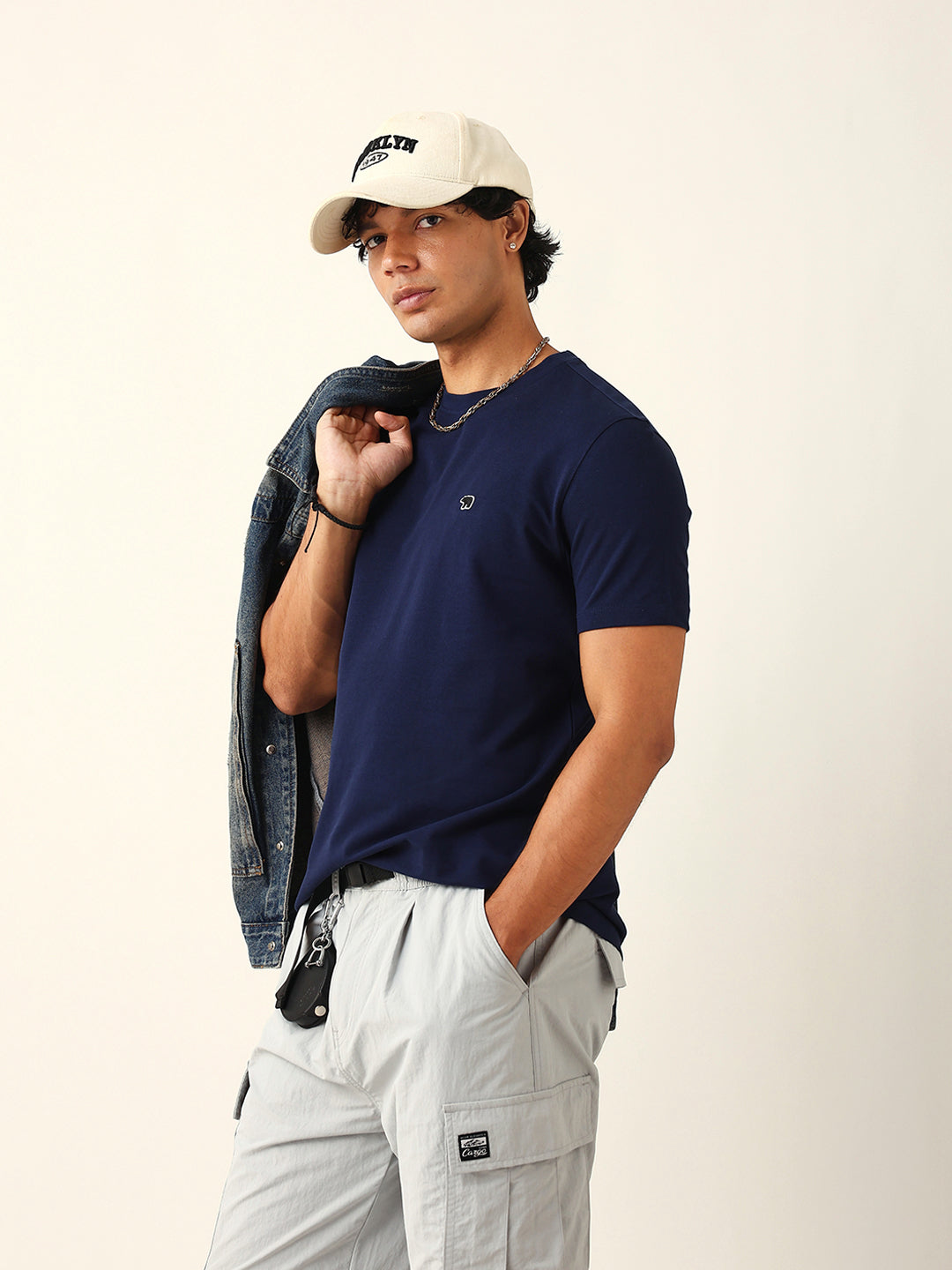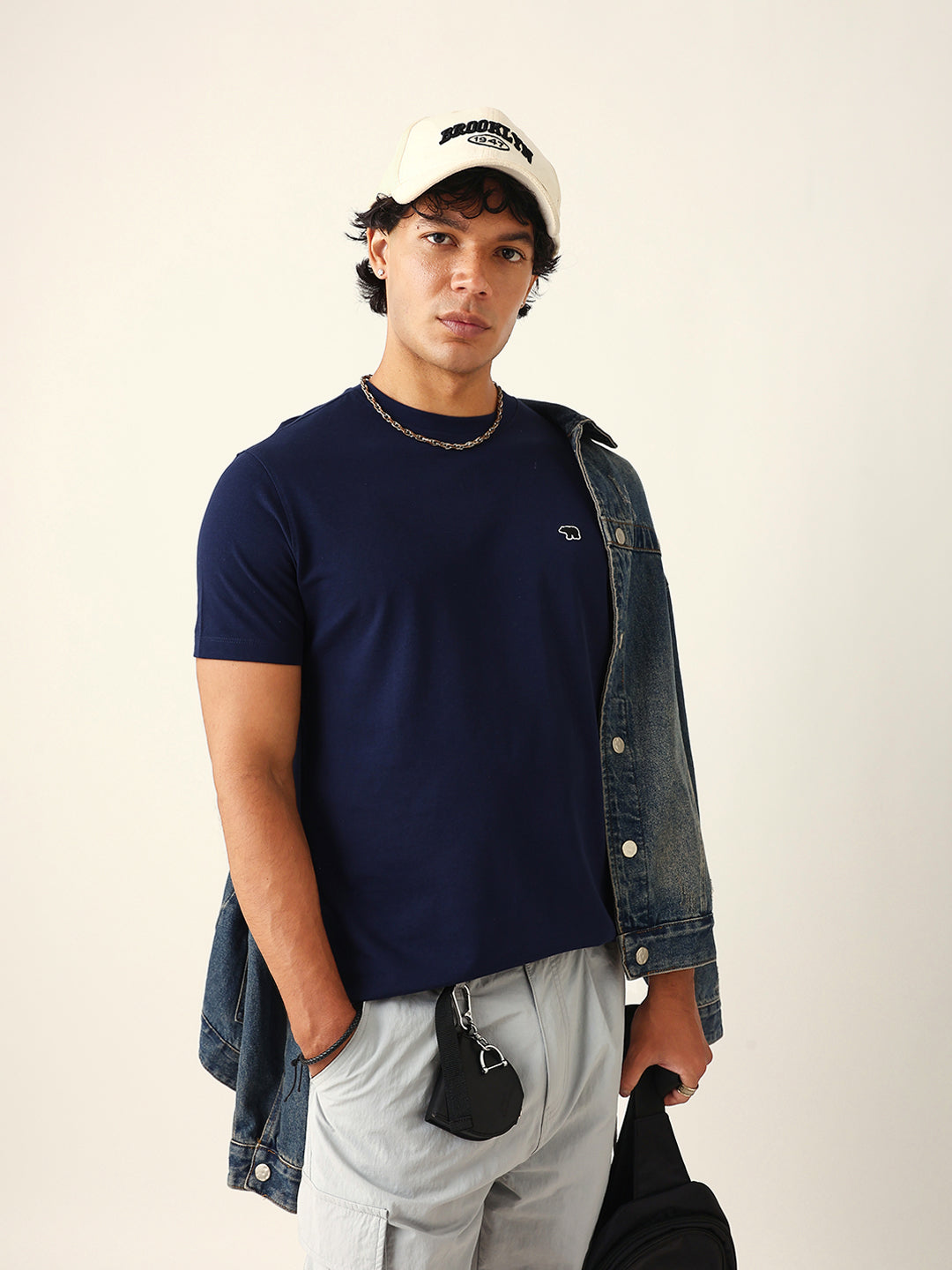 Shop Navy Crew Neck Slim Fit T-Shirt with Bear Logo Embroidery Online