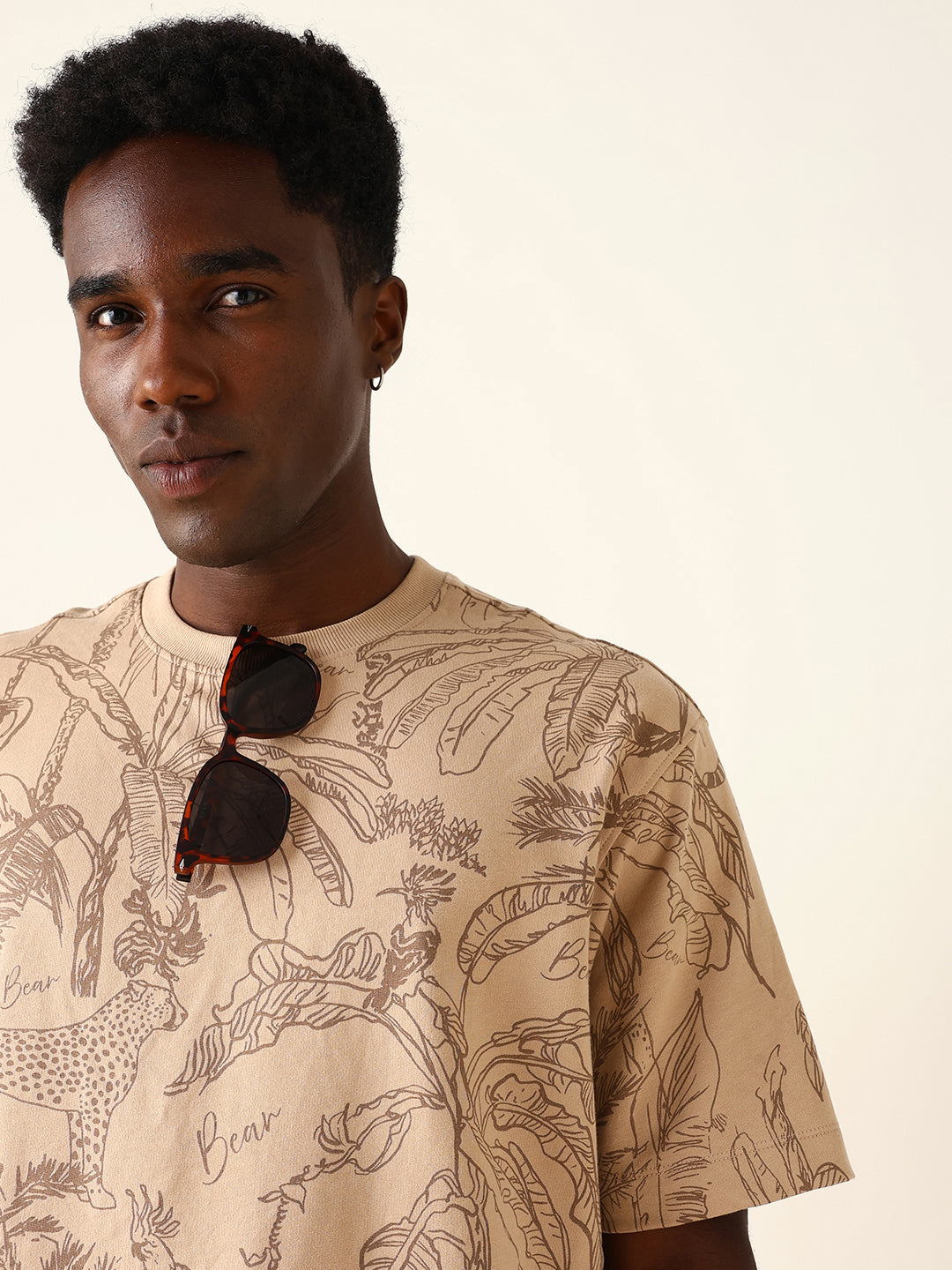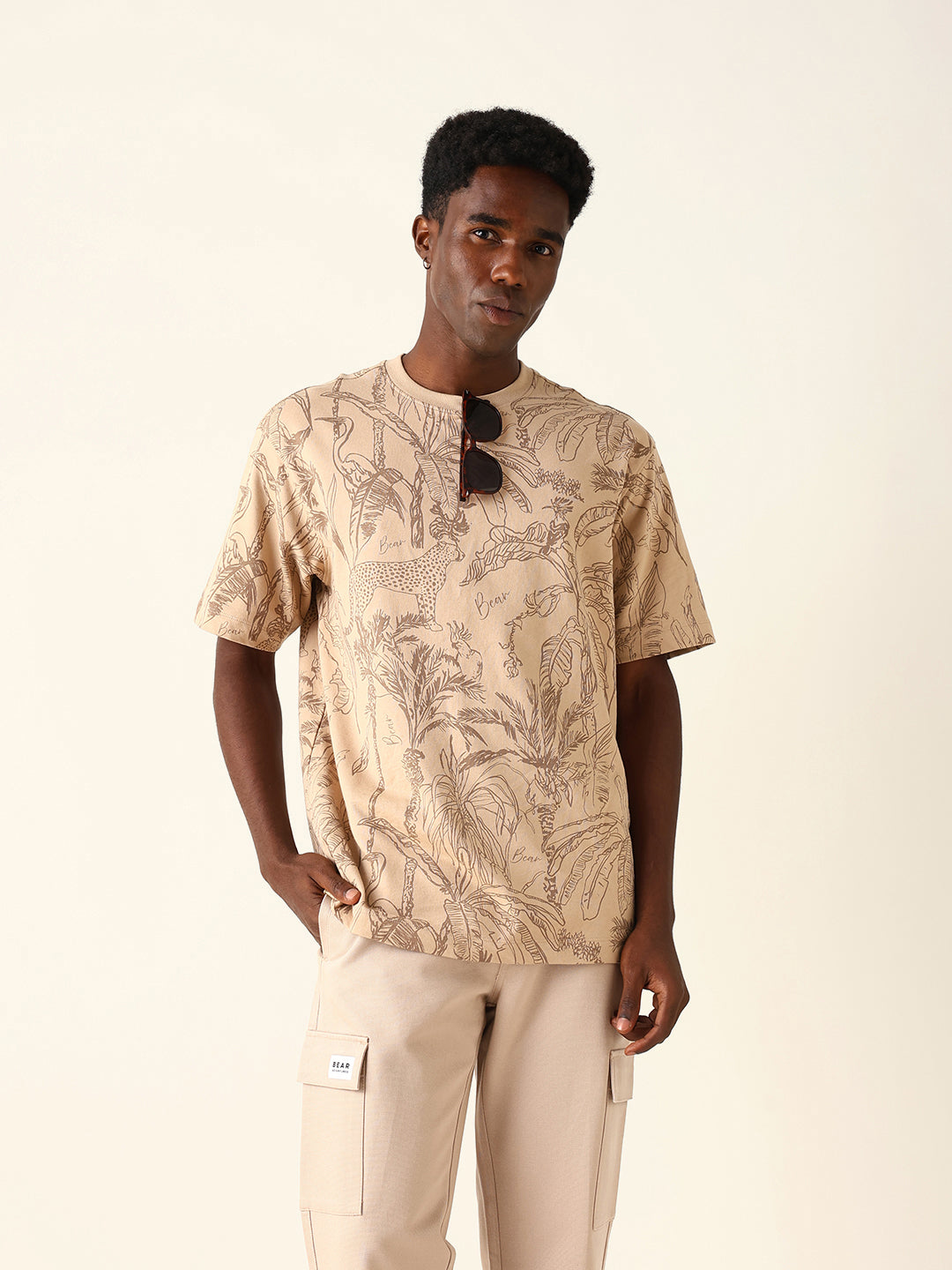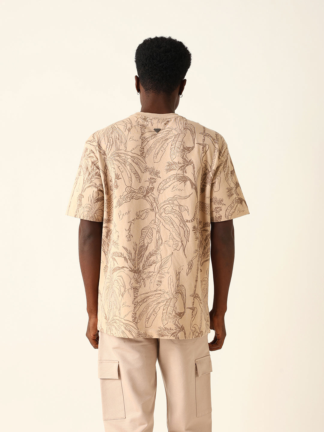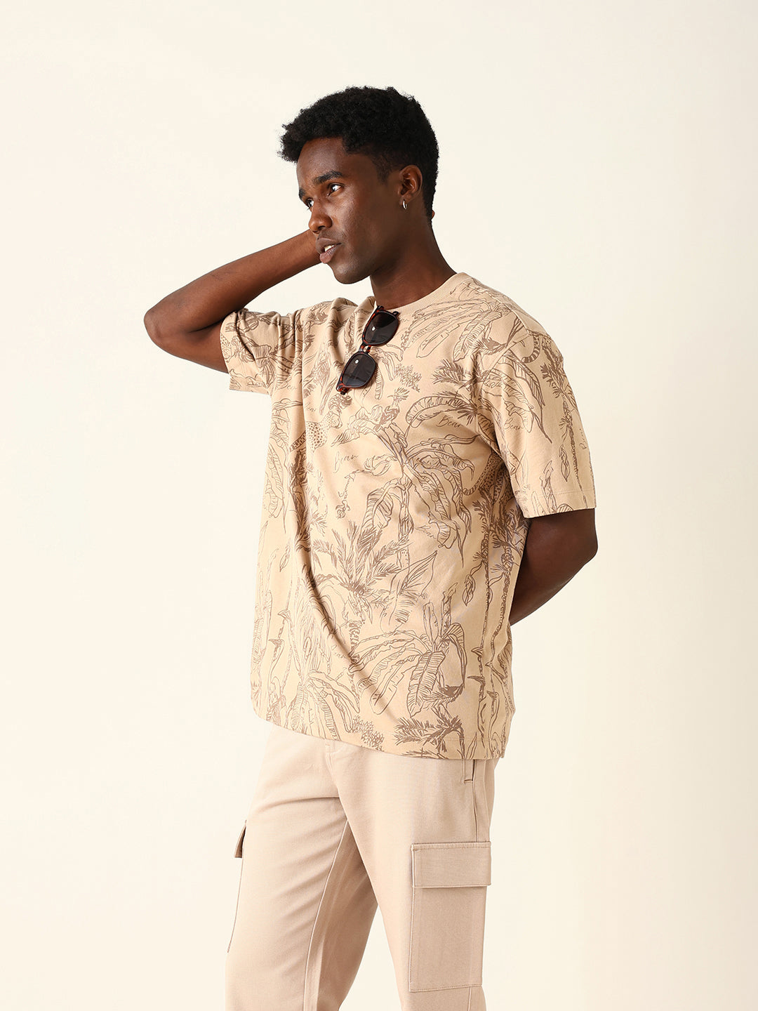 Shop Beige Crew Neck Oversized T-Shirt with All-Over Tropical Print Online