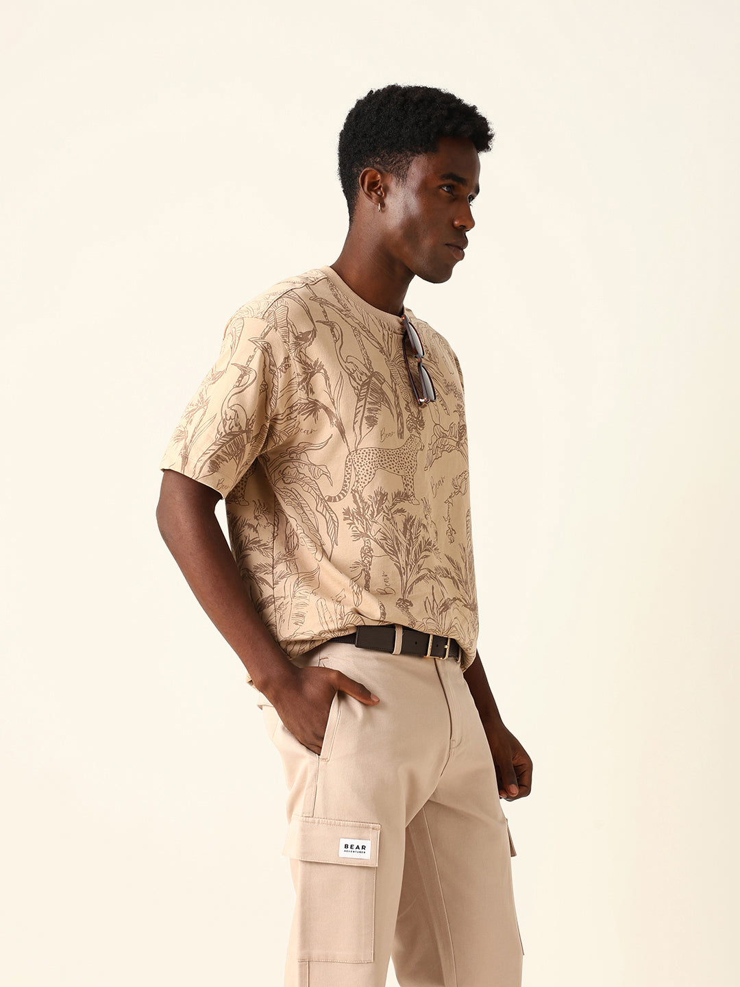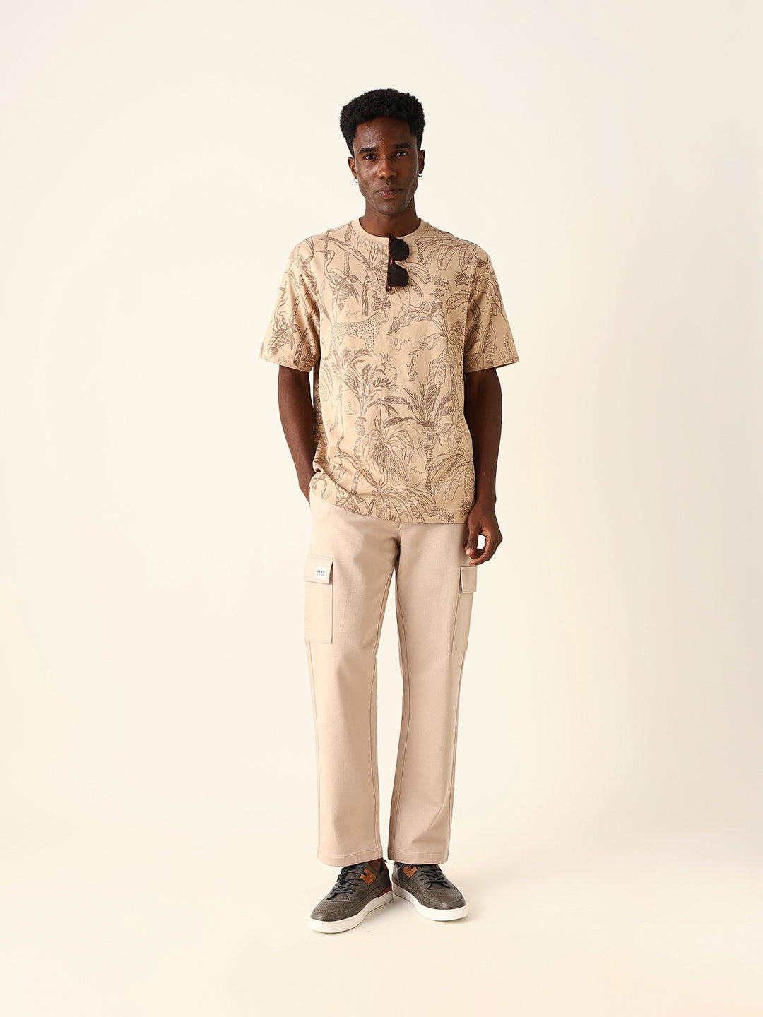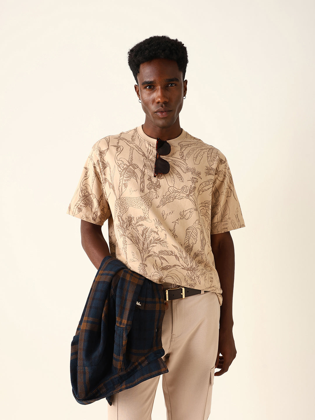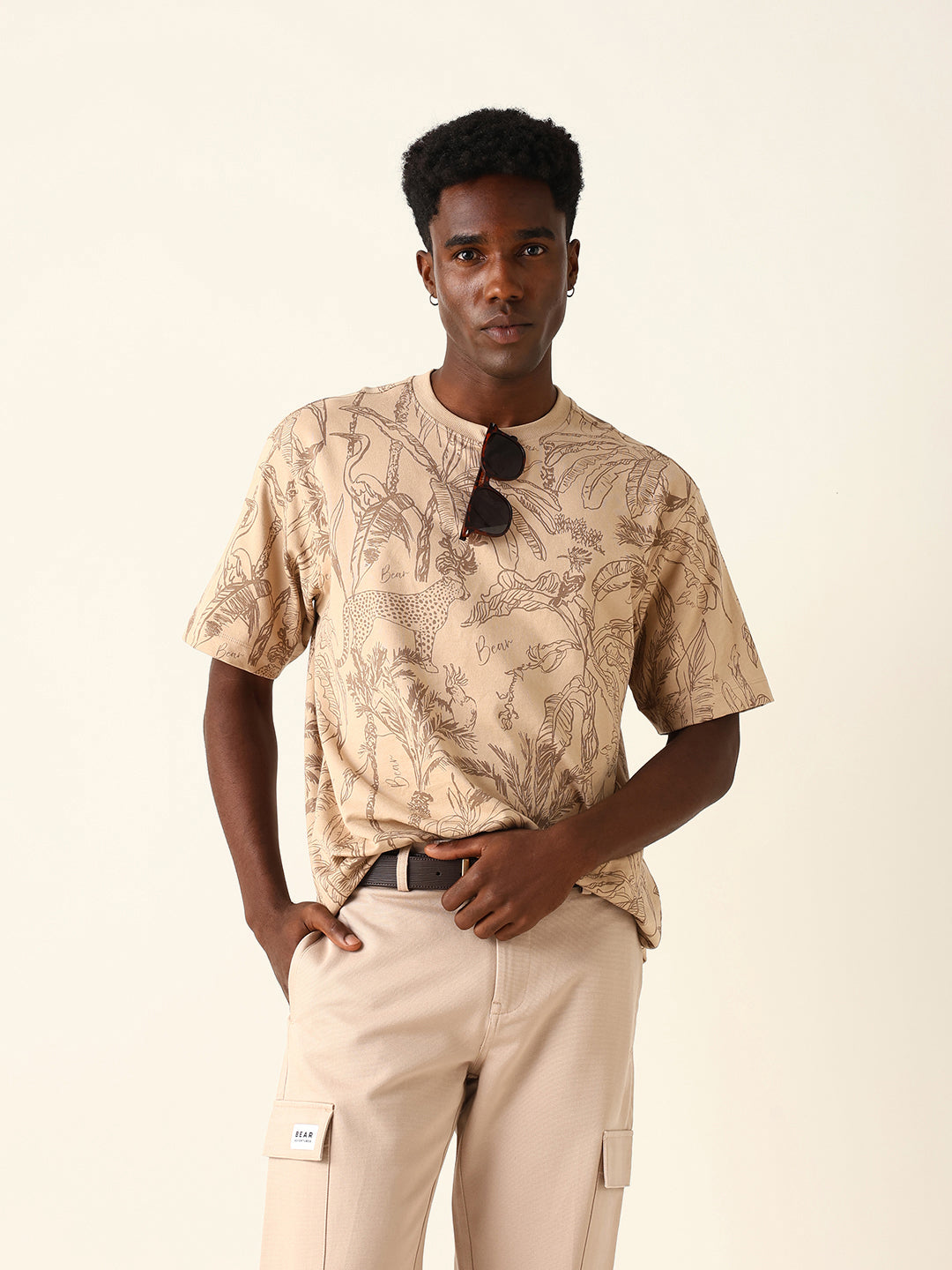 Shop Beige Crew Neck Oversized T-Shirt with All-Over Tropical Print Online