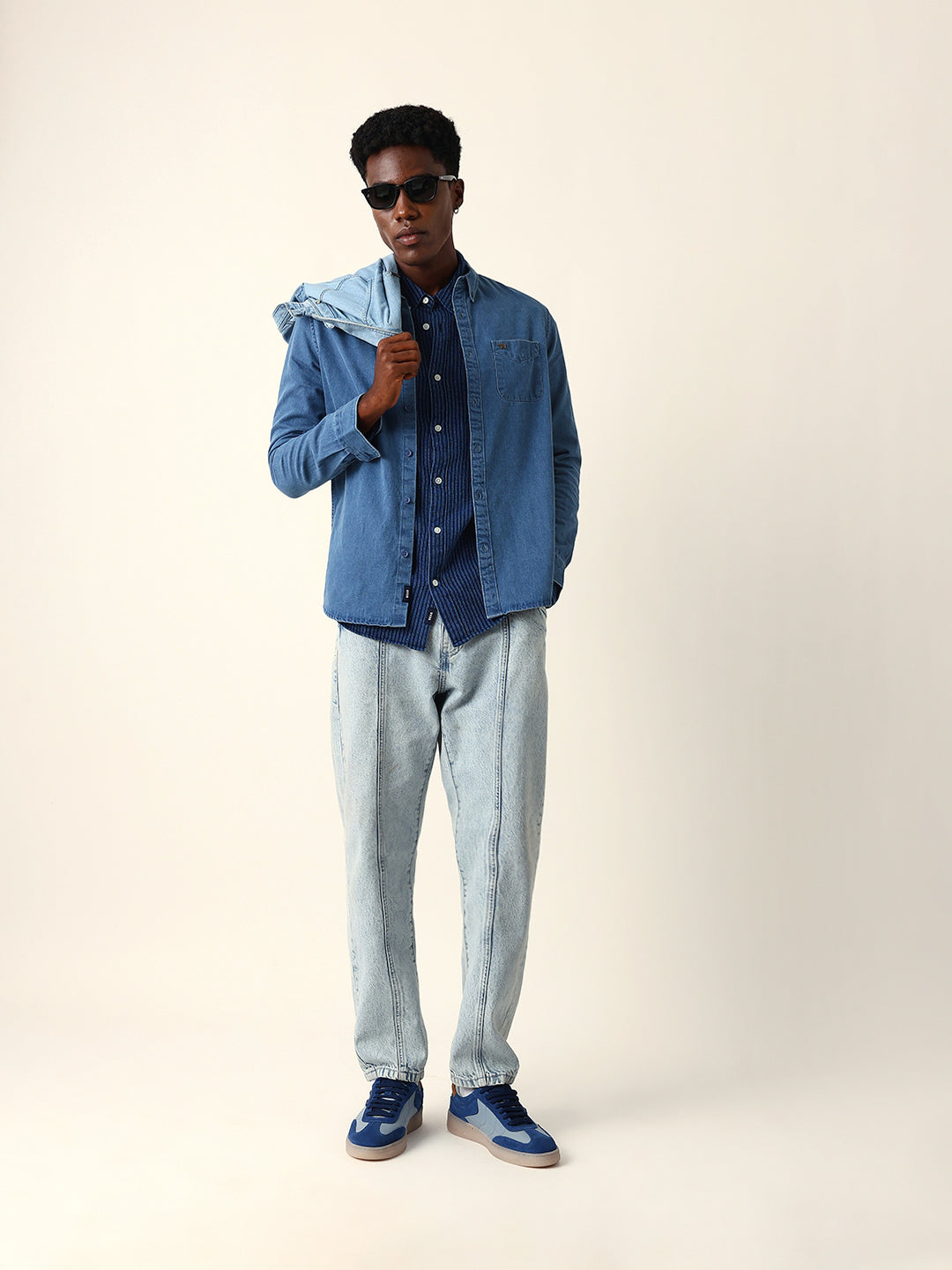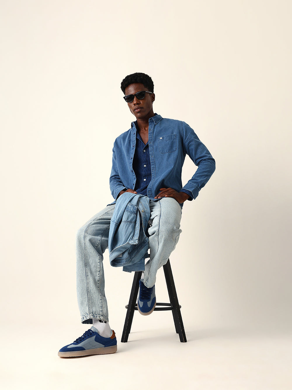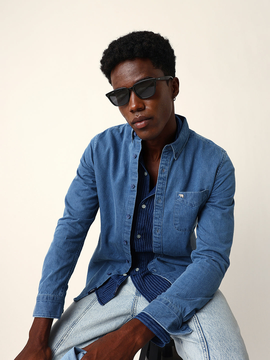 Blue Denim Slim Fit Casual Shirt with Button-Down Collar