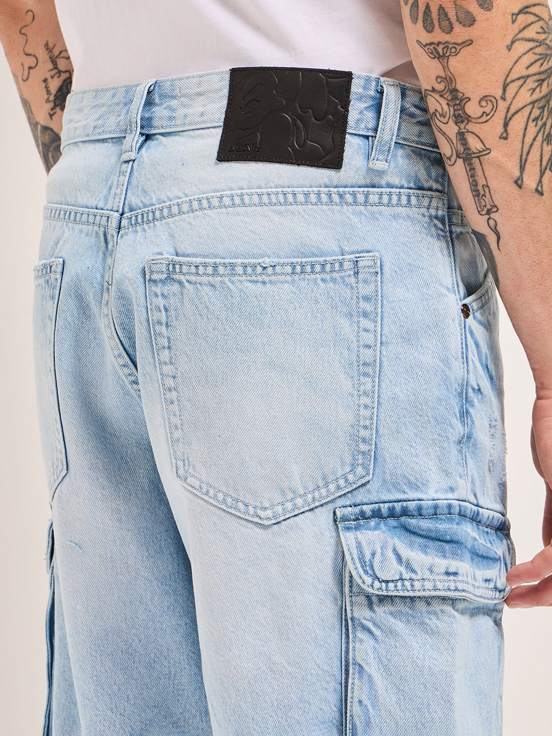 Light Blue Baggy Fit Denim Cargo Shorts with Utility Pockets