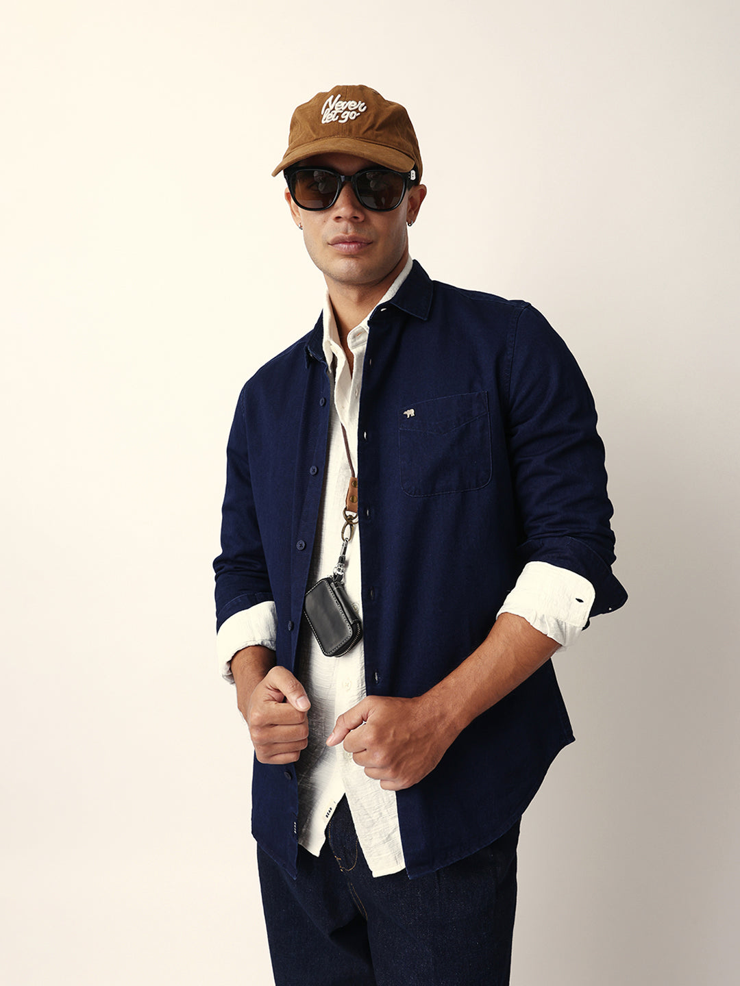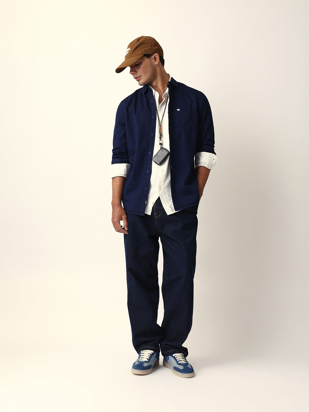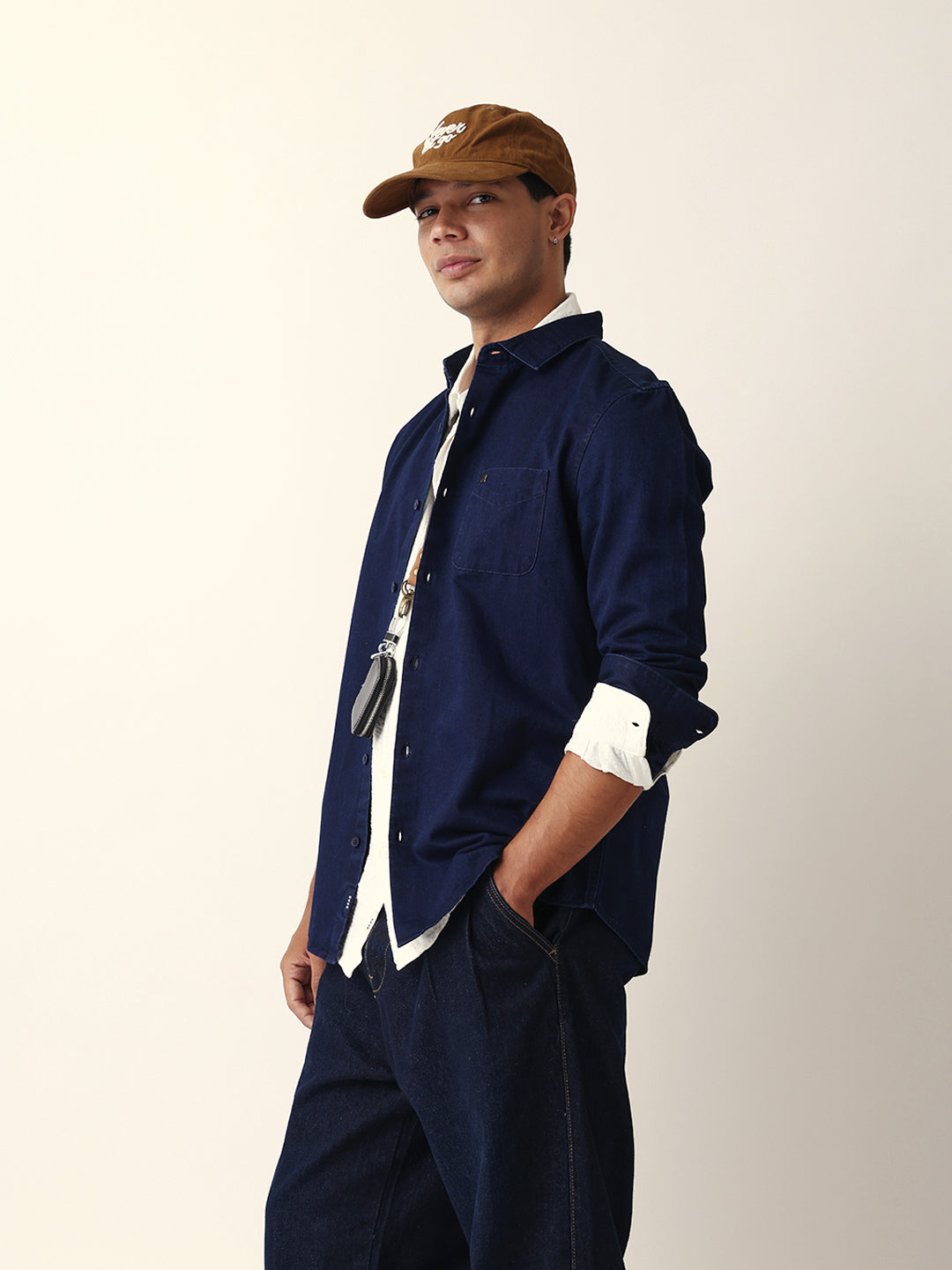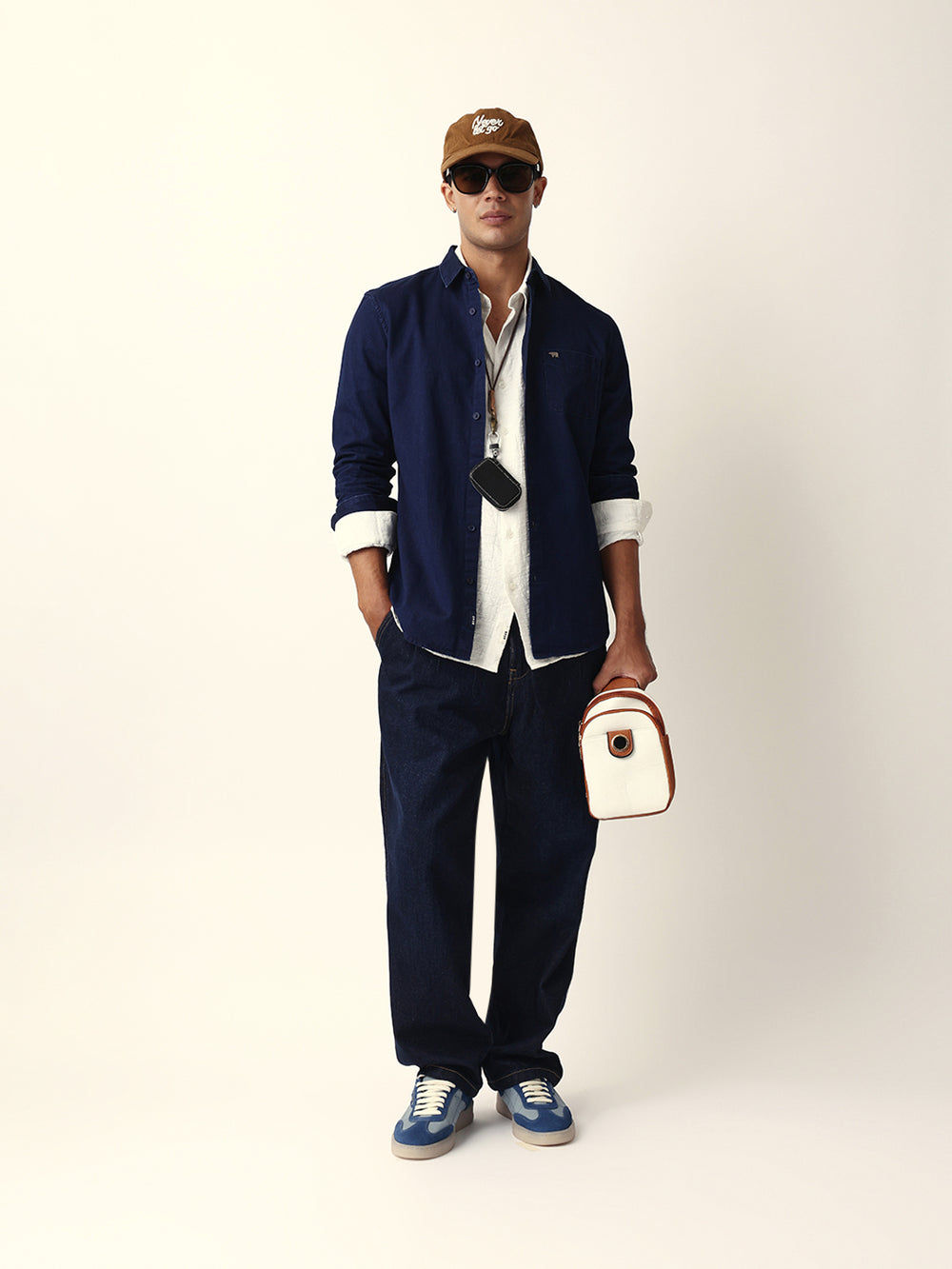 Shop Dark Blue Denim Slim Fit Casual Shirt Online.