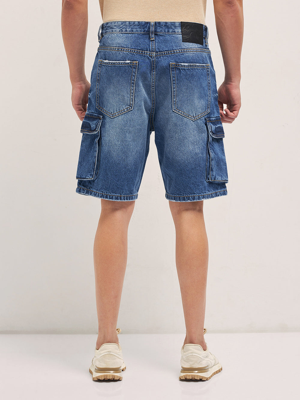 Mid Blue Baggy Fit Denim Cargo Shorts with Utility Pockets
