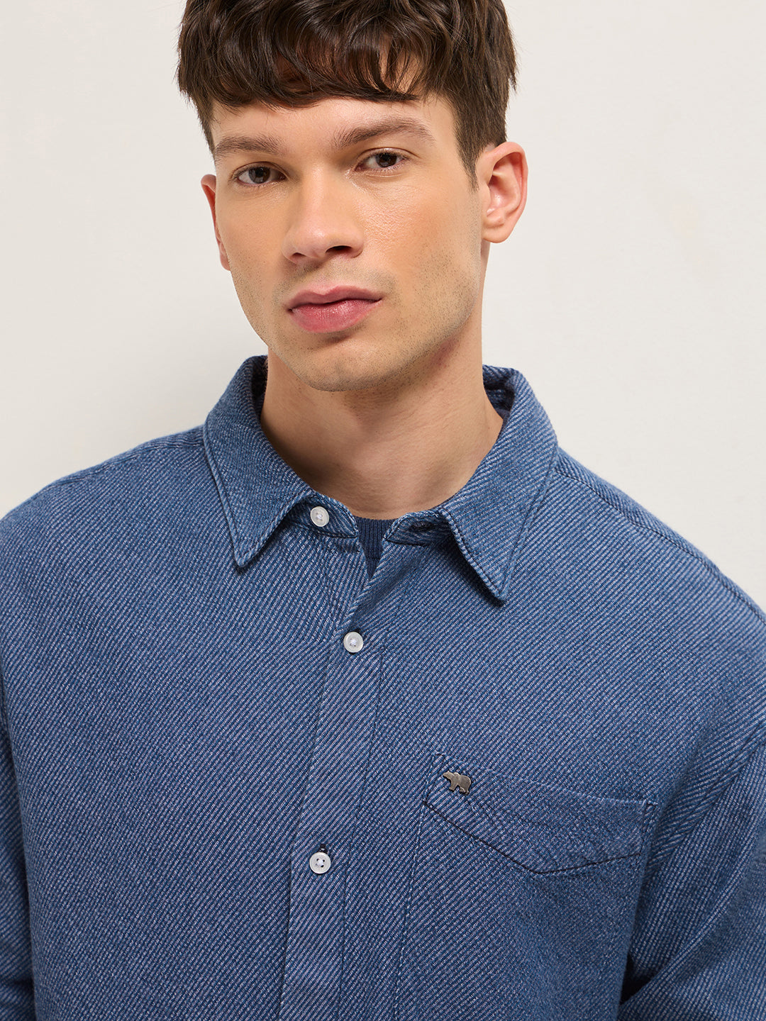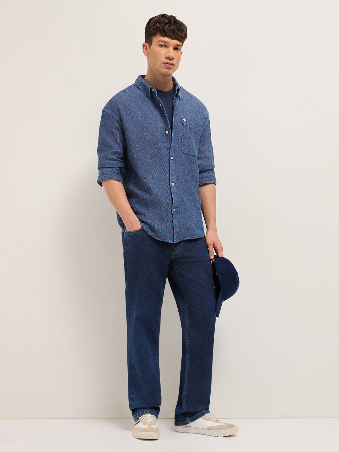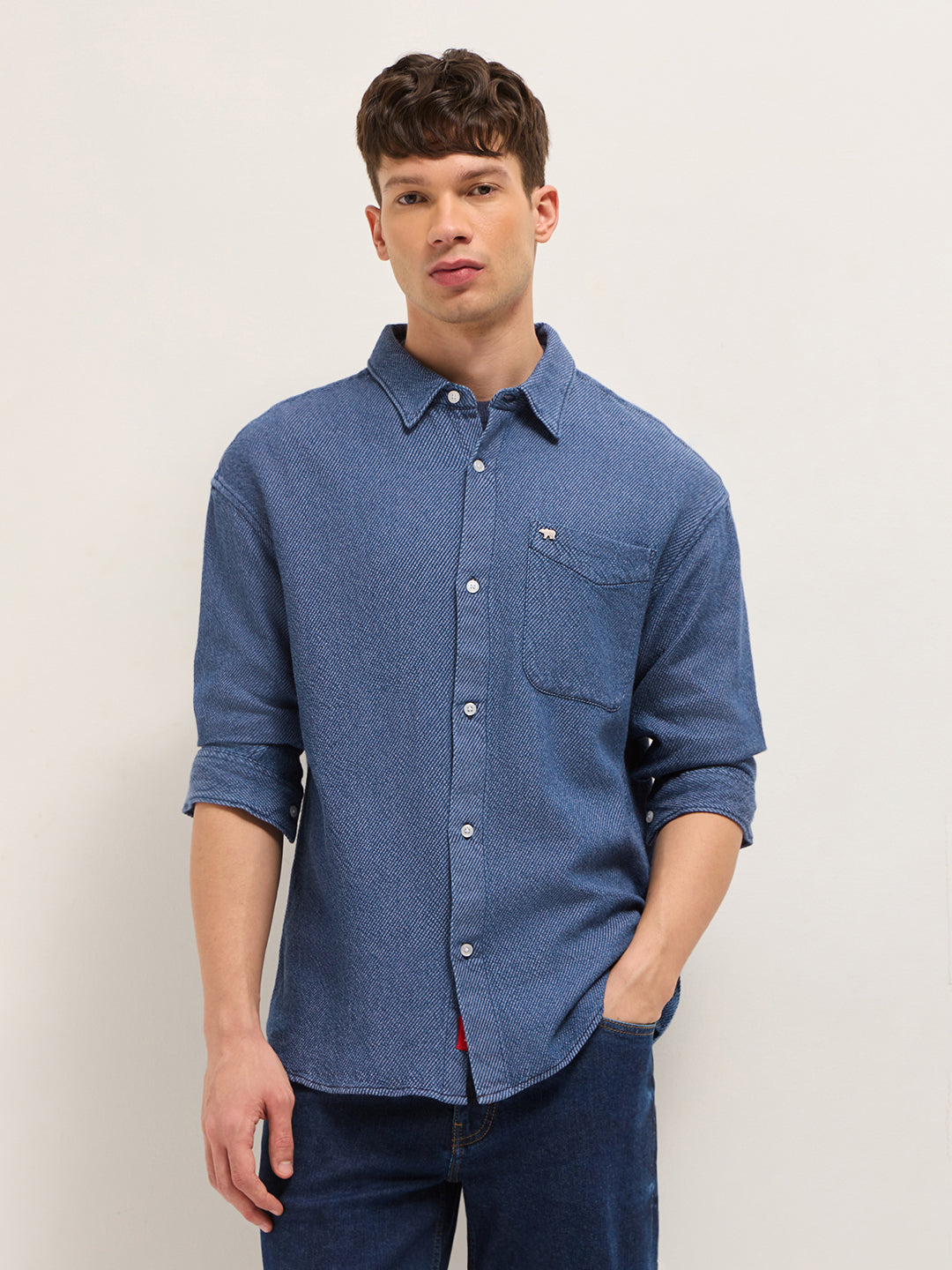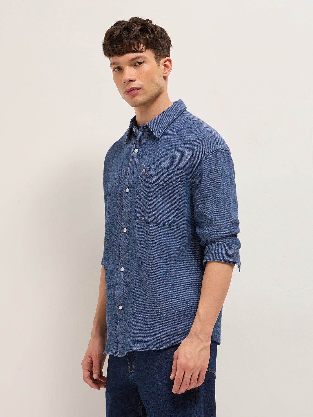 Blue Diagonal Woven Textured Denim Slim Fit Casual Shirt