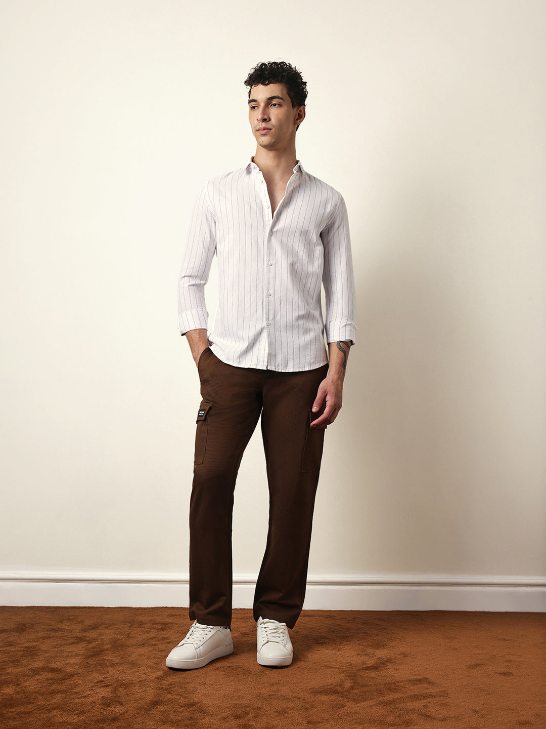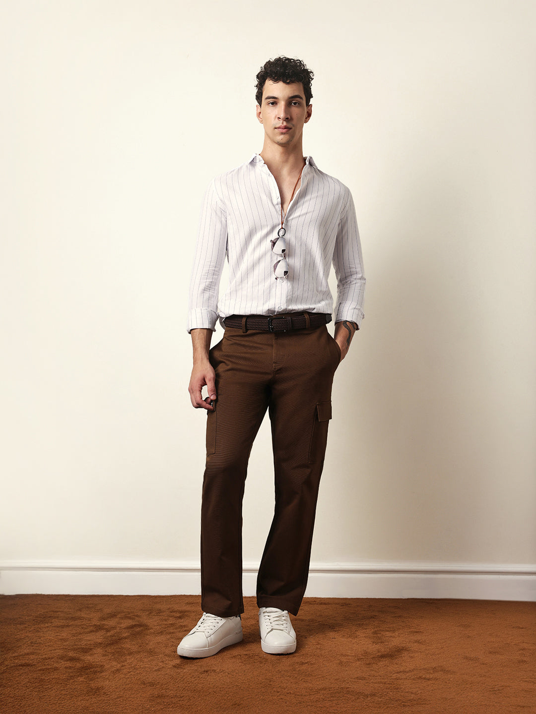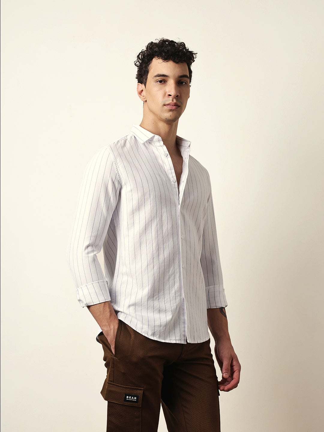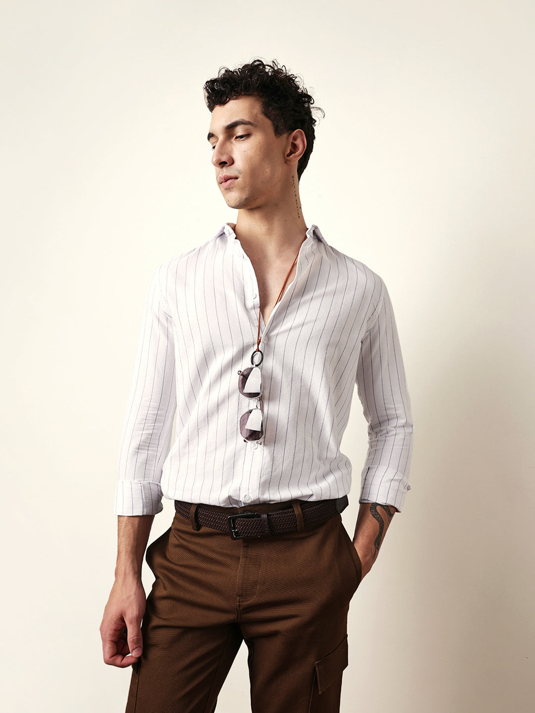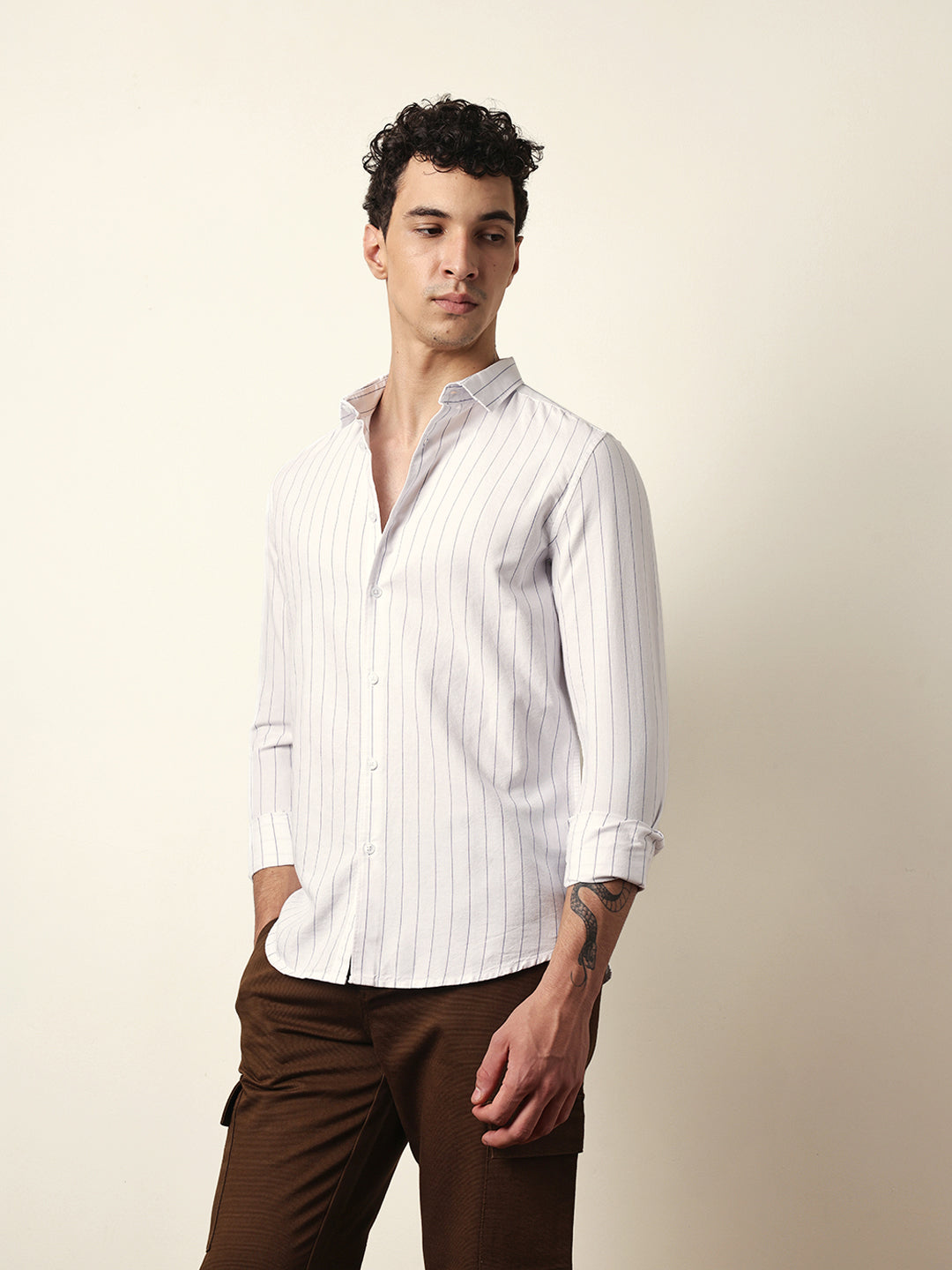 Shop White Vertical Woven Stripe Slim Fit Casual Shirt Online.