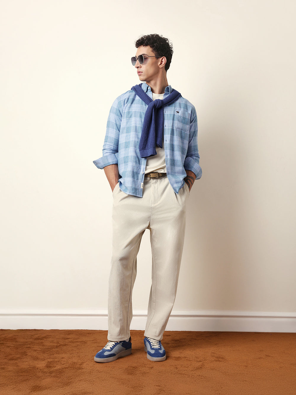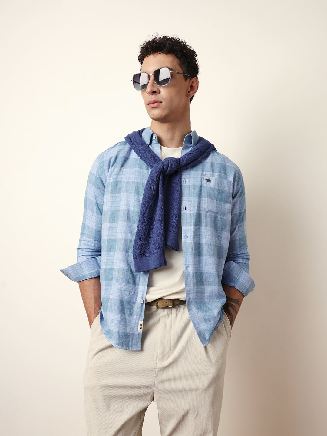 Shop Blue Woven Tartan Checked Slim Fit Casual Shirt Online.