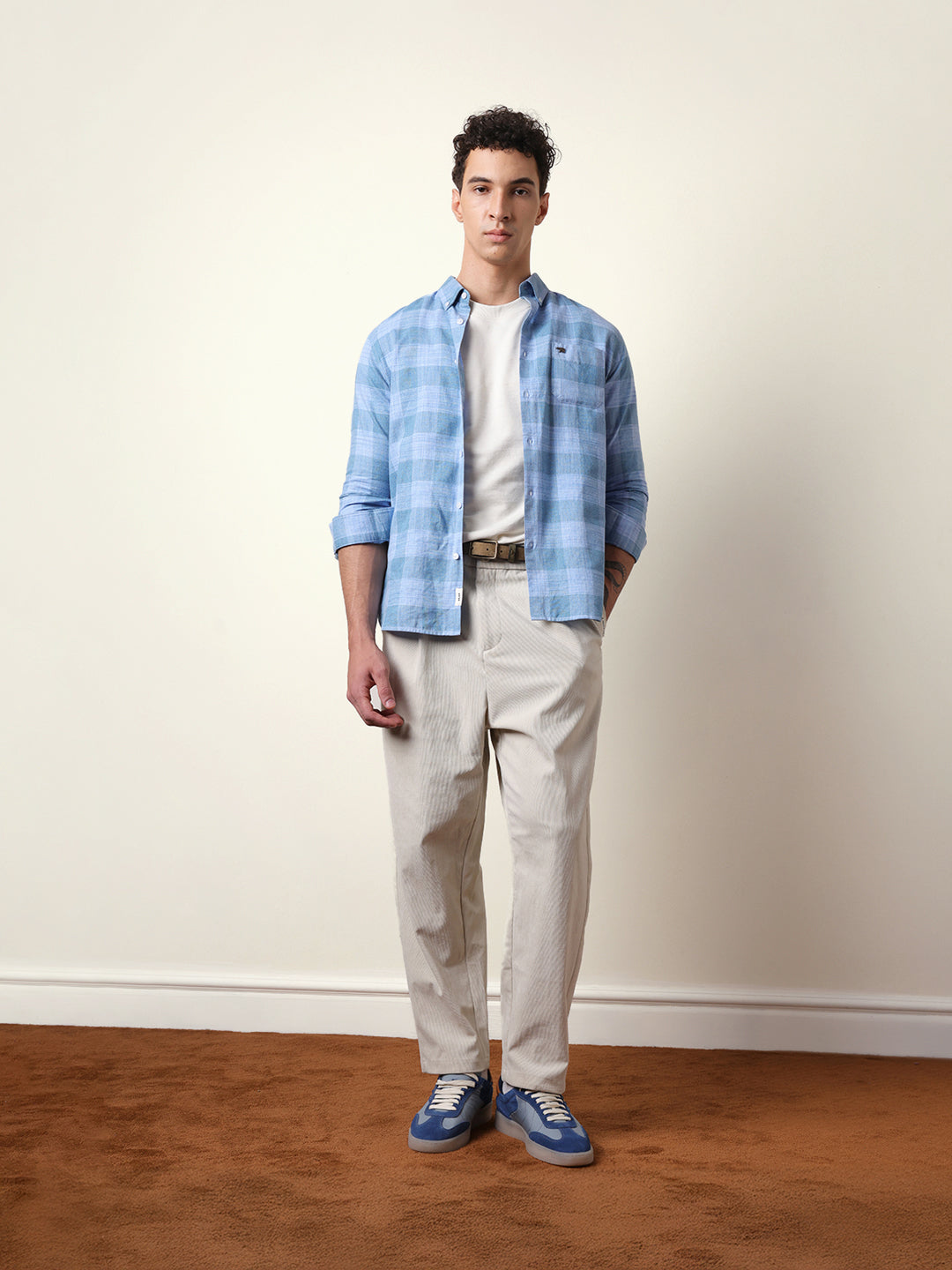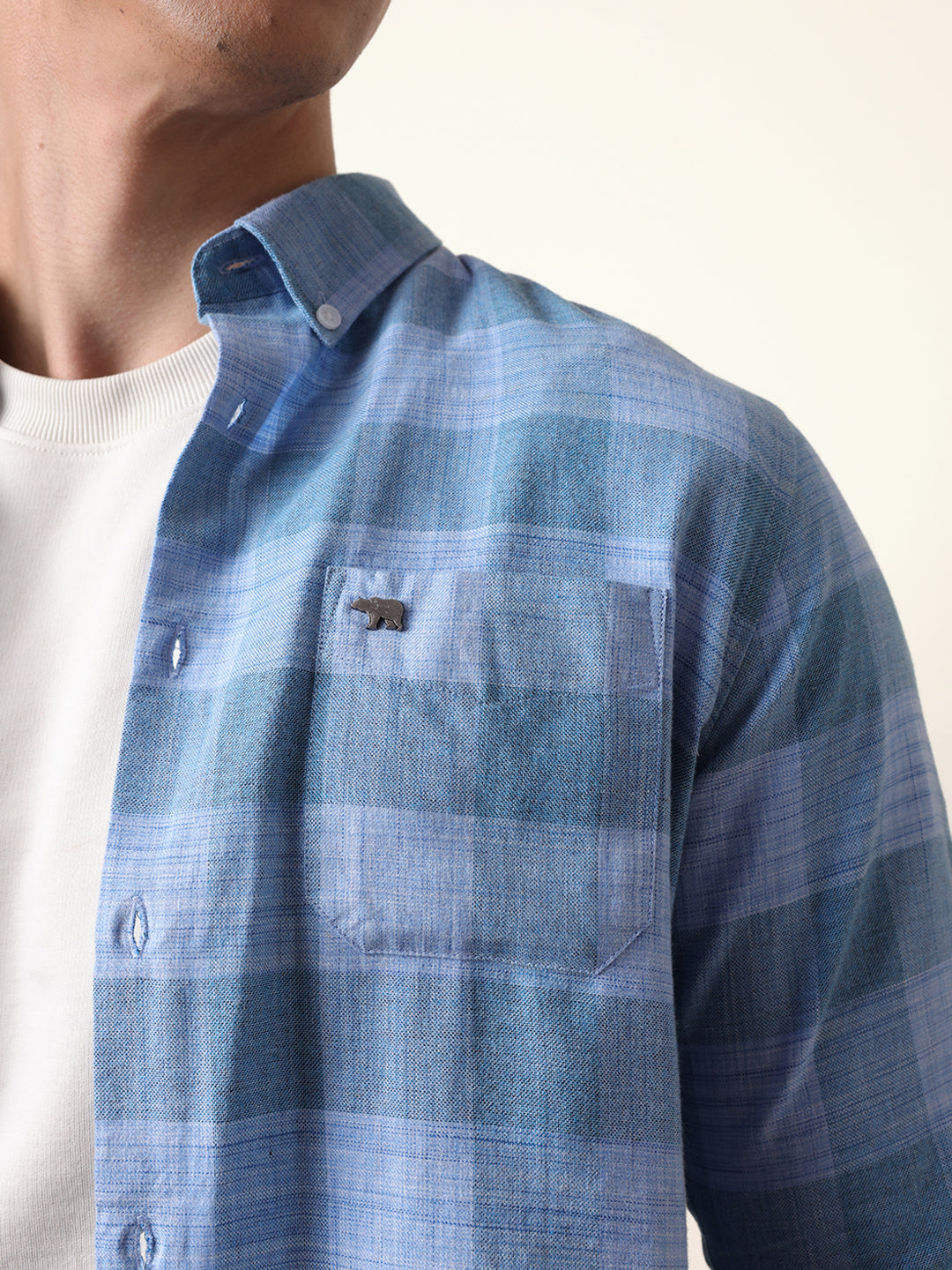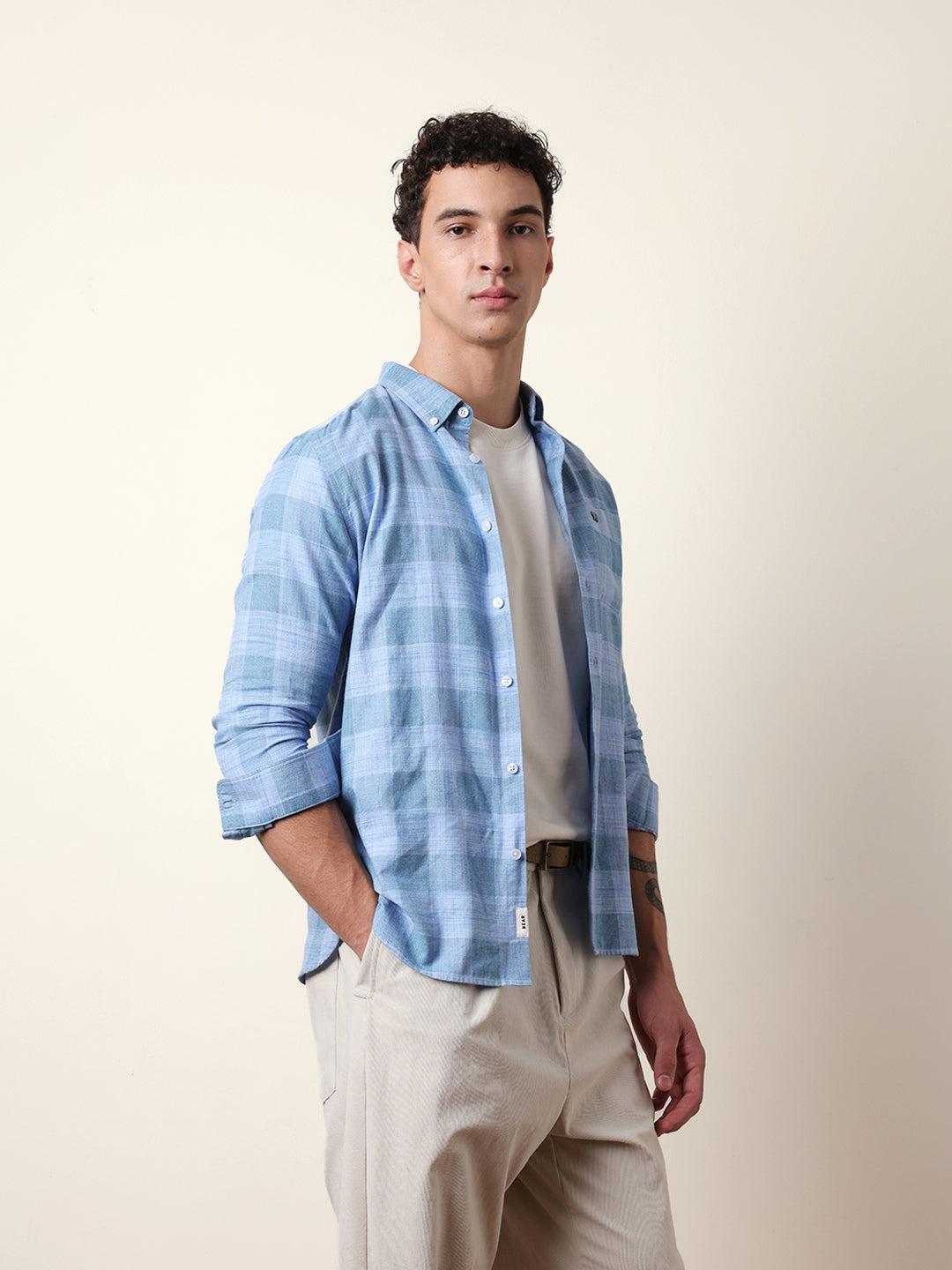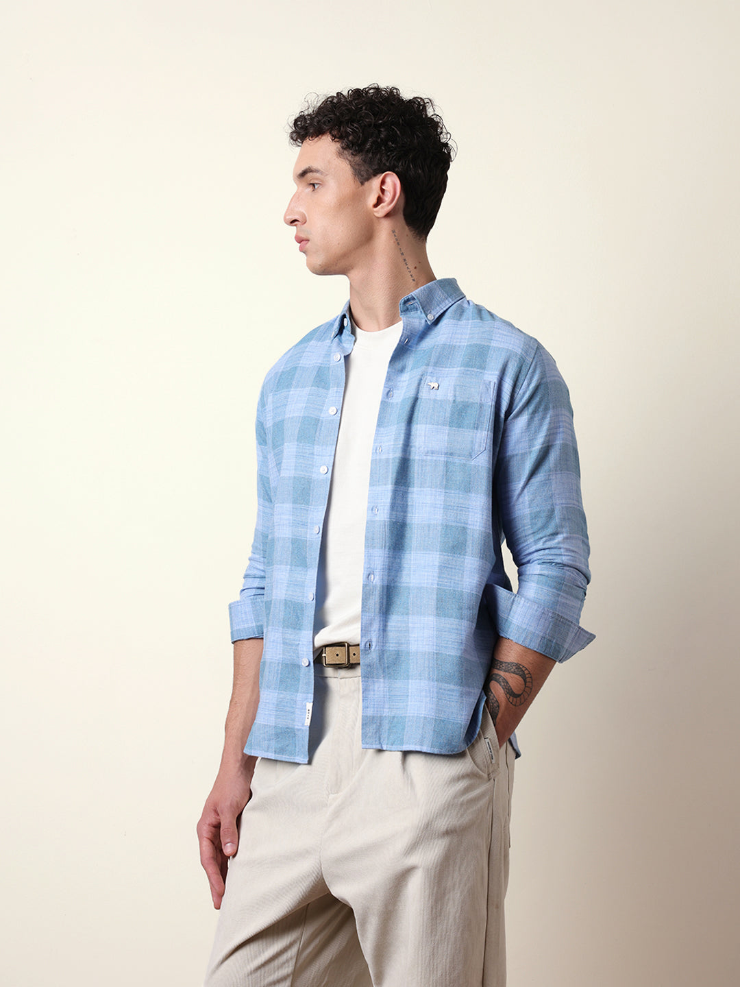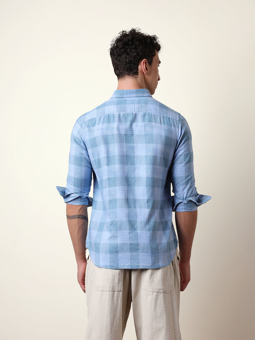 Blue Woven Tartan Checked Slim Fit Casual Shirt