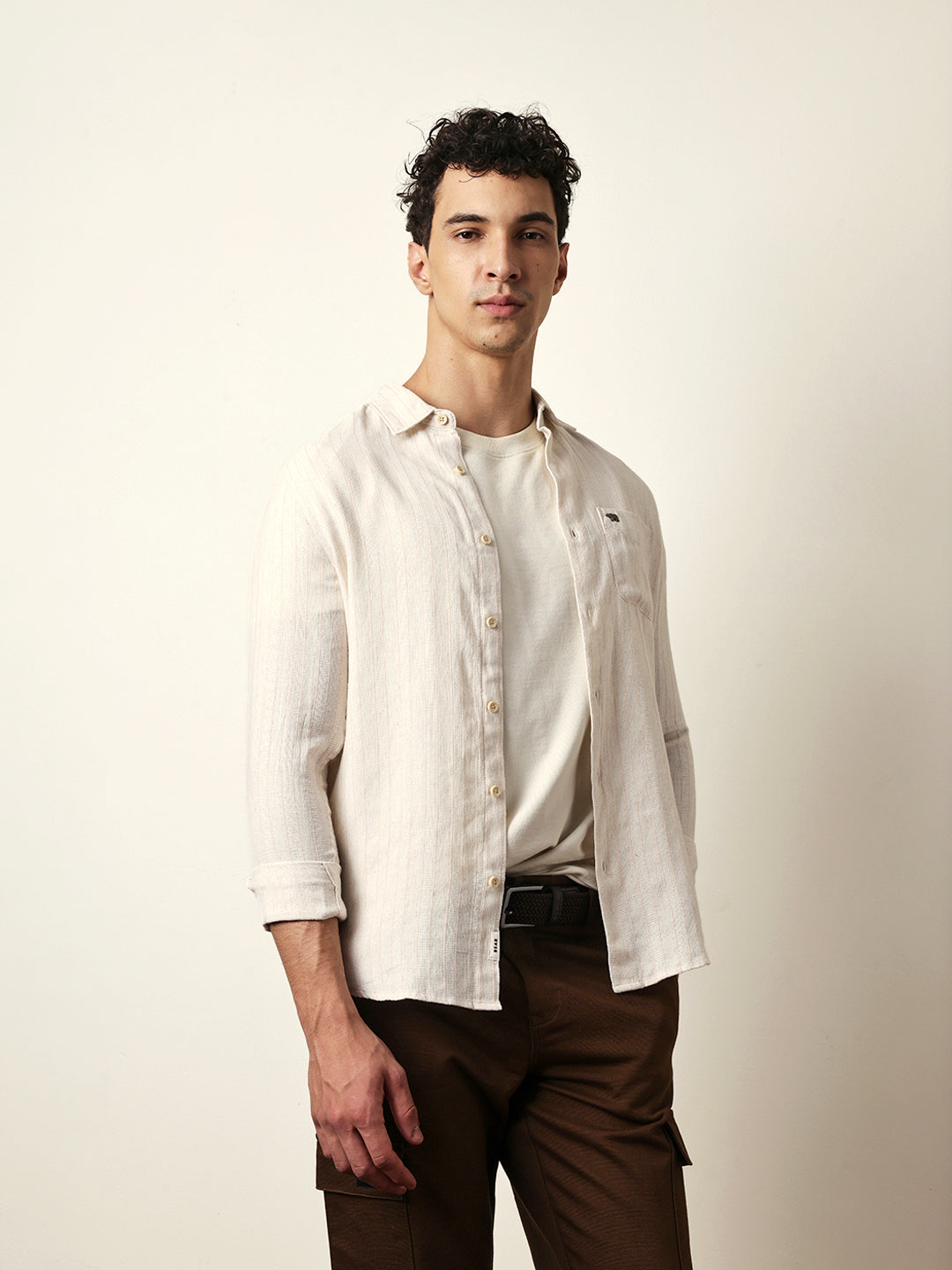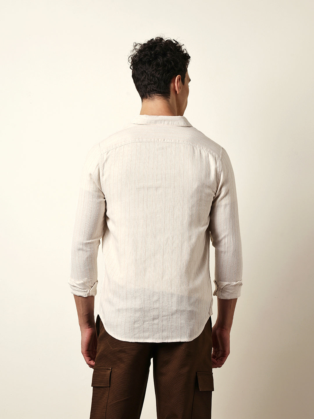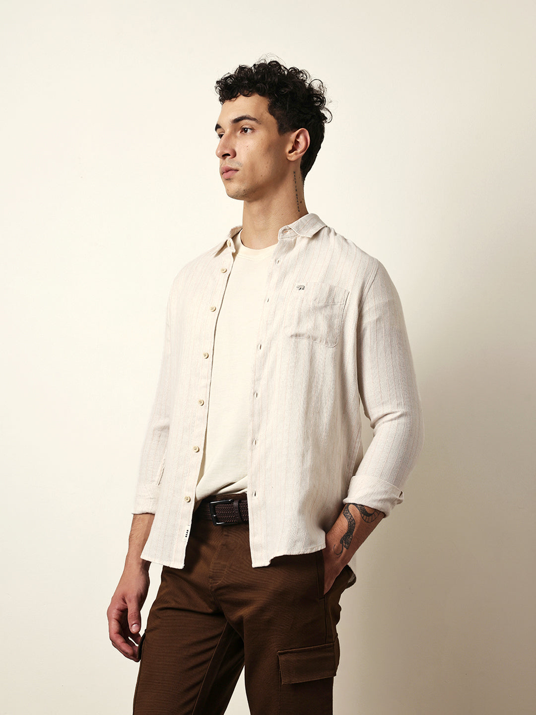 Cream Vertical Woven Stripe Slim Fit Casual Shirt