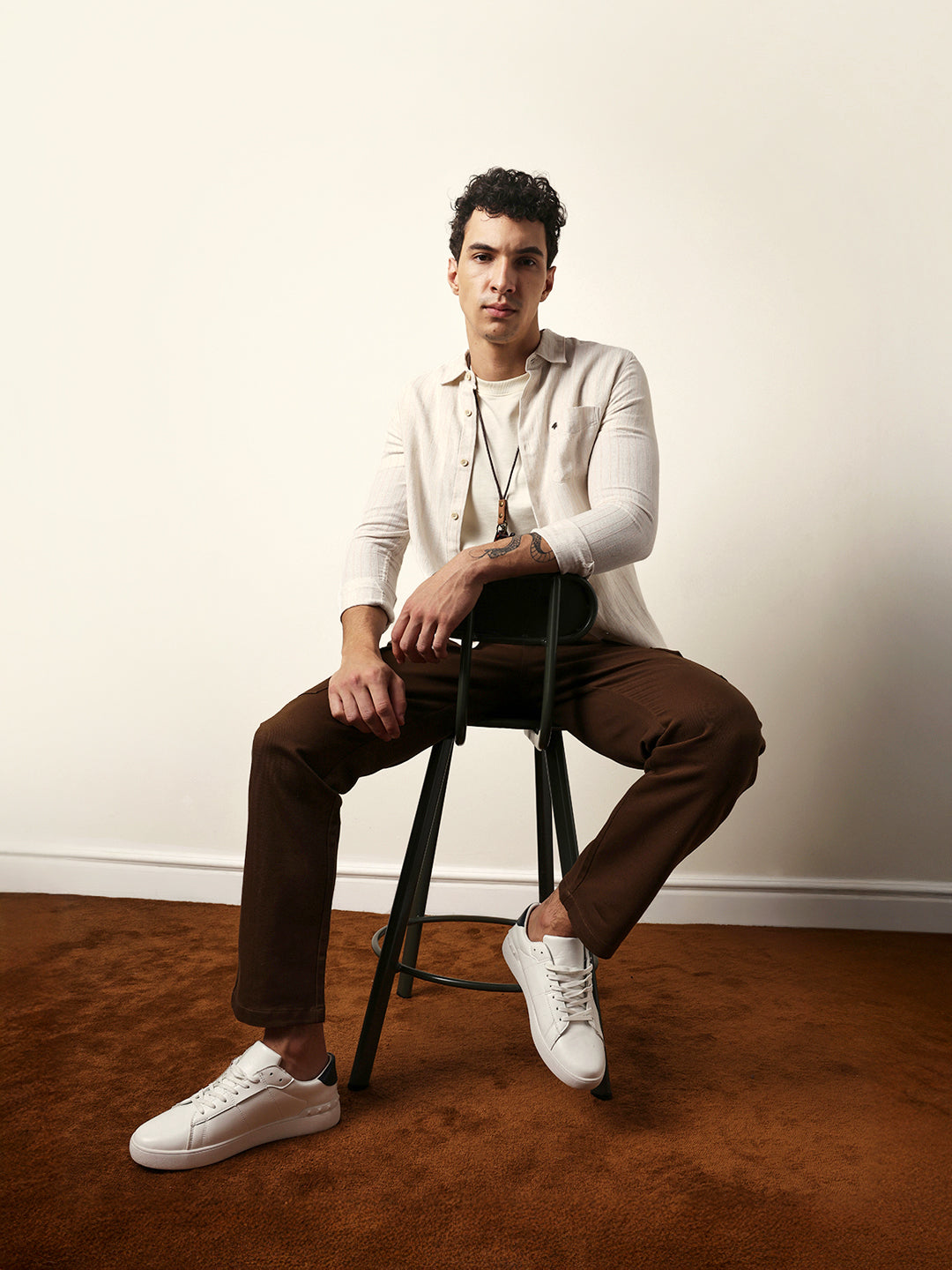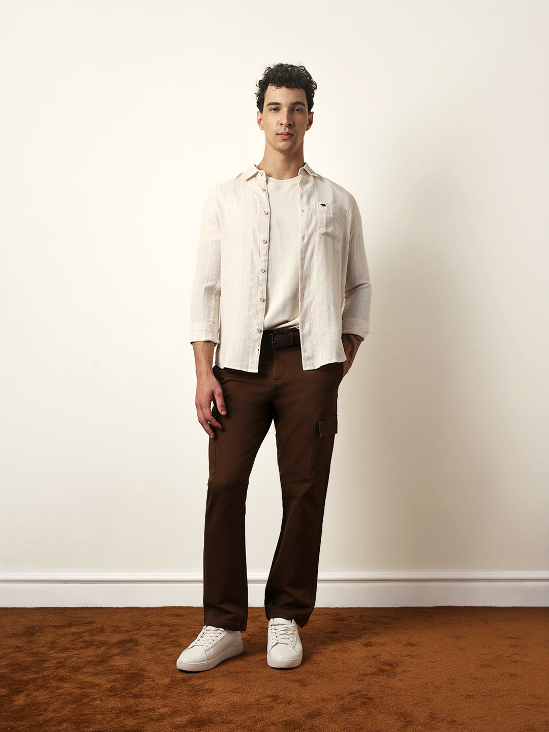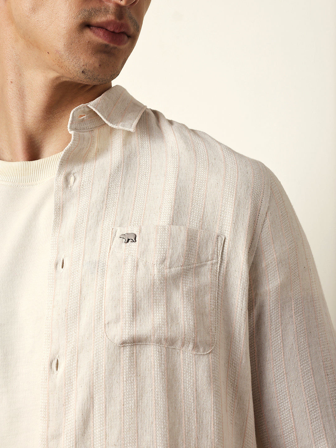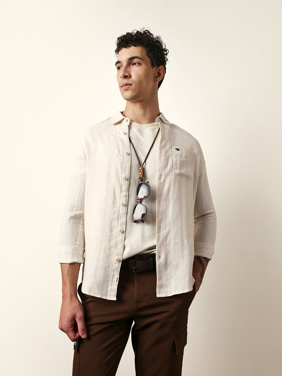 Cream Vertical Woven Stripe Slim Fit Casual Shirt