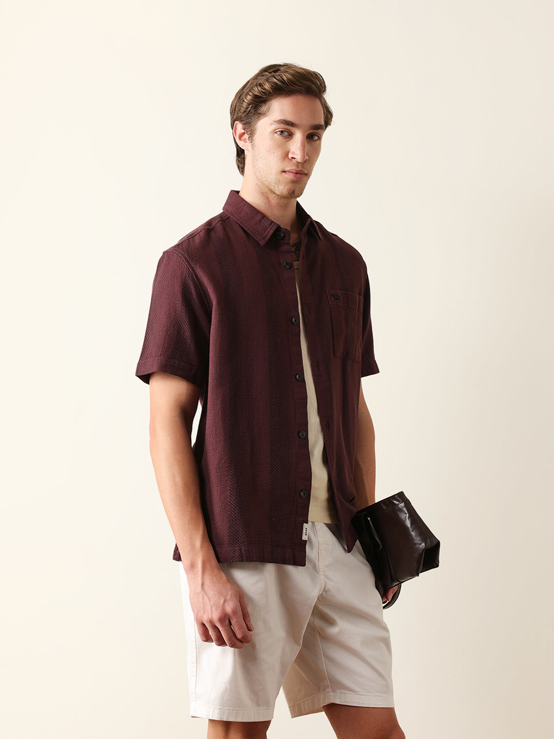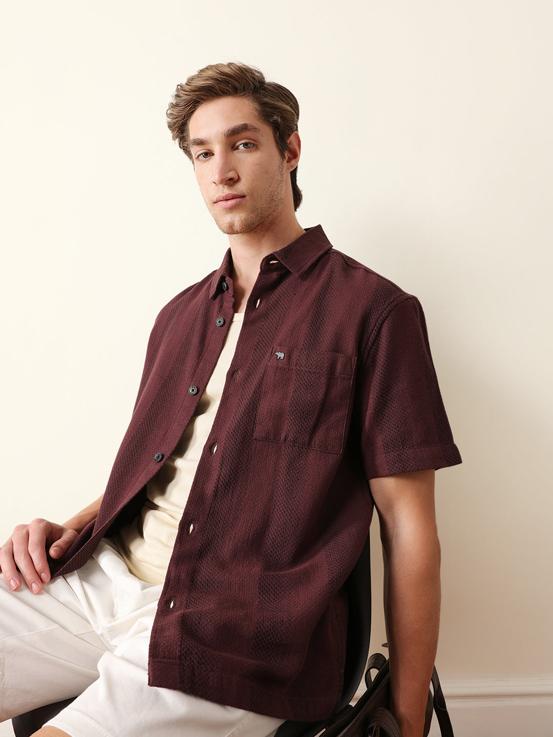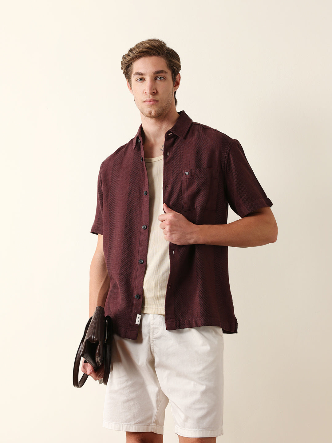 Shop Maroon Relaxed Fit Casual Half Sleeve Shirt with Textured Vertical Stripes Online.