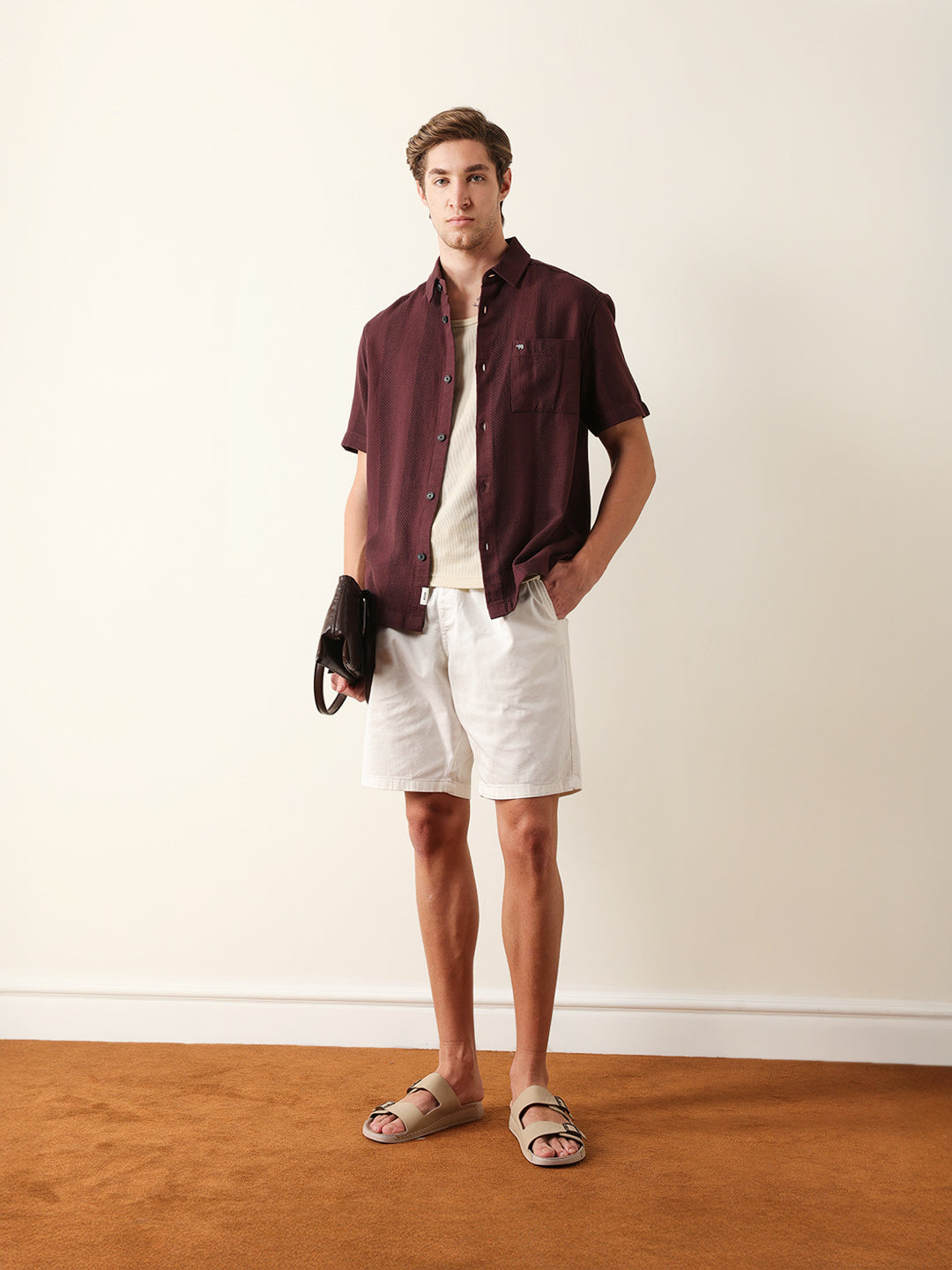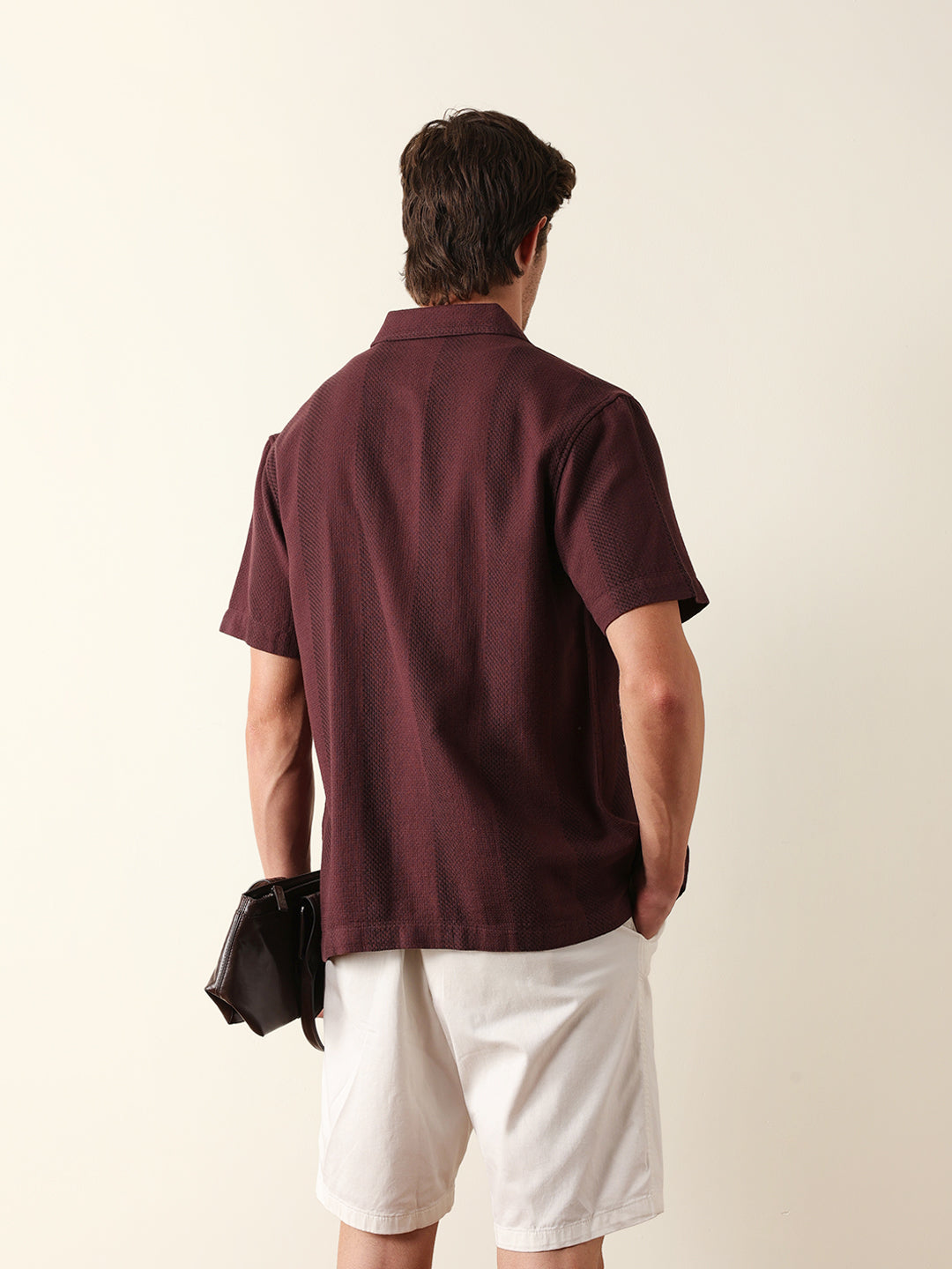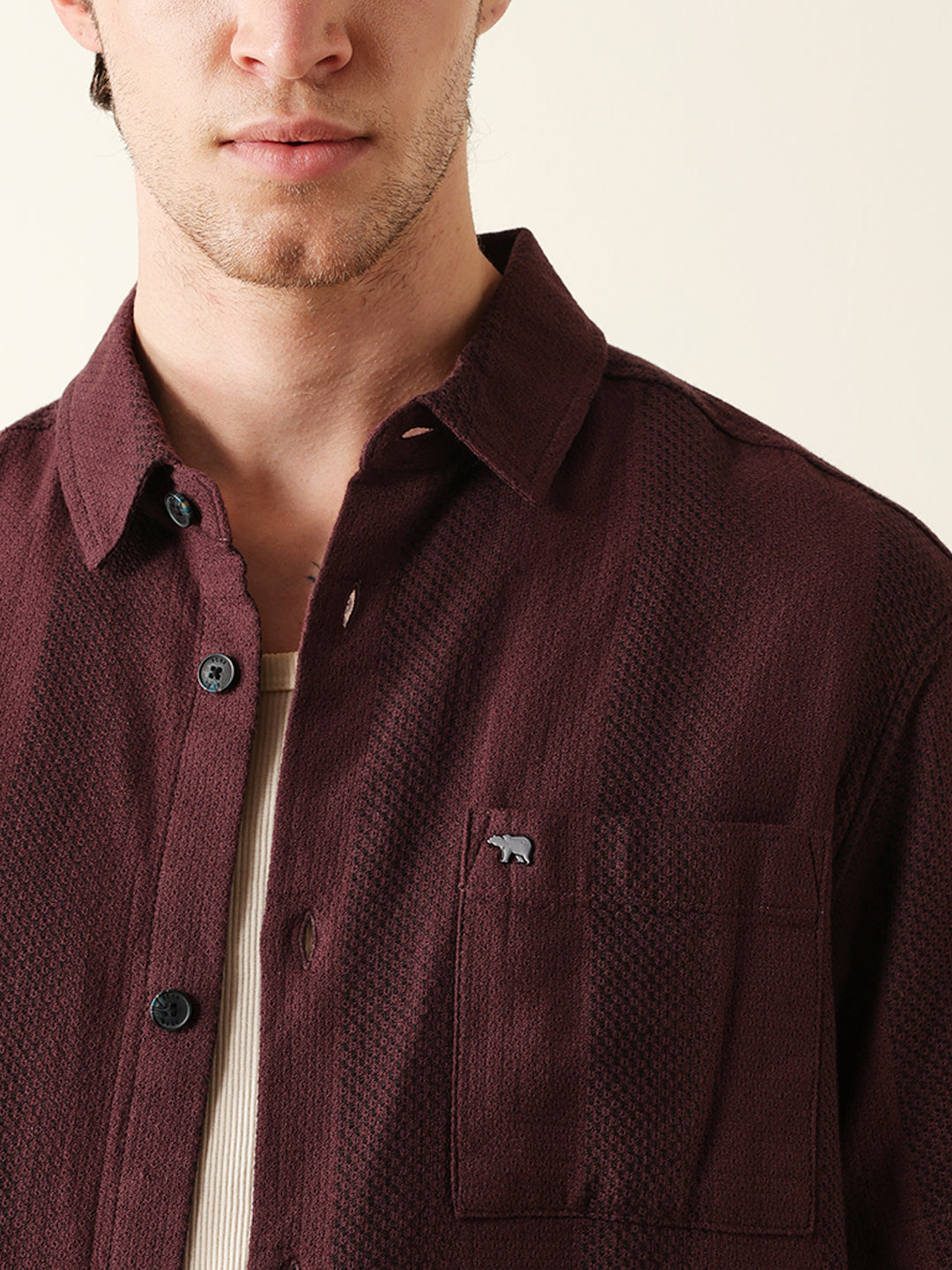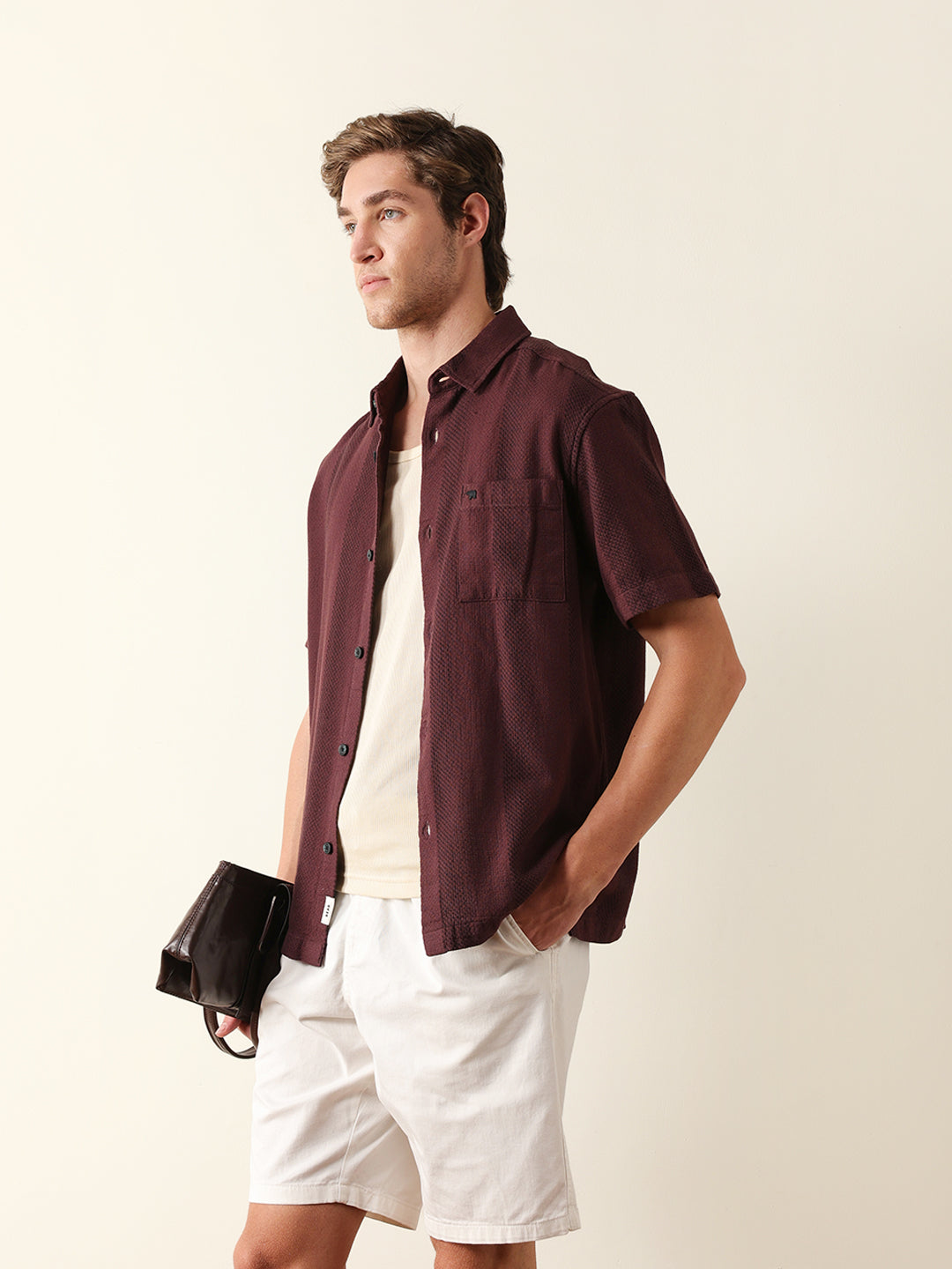 Shop Maroon Relaxed Fit Casual Half Sleeve Shirt with Textured Vertical Stripes Online.