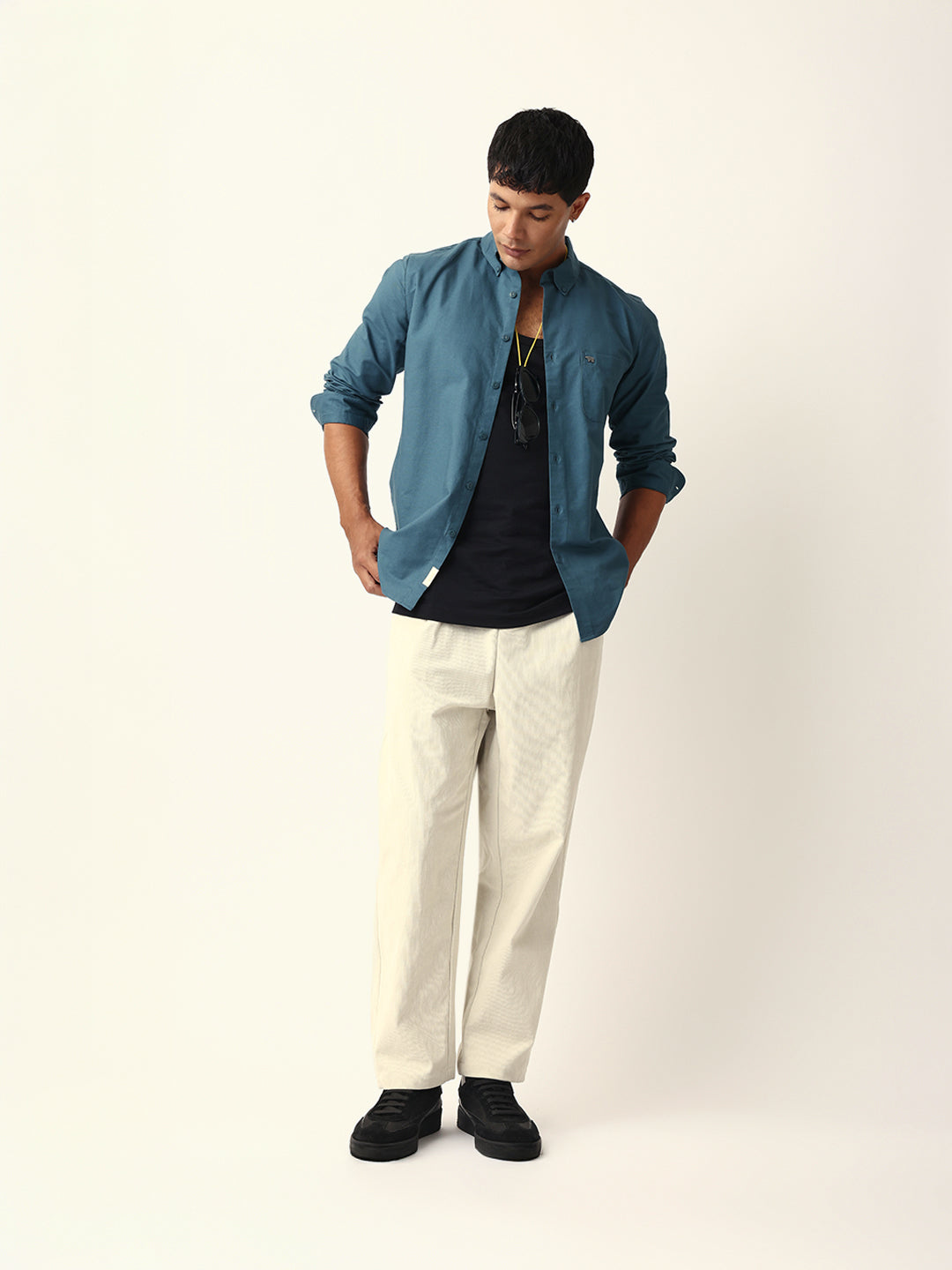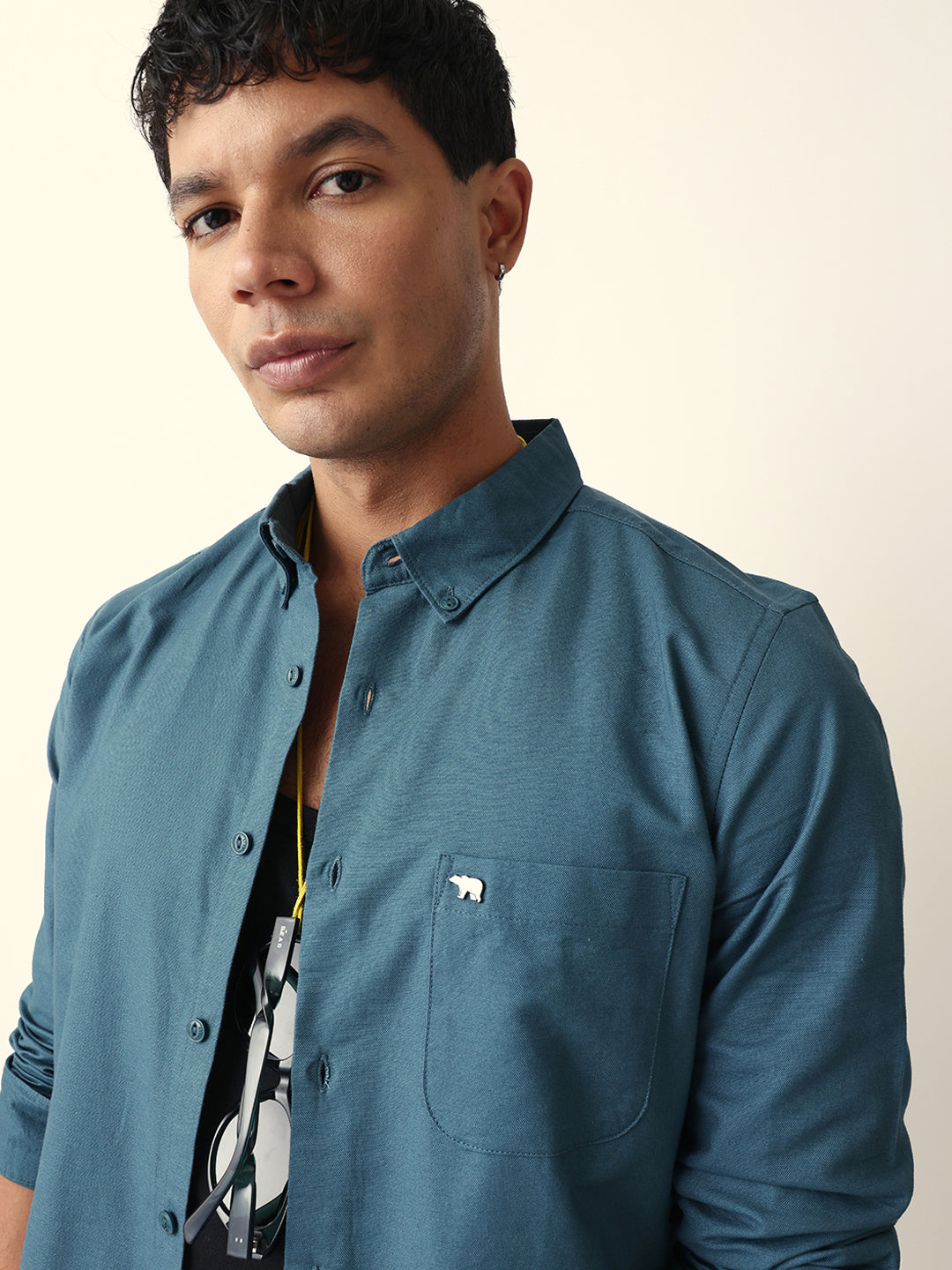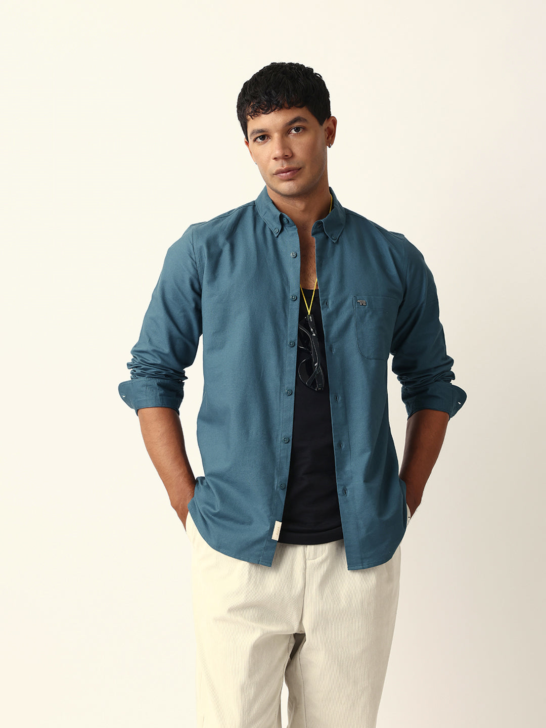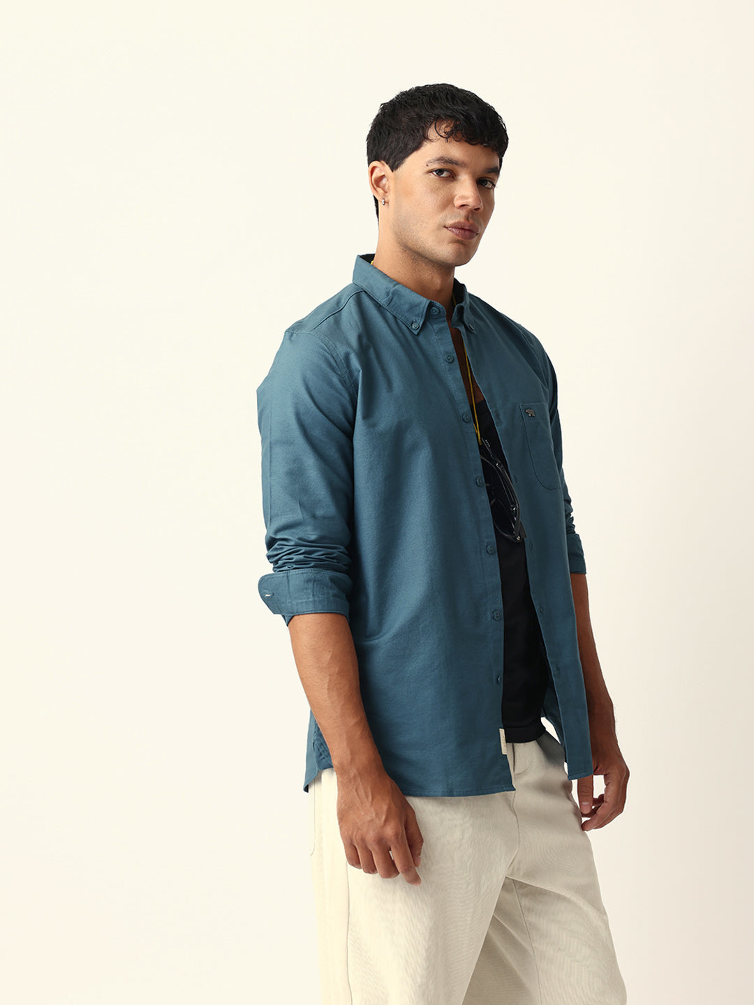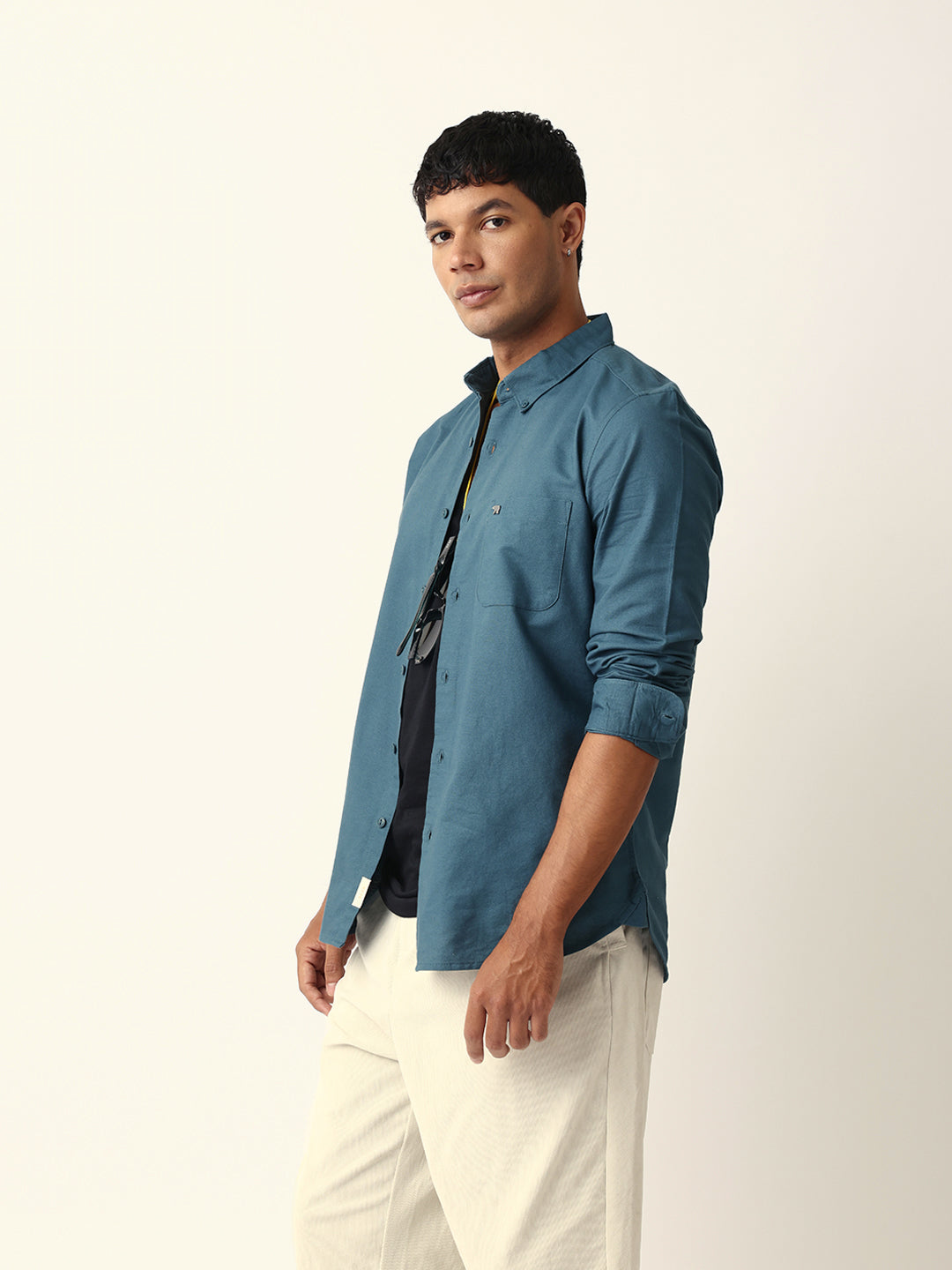 Teal Solid Slim Fit Casual Shirt with Button-Down Collar