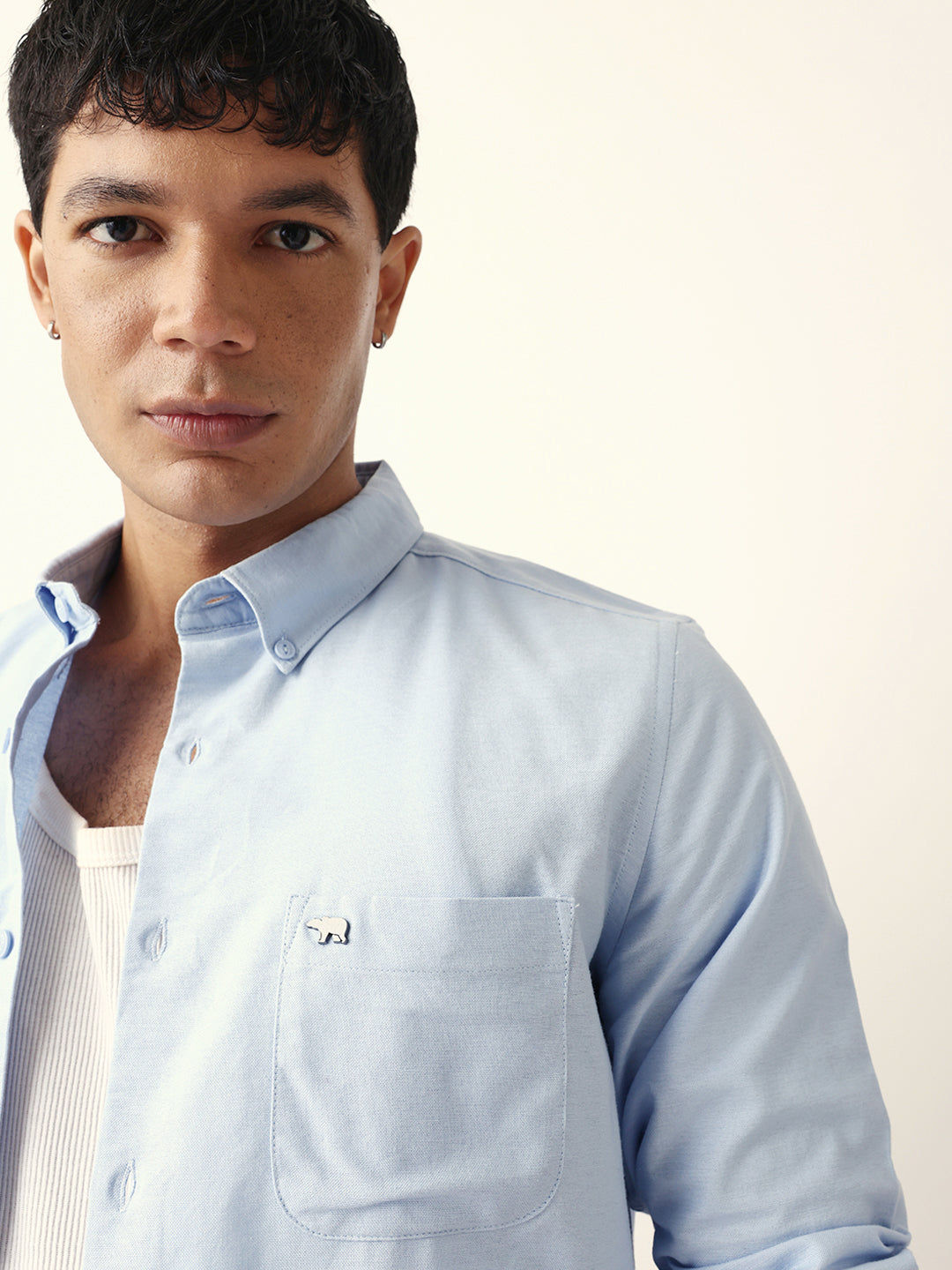 Light Blue Solid Slim Fit Casual Shirt with Button-Down Collar