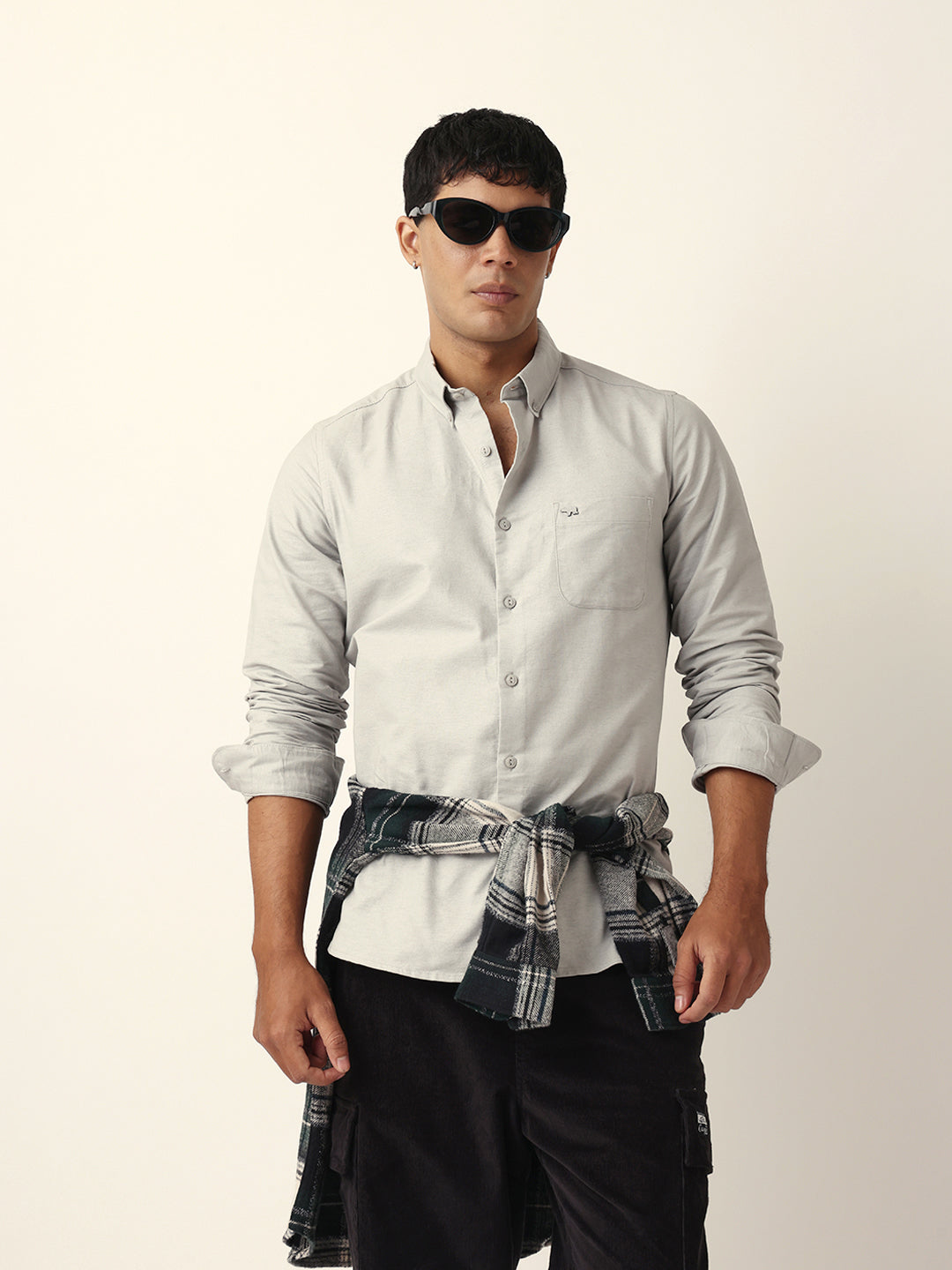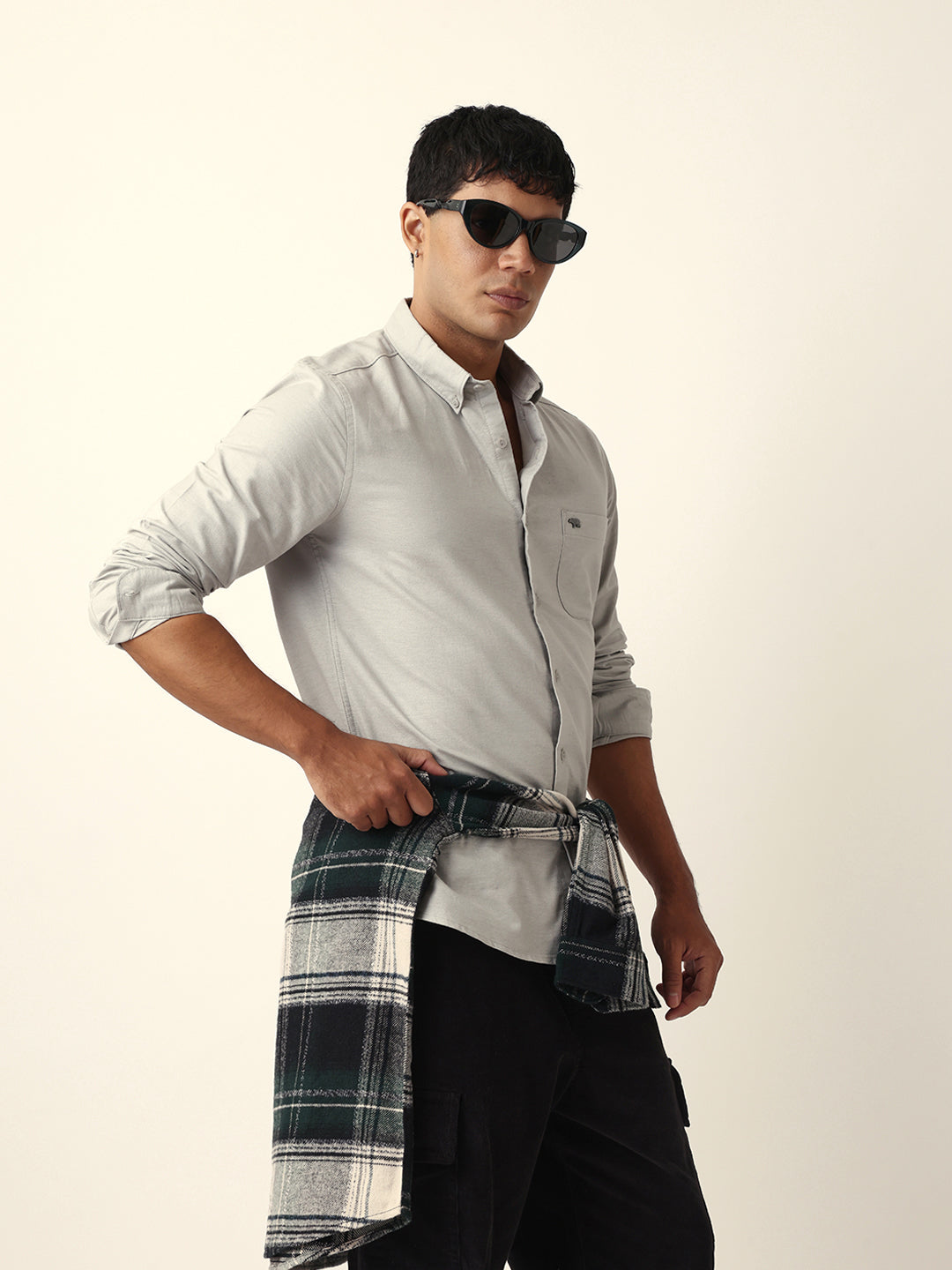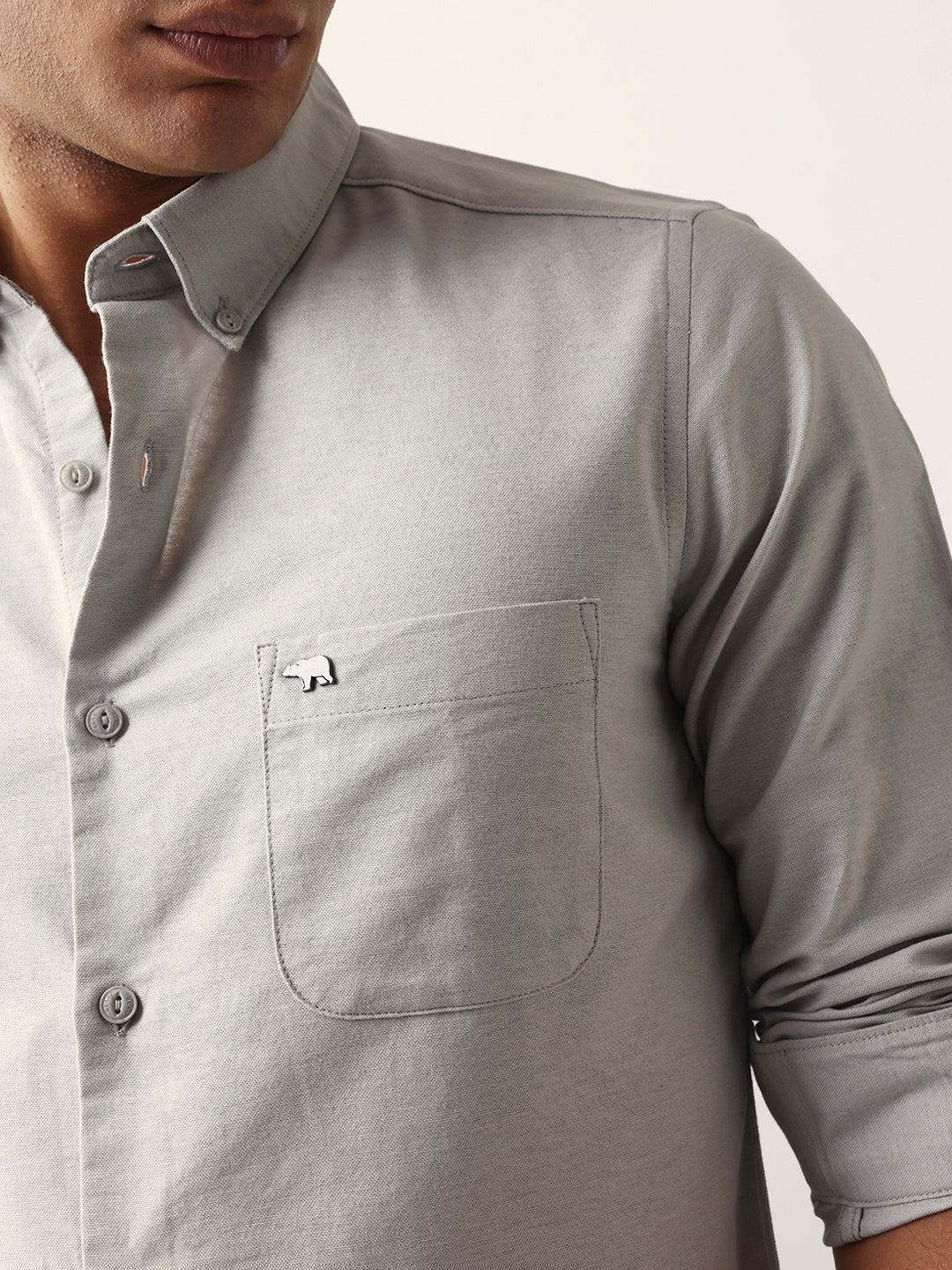 Grey Solid Cotton Slim Fit Casual Shirt with Button-Down Collar