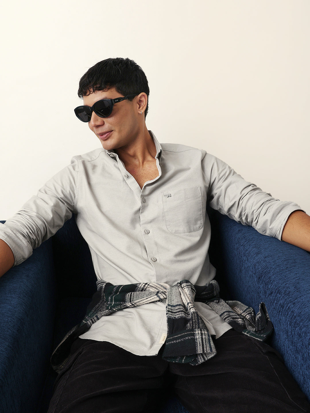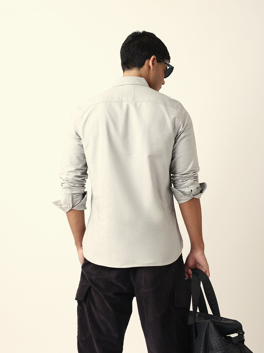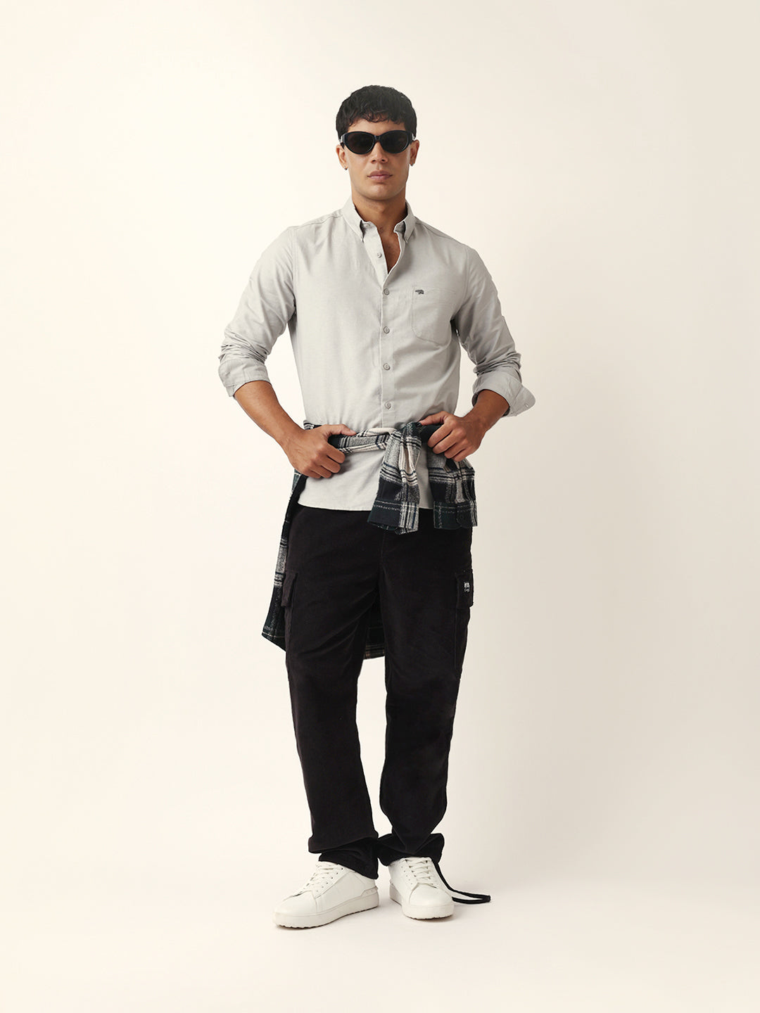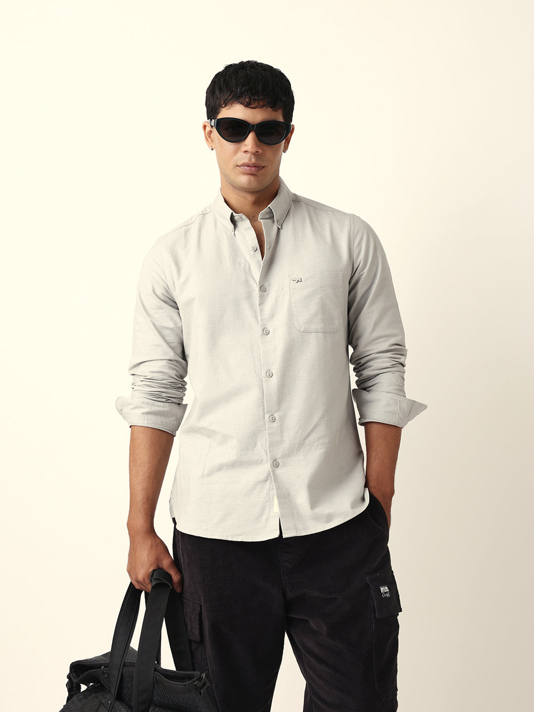 Grey Solid Cotton Slim Fit Casual Shirt with Button-Down Collar