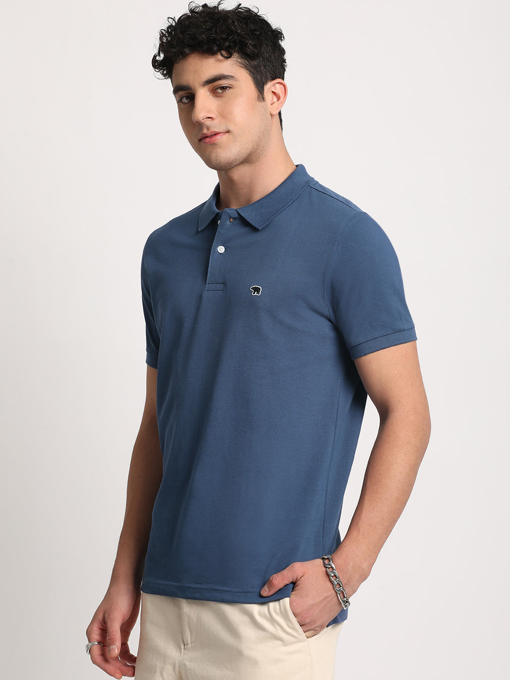 Men Blue Solid Slim Fit Polo Collar T-shirt