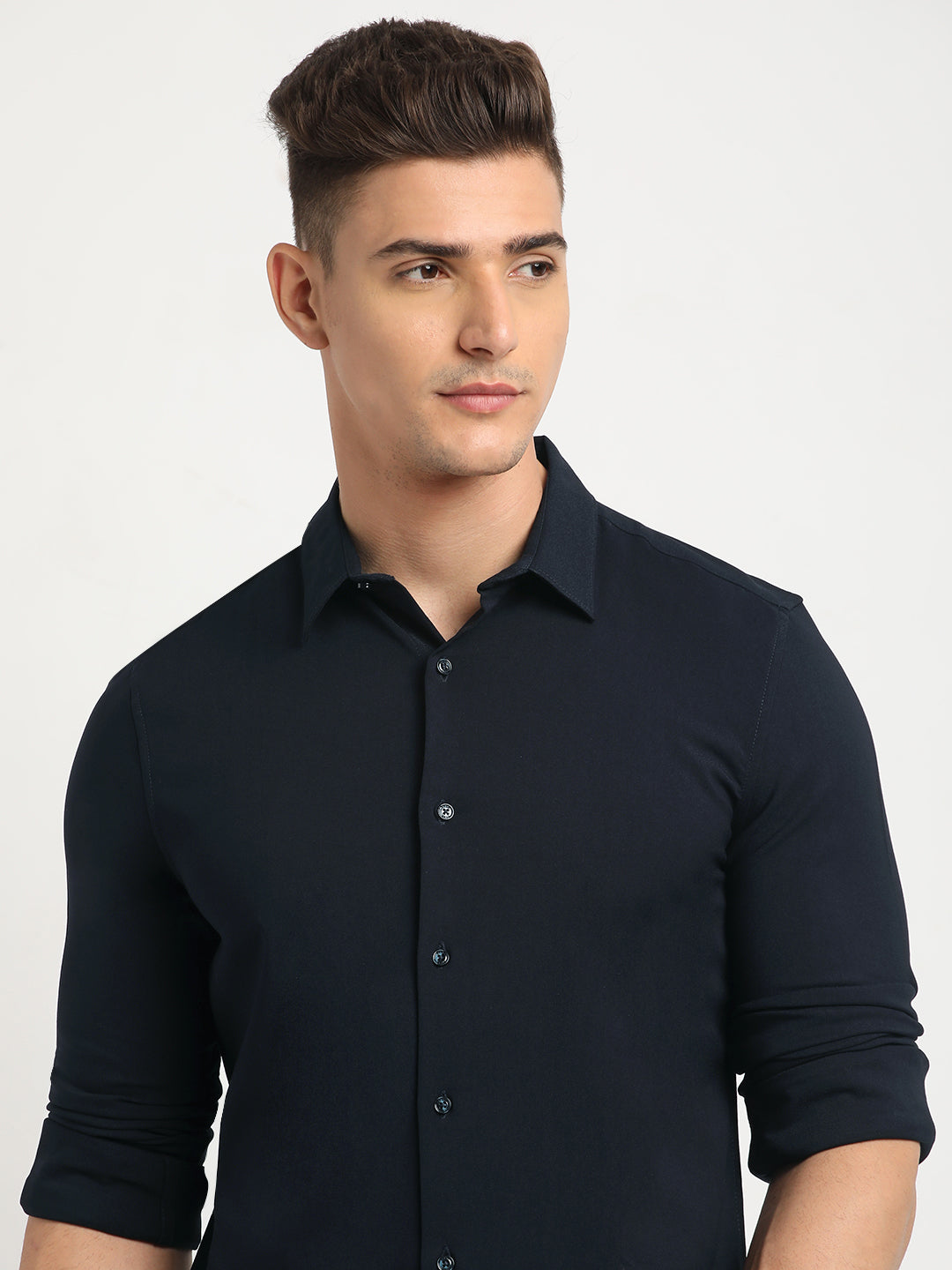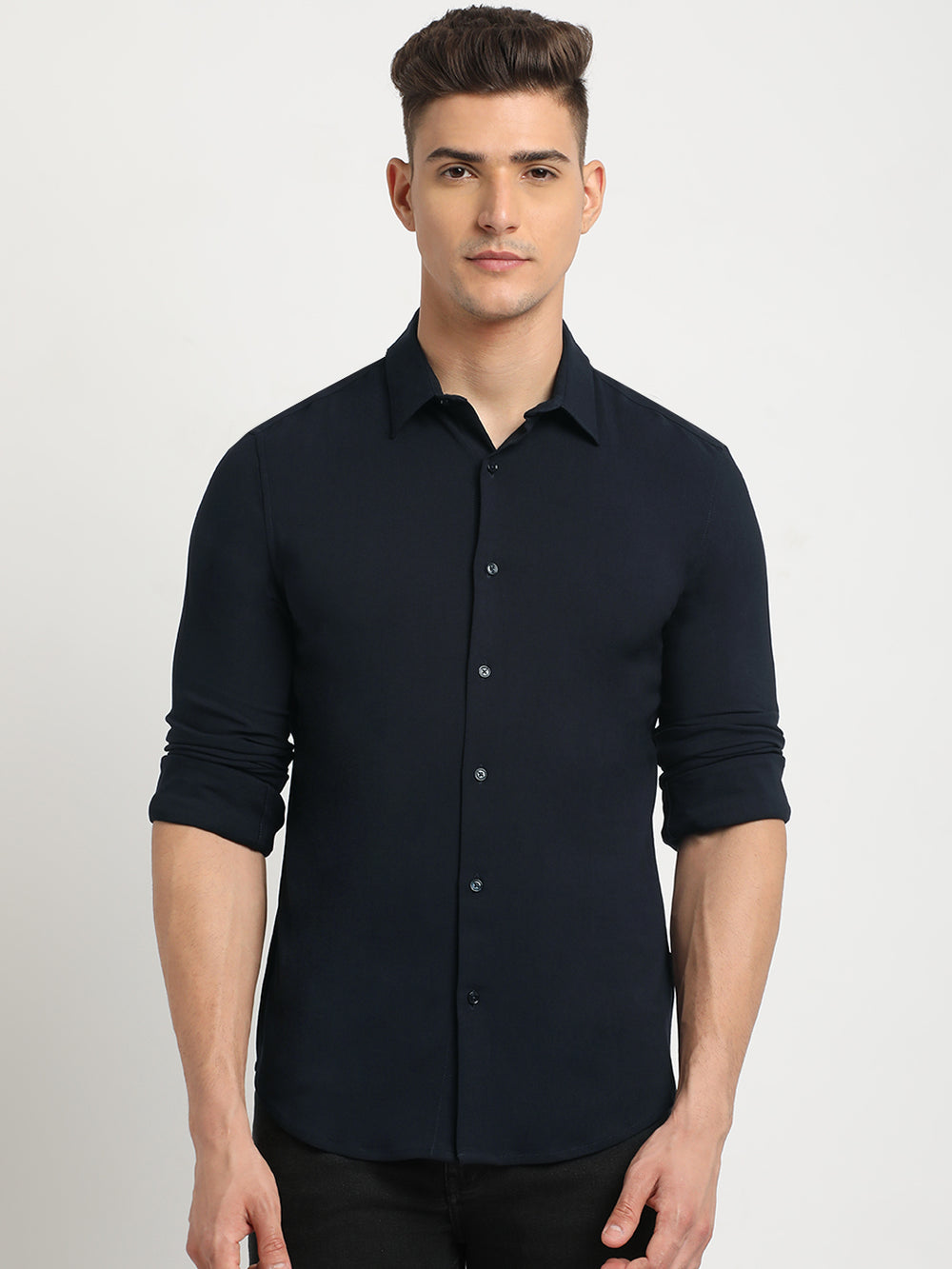 Shop Men Navy Solid Slim Fit Casual Shirt Online.