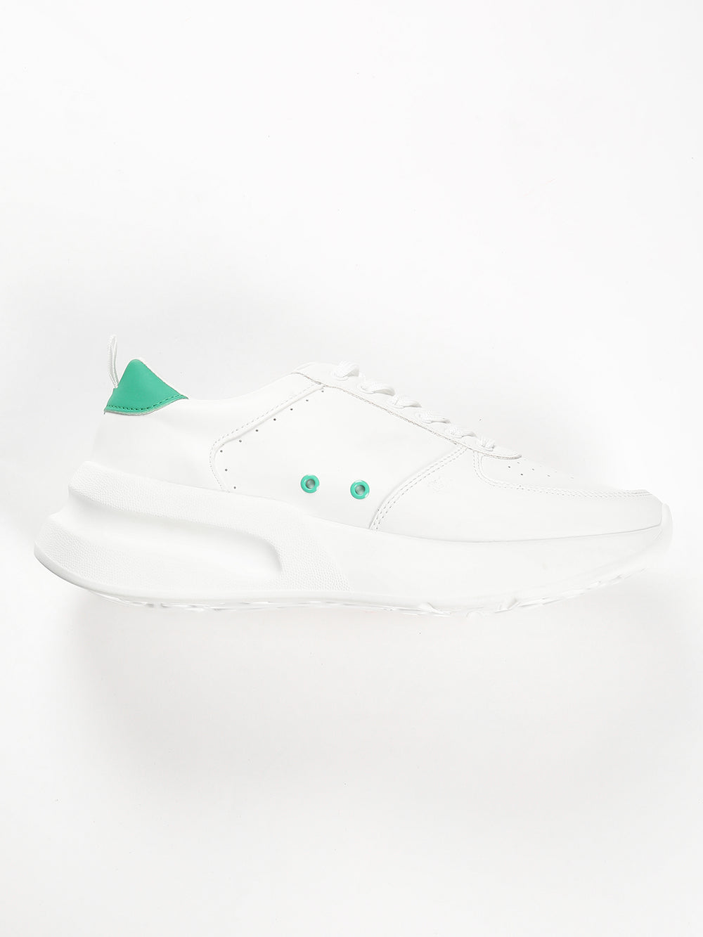 This classic white sneakers with a perforated toe and other design elements such as green detailing on the sides and contrast back panel with a durable finish offers a good grip thanks to its comfortable sole.