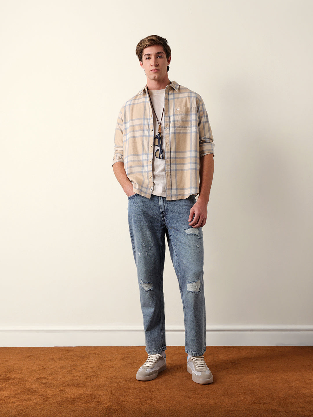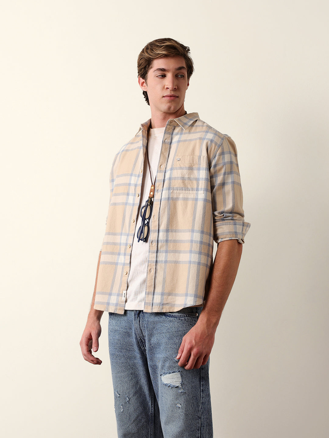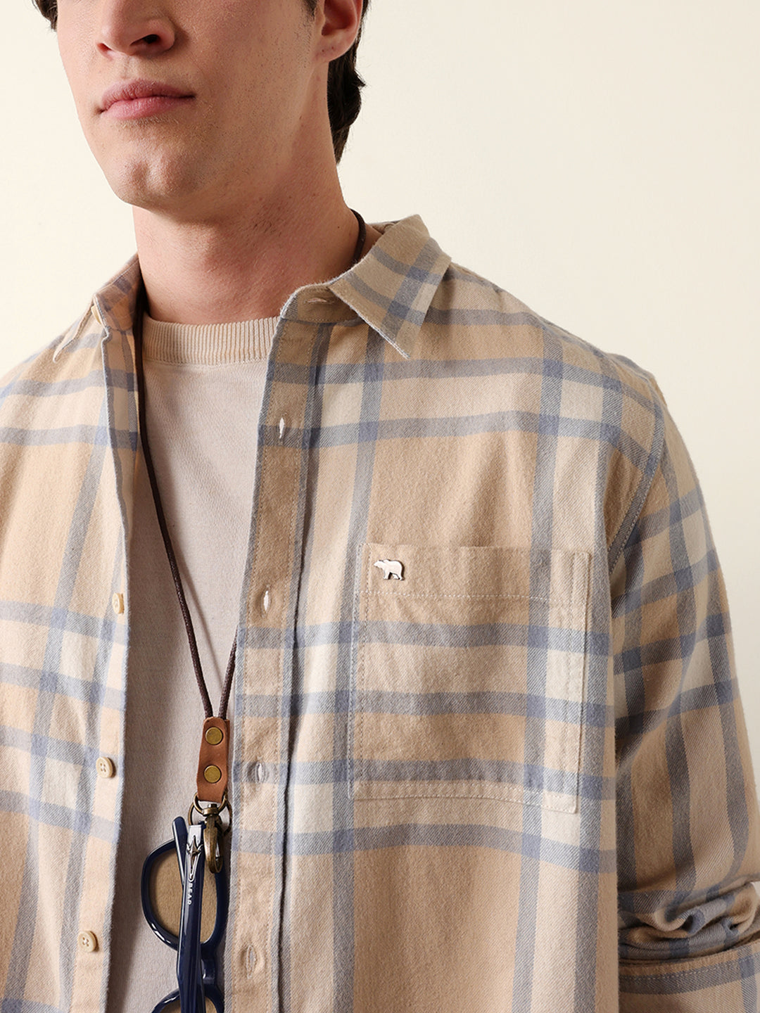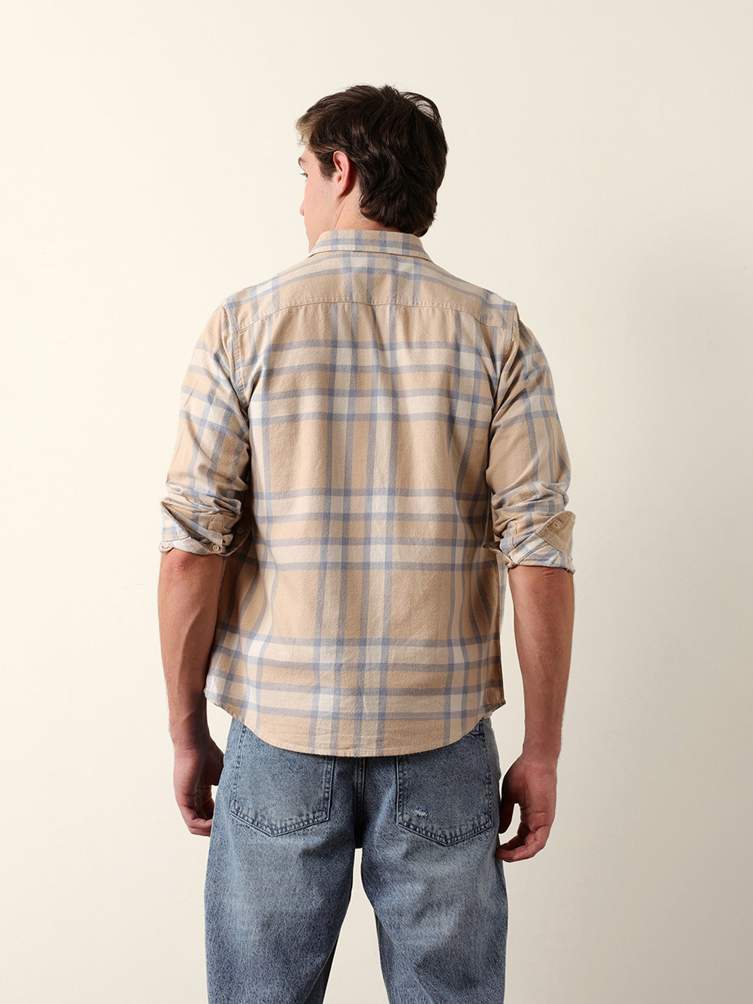 Beige & Blue Regular Fit Checked Flannel Casual Shirt