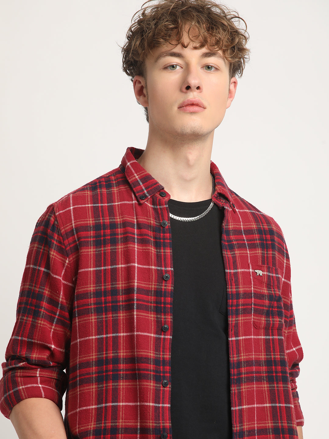 Men Red Checked Slim Fit Flannel Cotton Casual Shirt